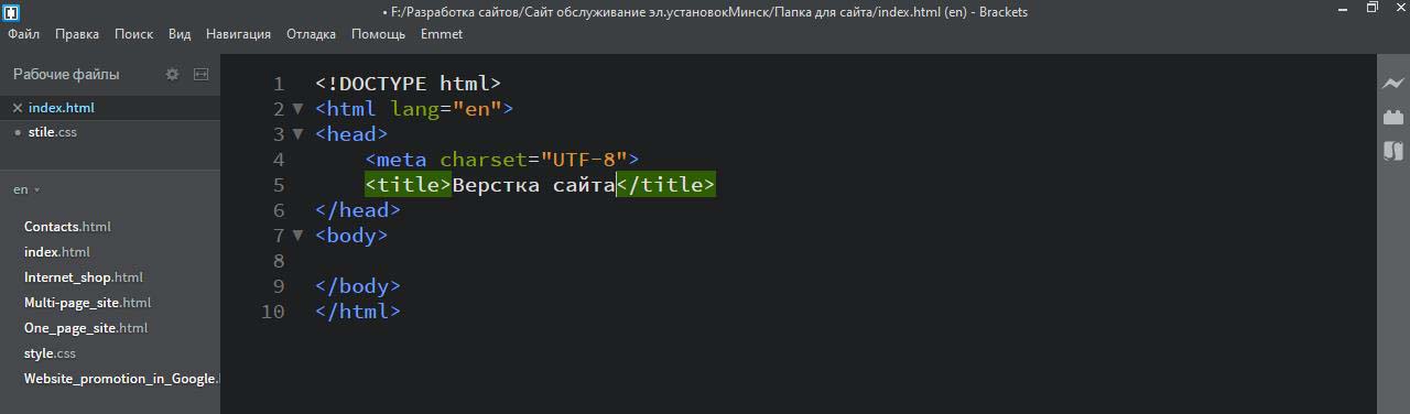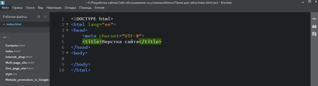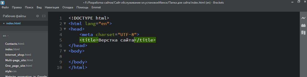 Между тегами title напишем заголовок страницы. Исправим сгенерированный плагином заголовок Document на более подходящий, "Верстка сайта".