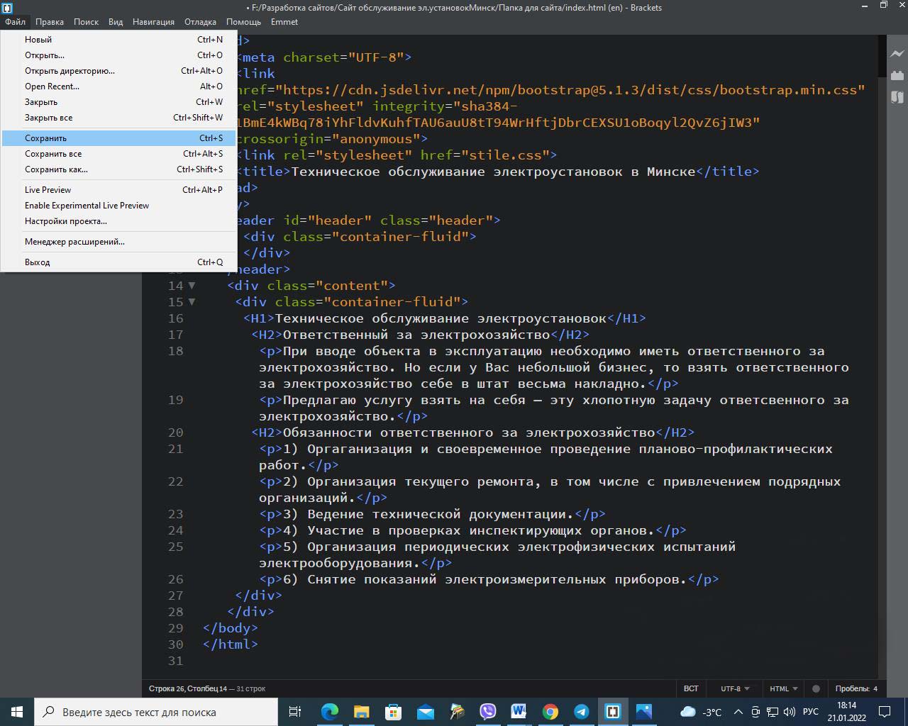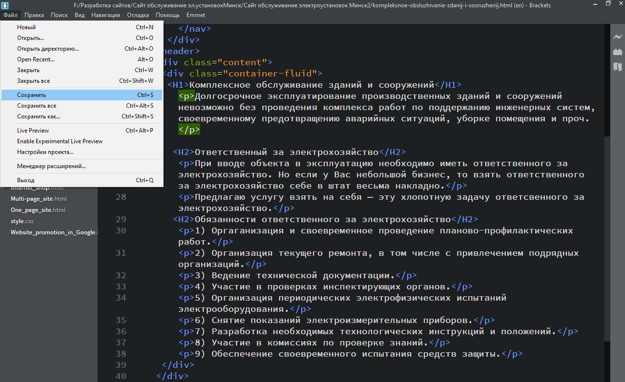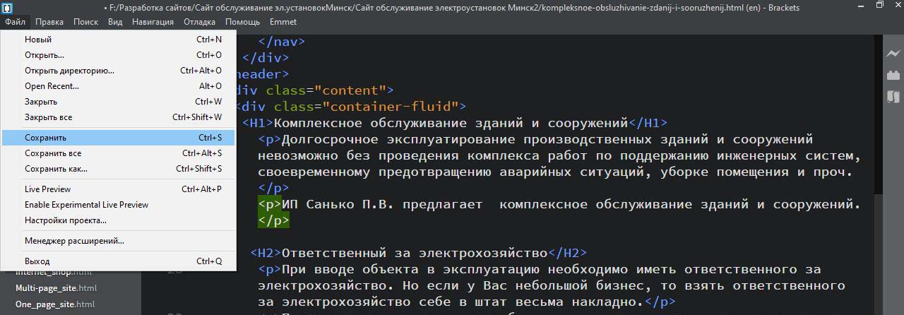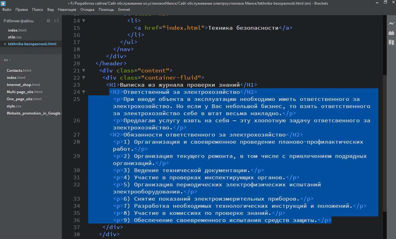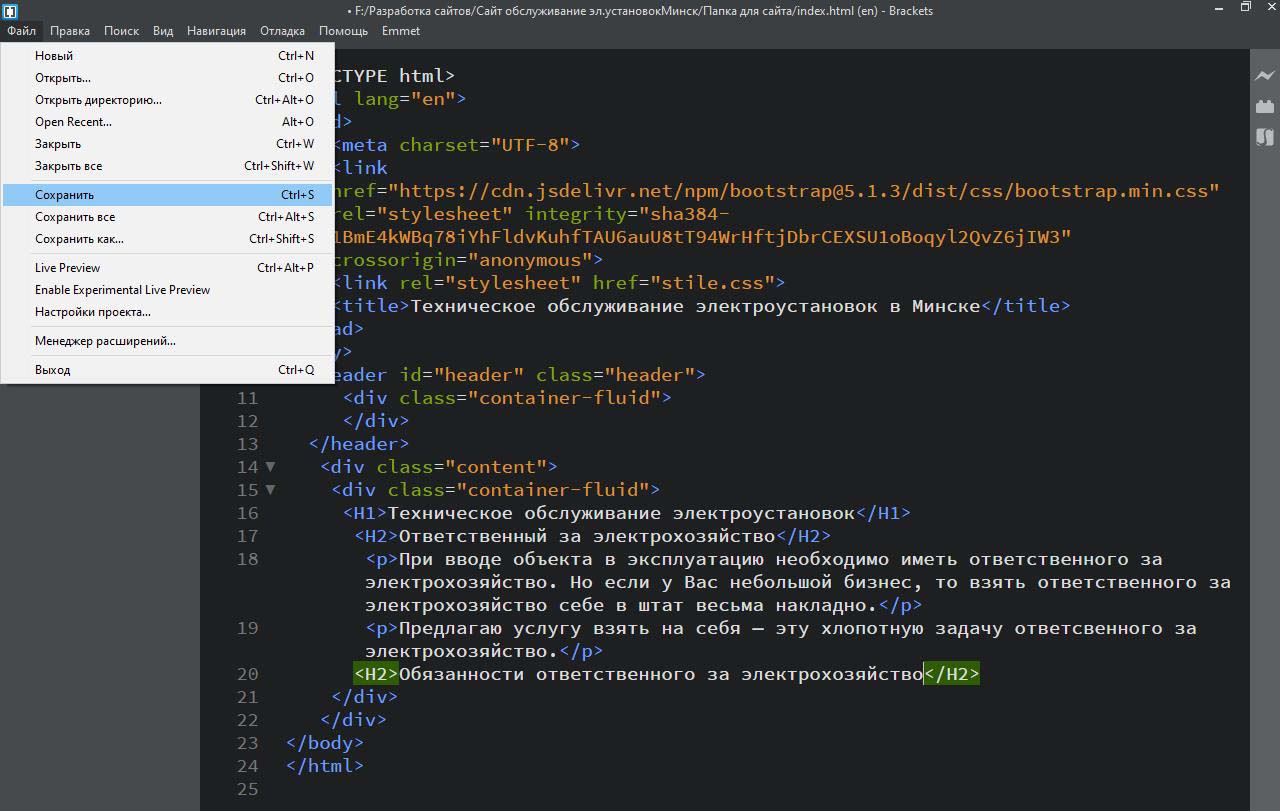 В файле index.html между тегами H2 прописываем подзаголовок "Ответственный за электрохозяйство". Жмем сохранить.