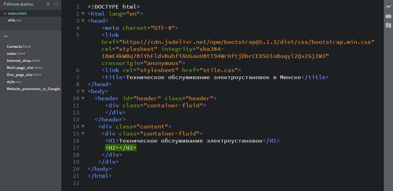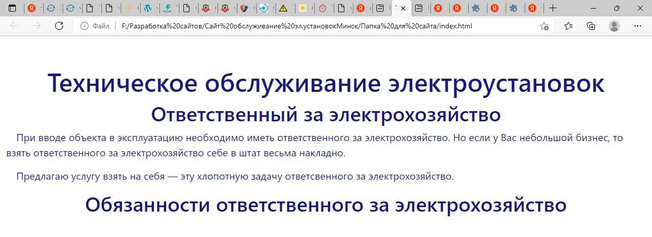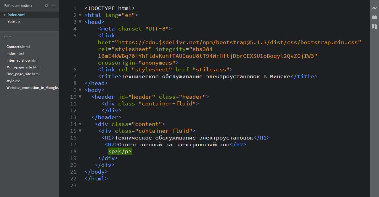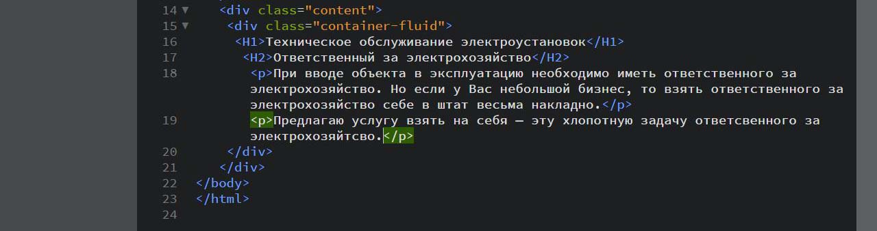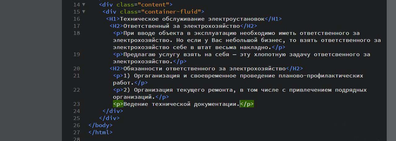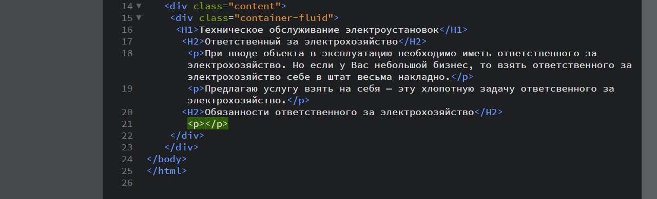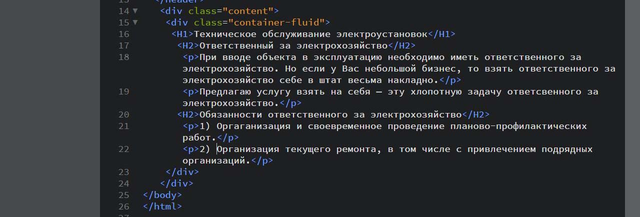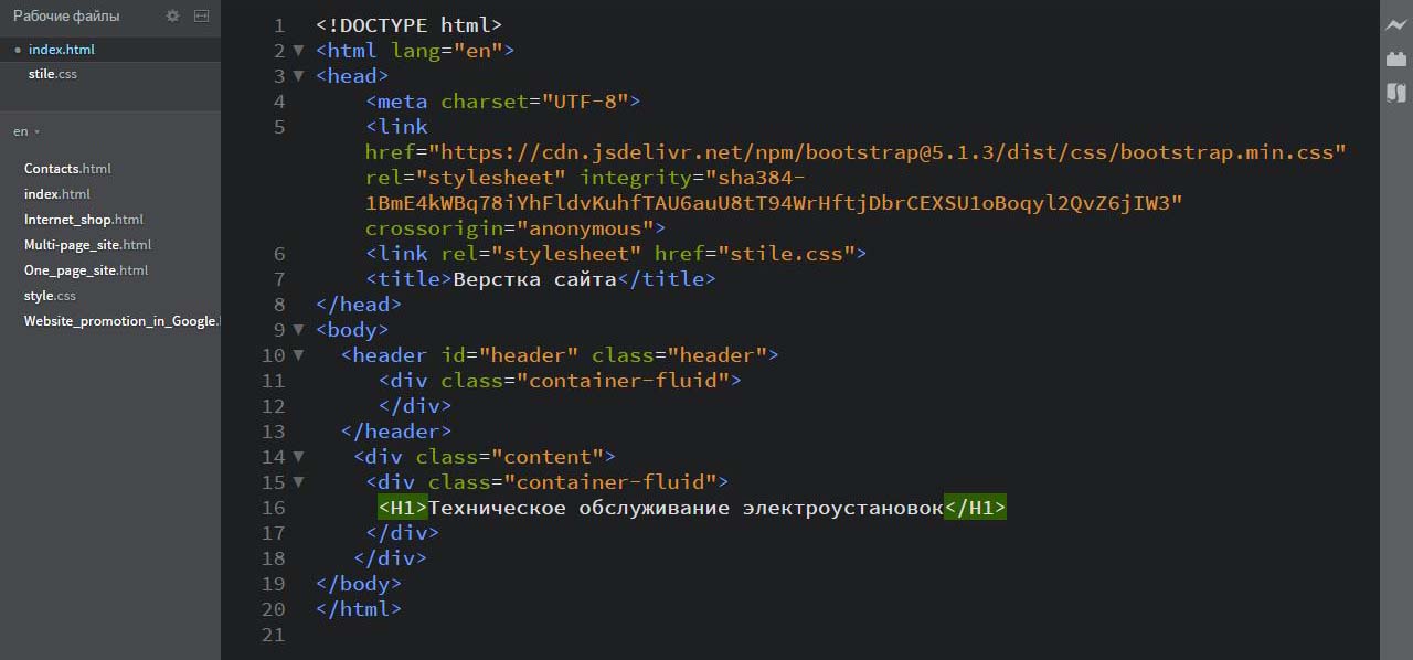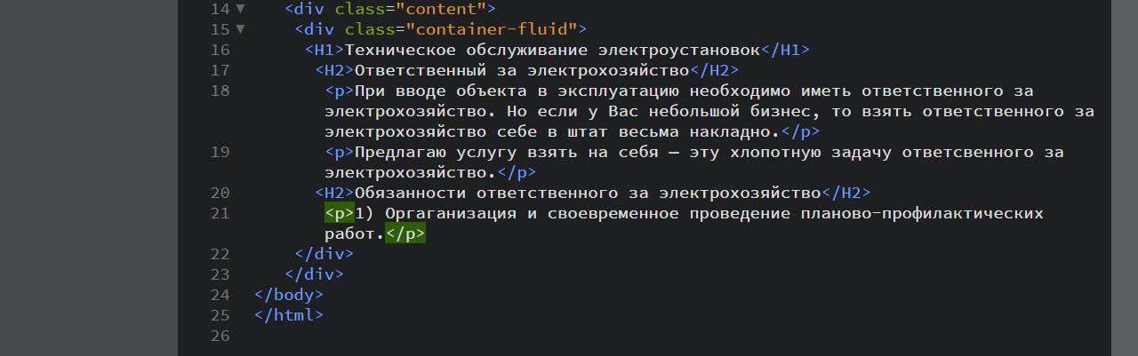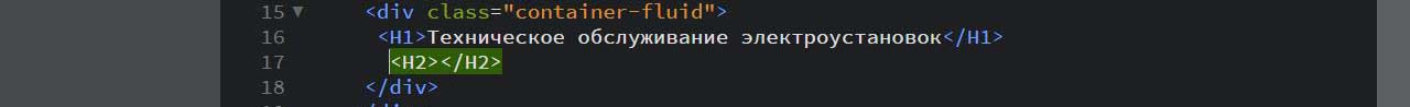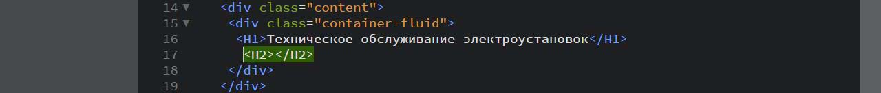 В файле index.html между тегами H1 пропишем заголовок страницы "Техническое обслуживание электроустановок".