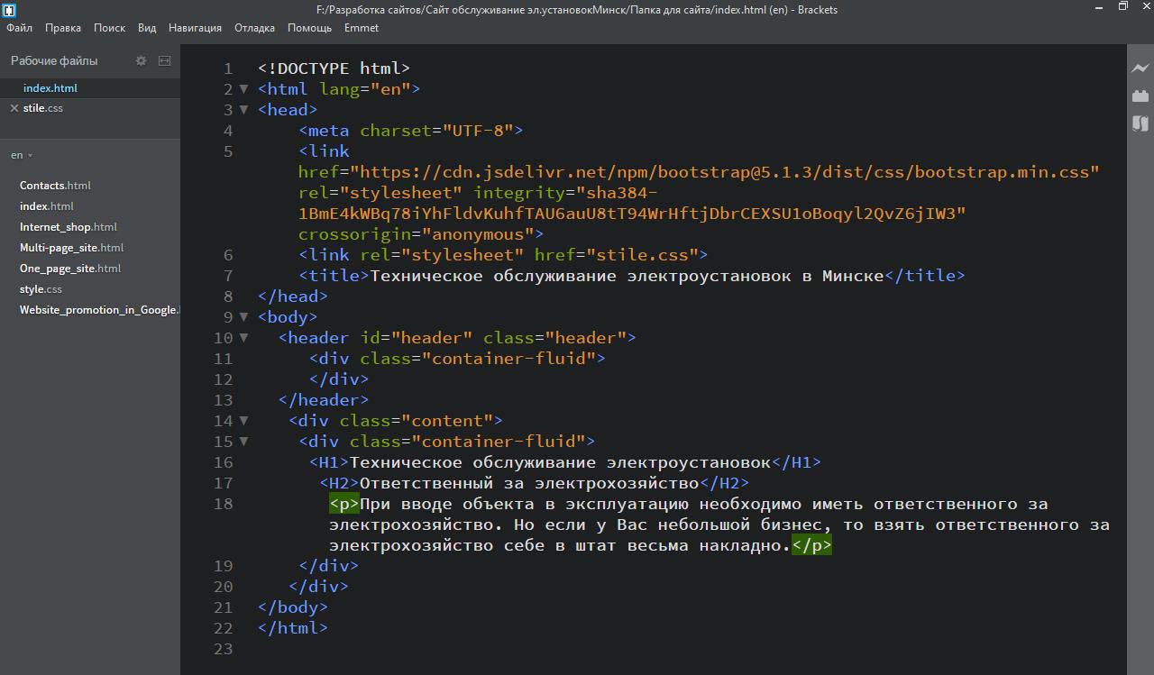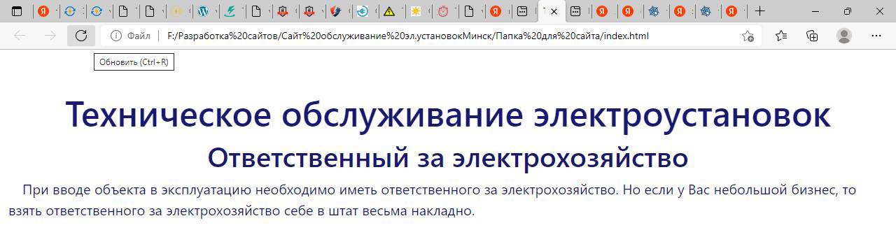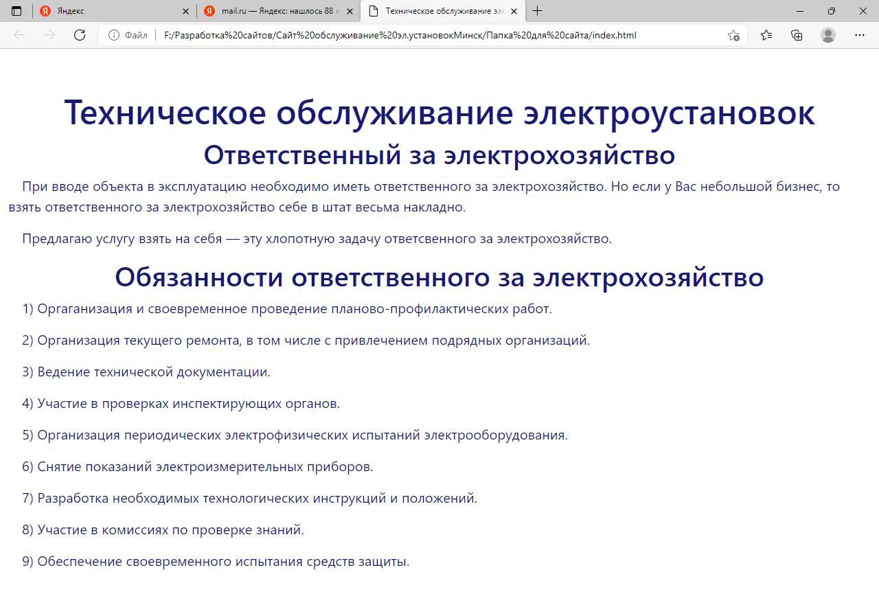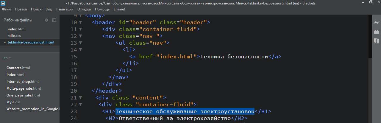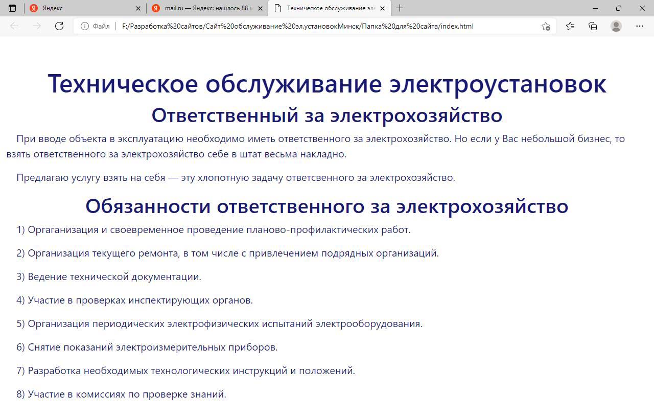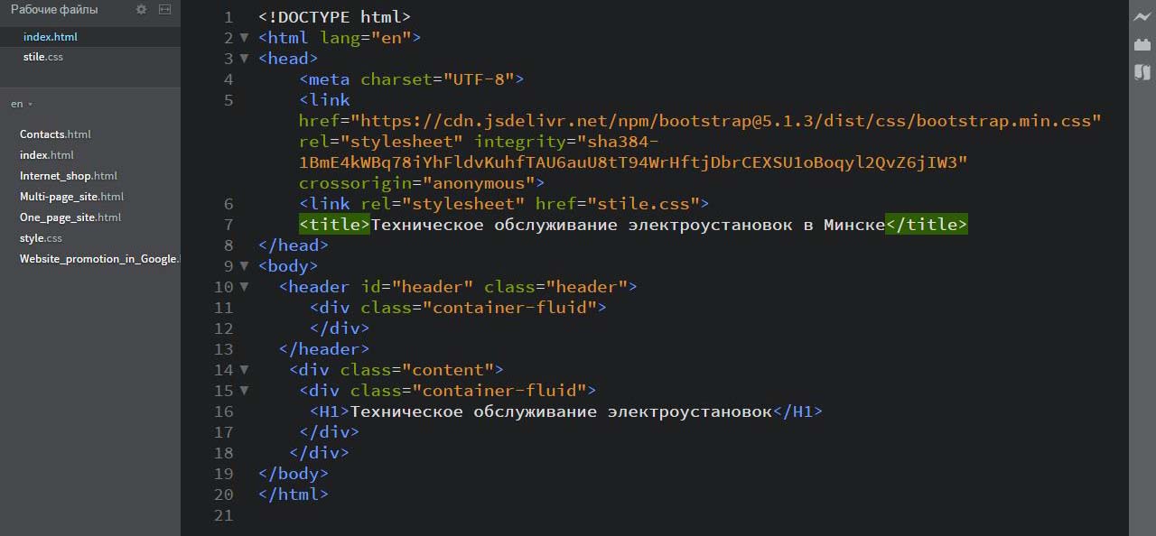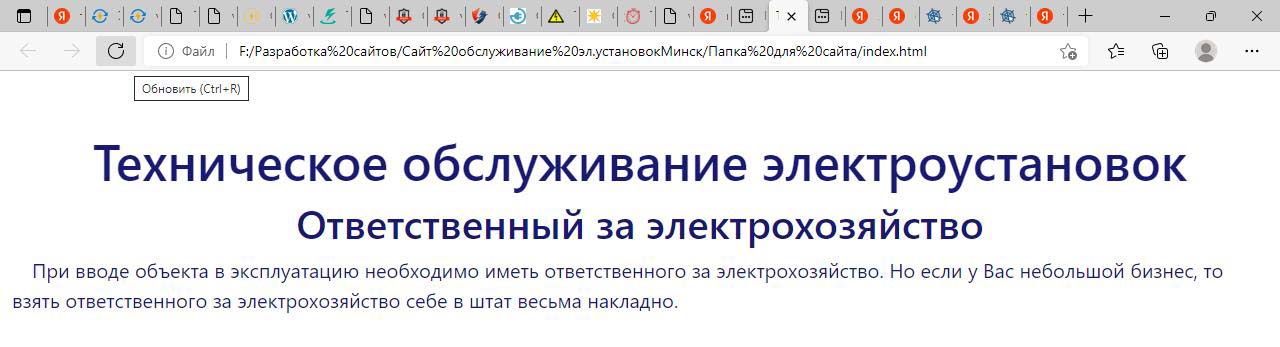 В файле index.html между тегами H1 пропишем заголовок страницы "Техническое обслуживание электроустановок".