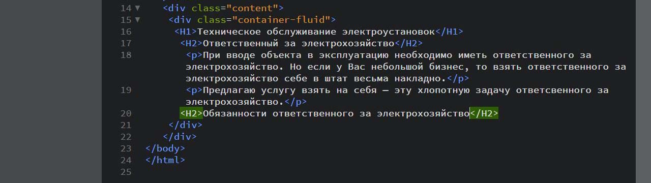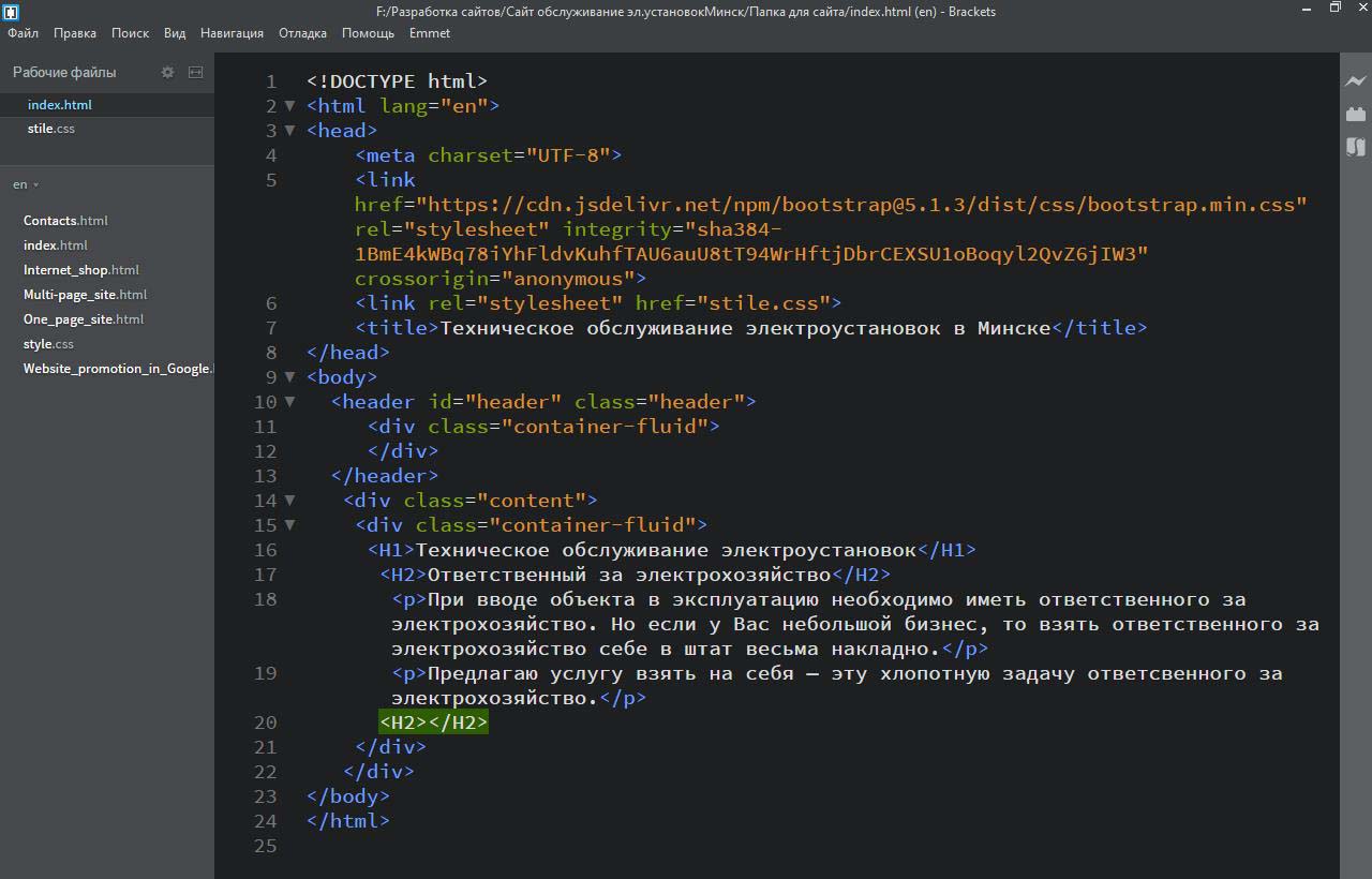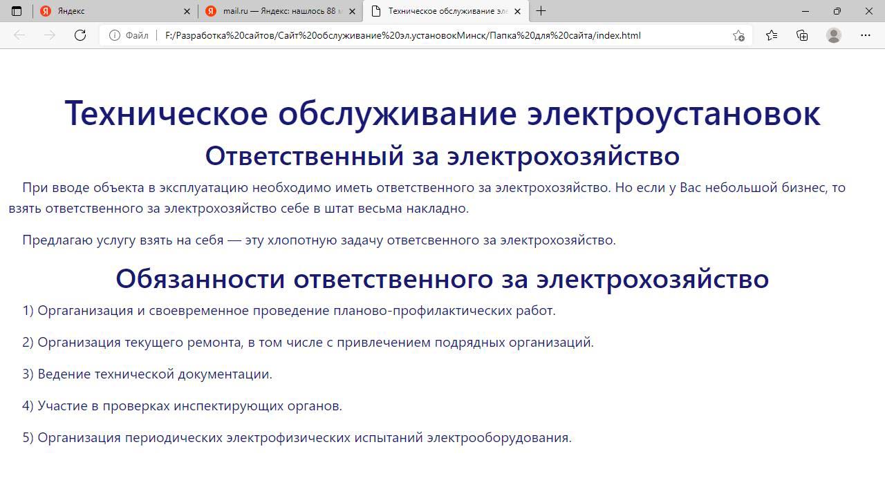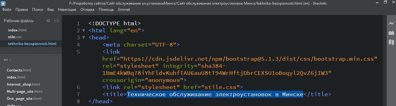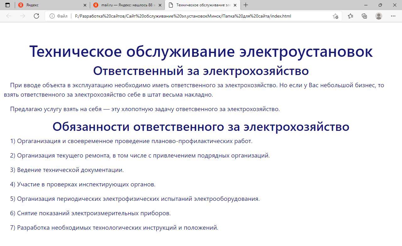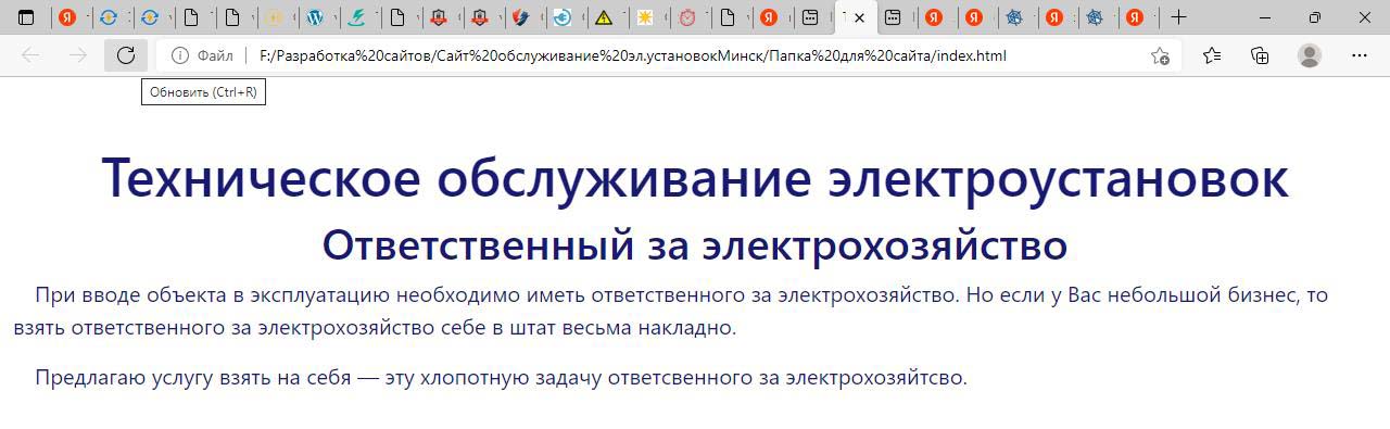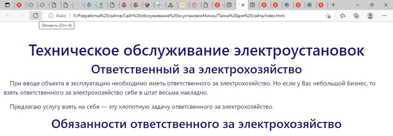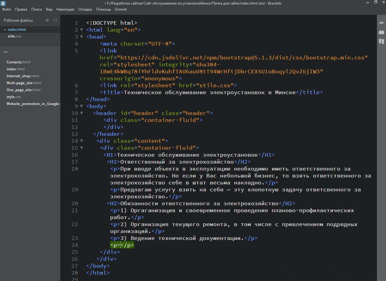 В файле index.html между тегами H1 пропишем заголовок страницы "Техническое обслуживание электроустановок".