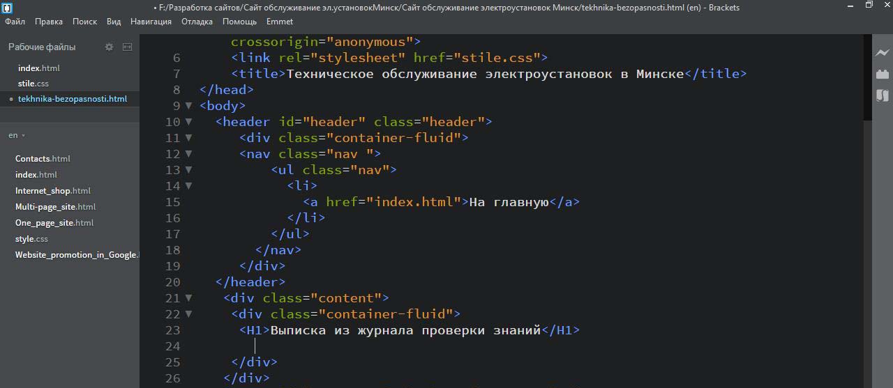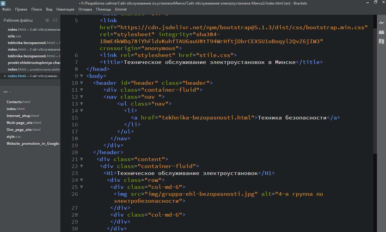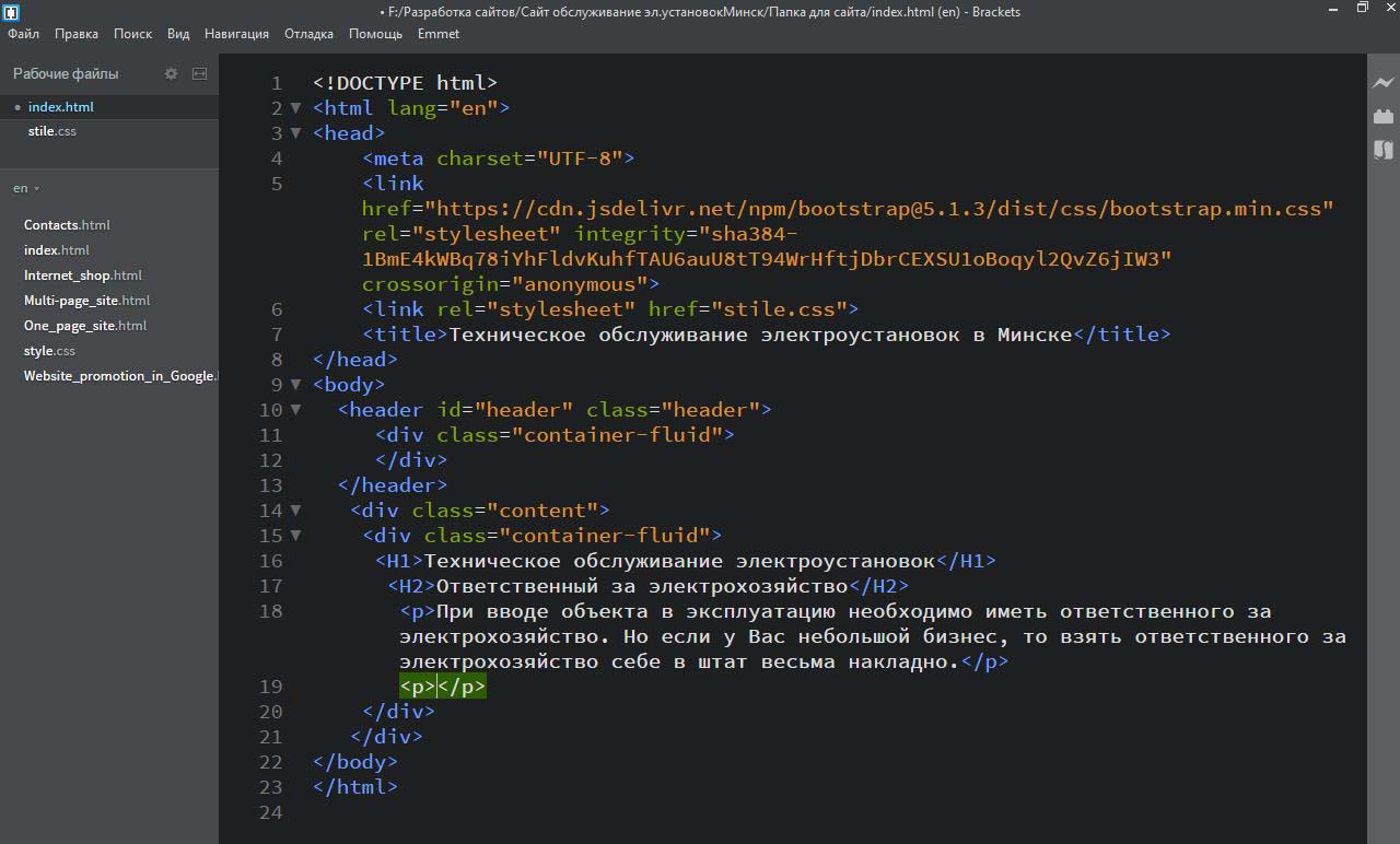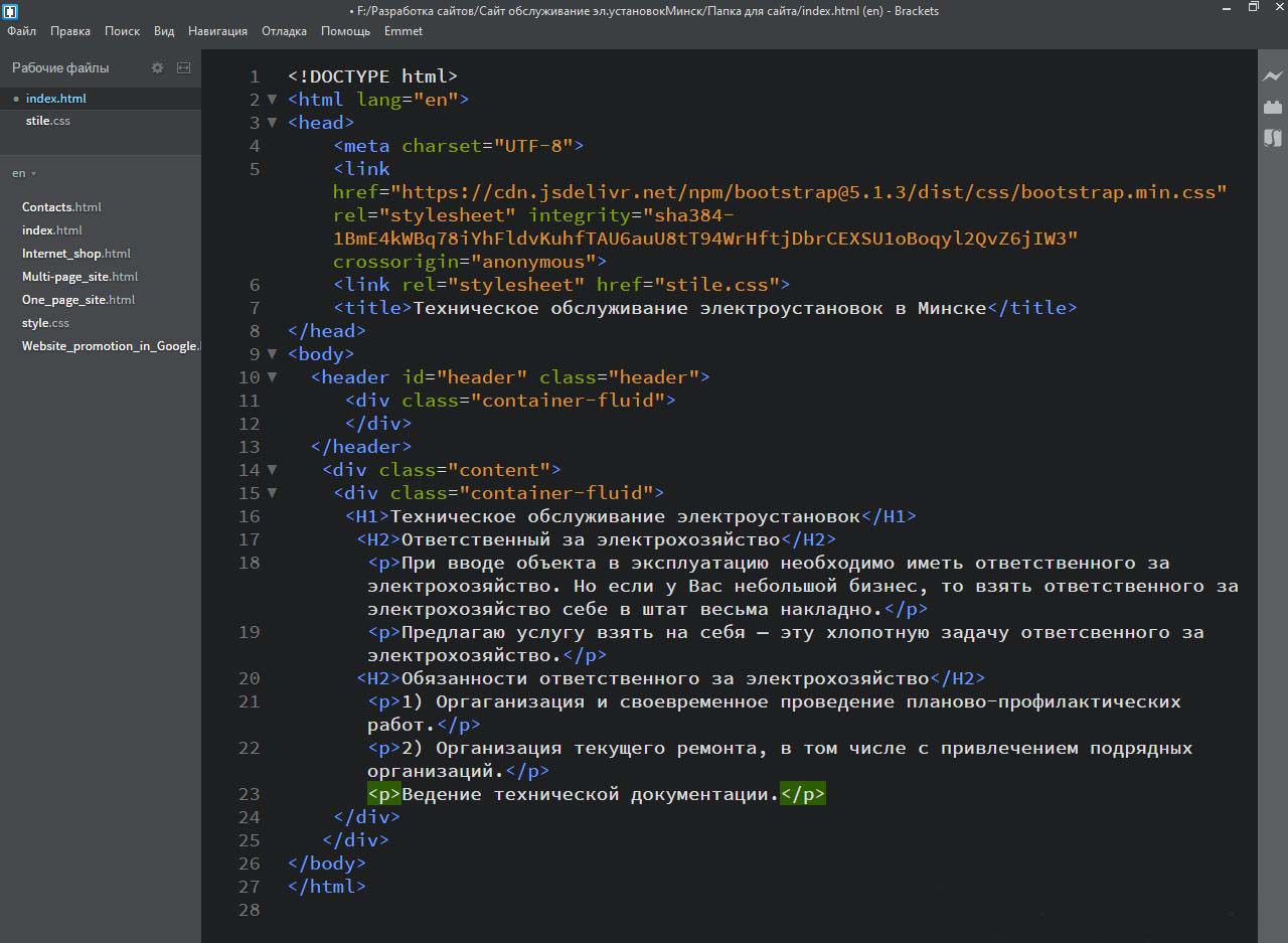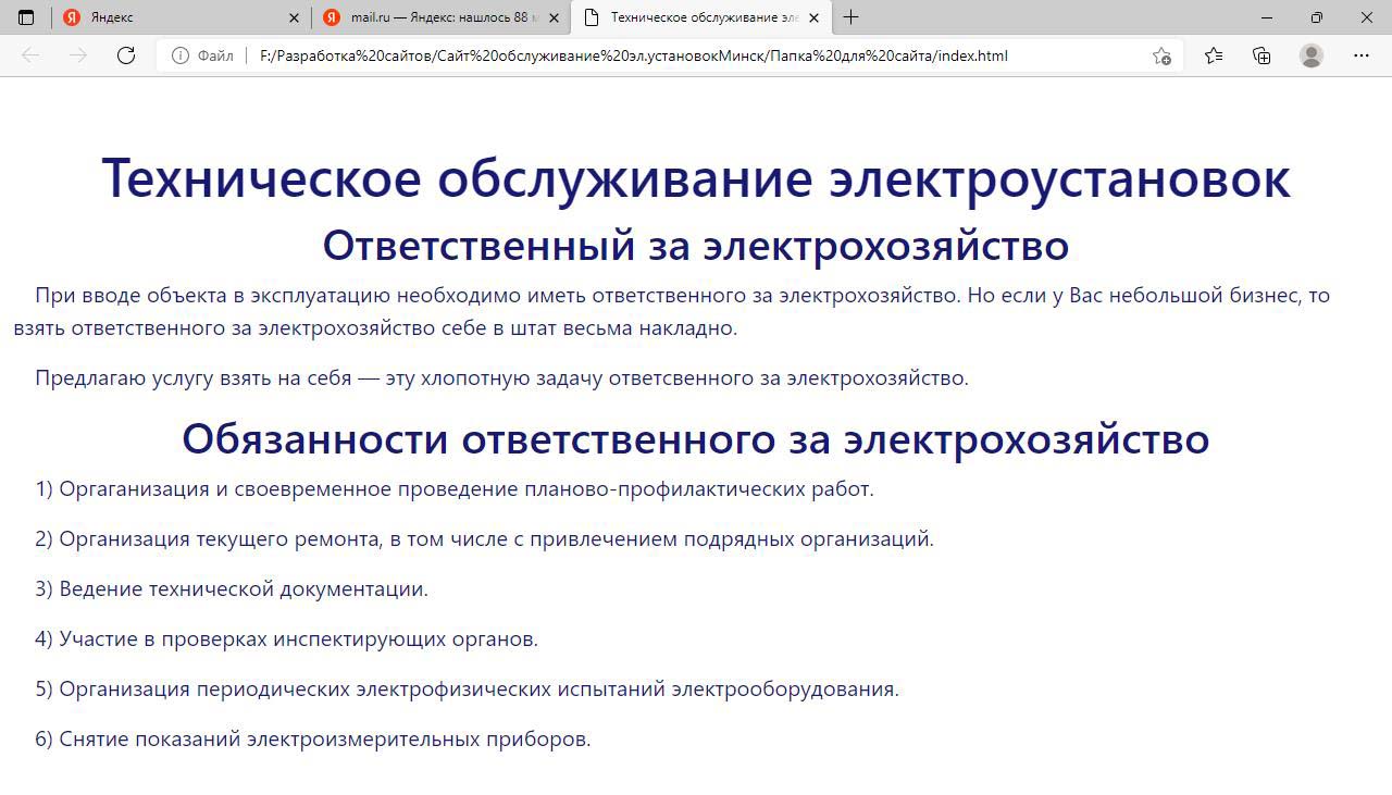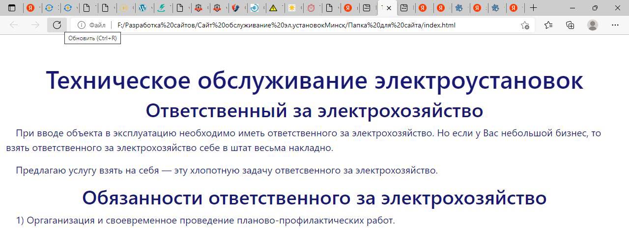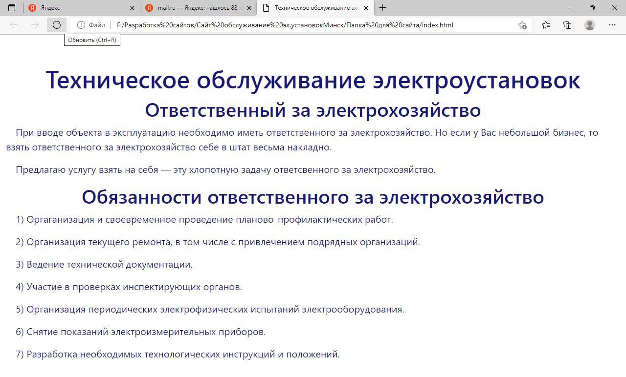 В файле index.html между тегами H1 пропишем заголовок страницы "Техническое обслуживание электроустановок".