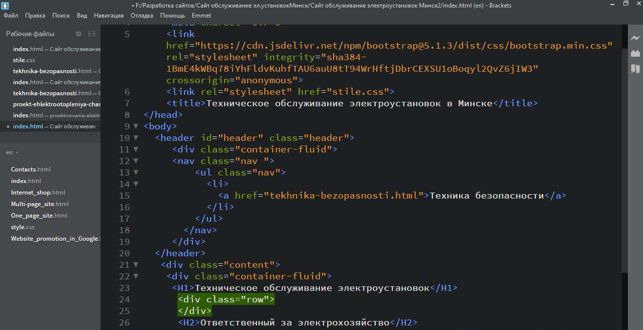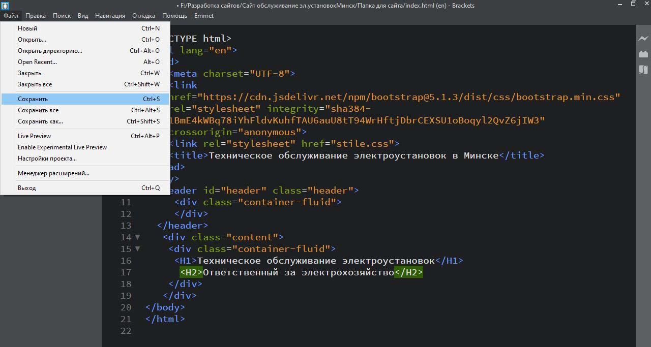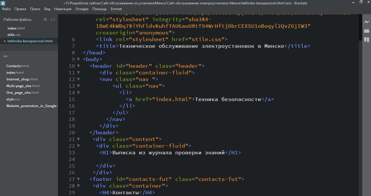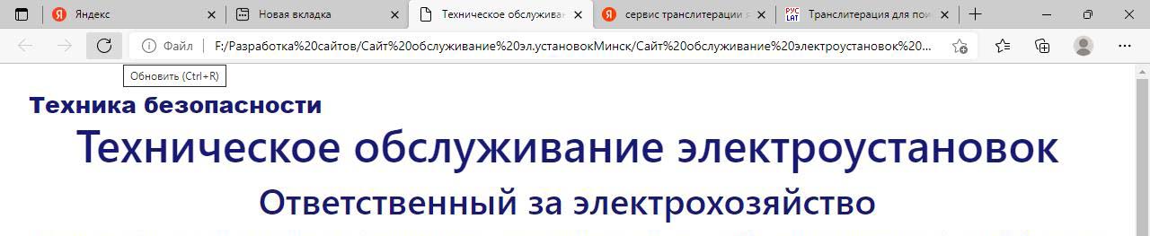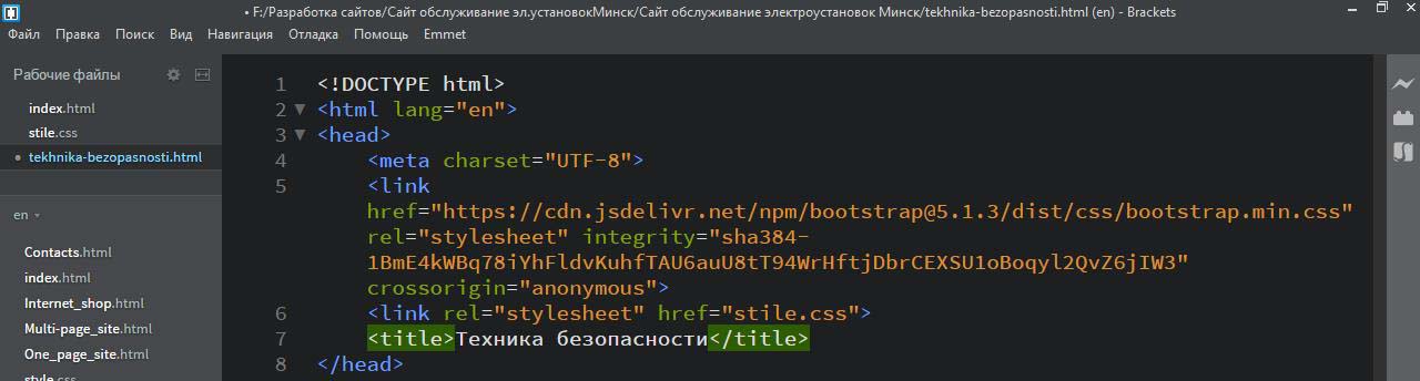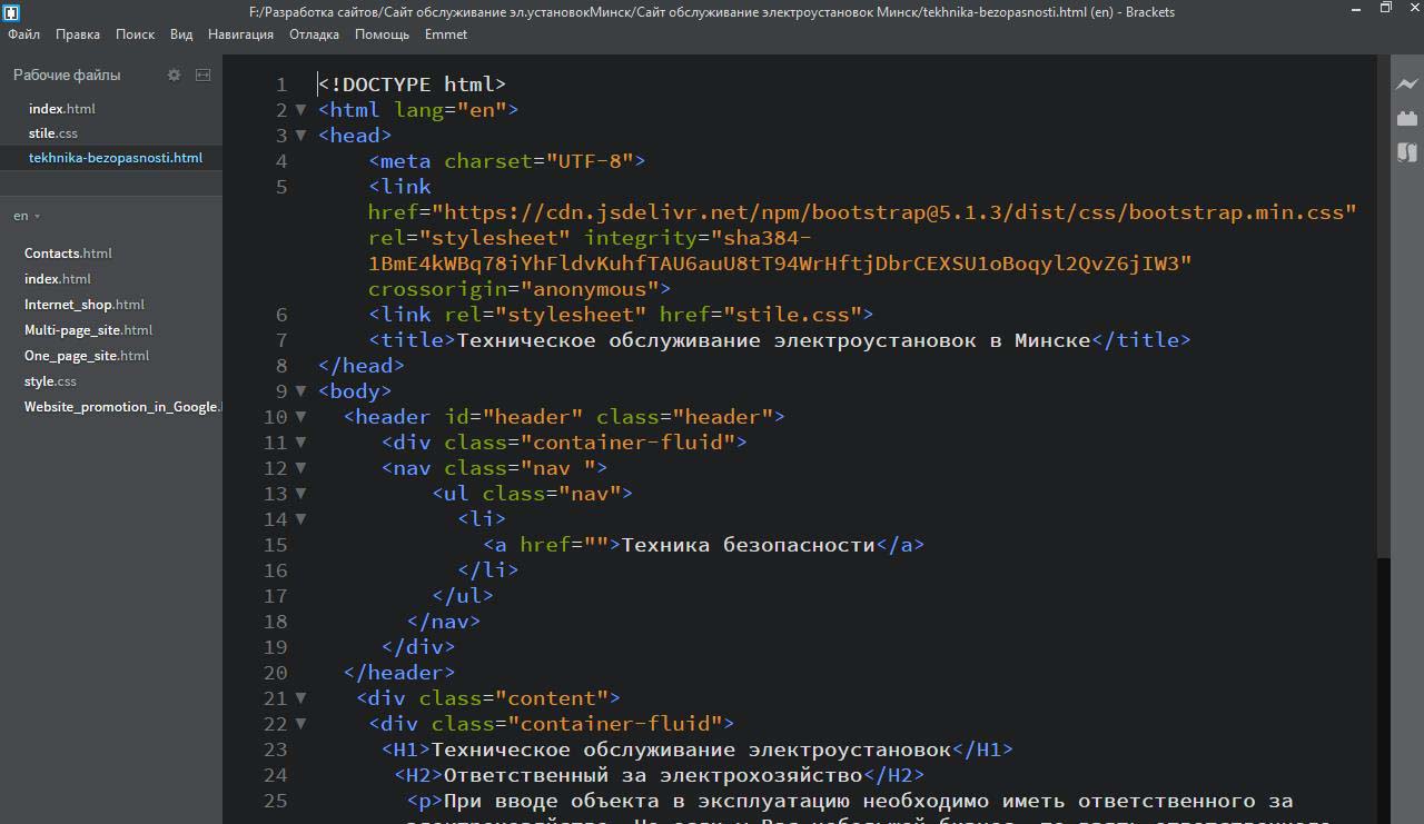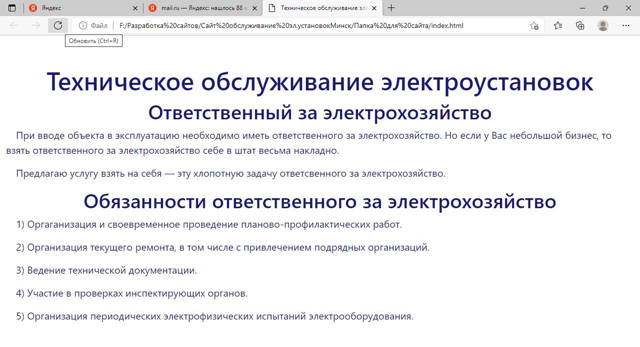 В файле index.html между тегами H1 пропишем заголовок страницы "Техническое обслуживание электроустановок".