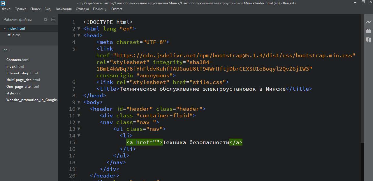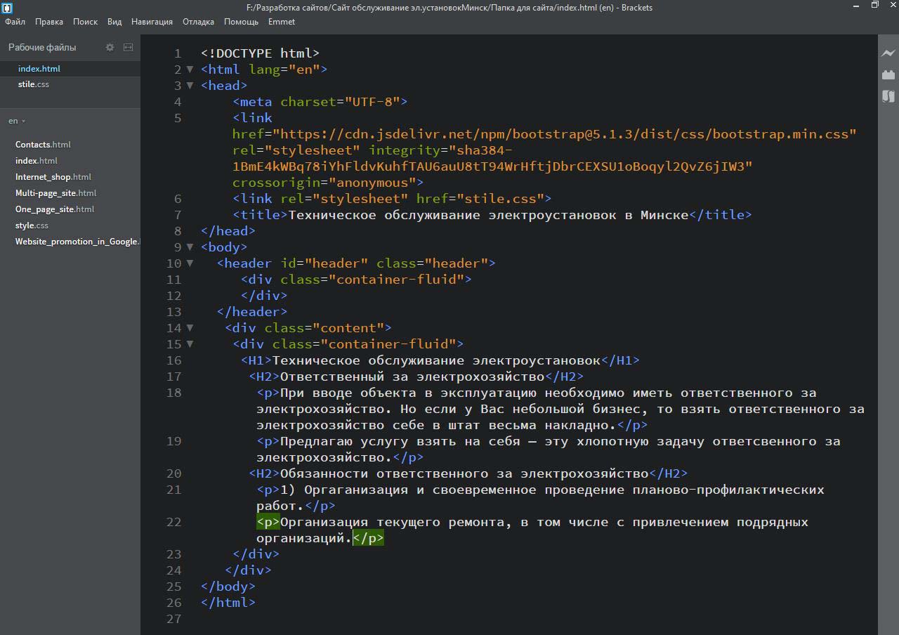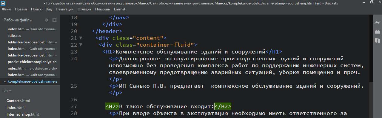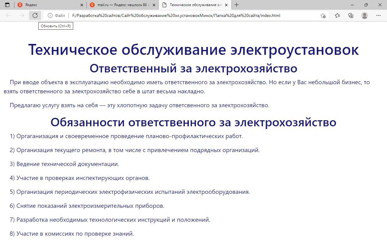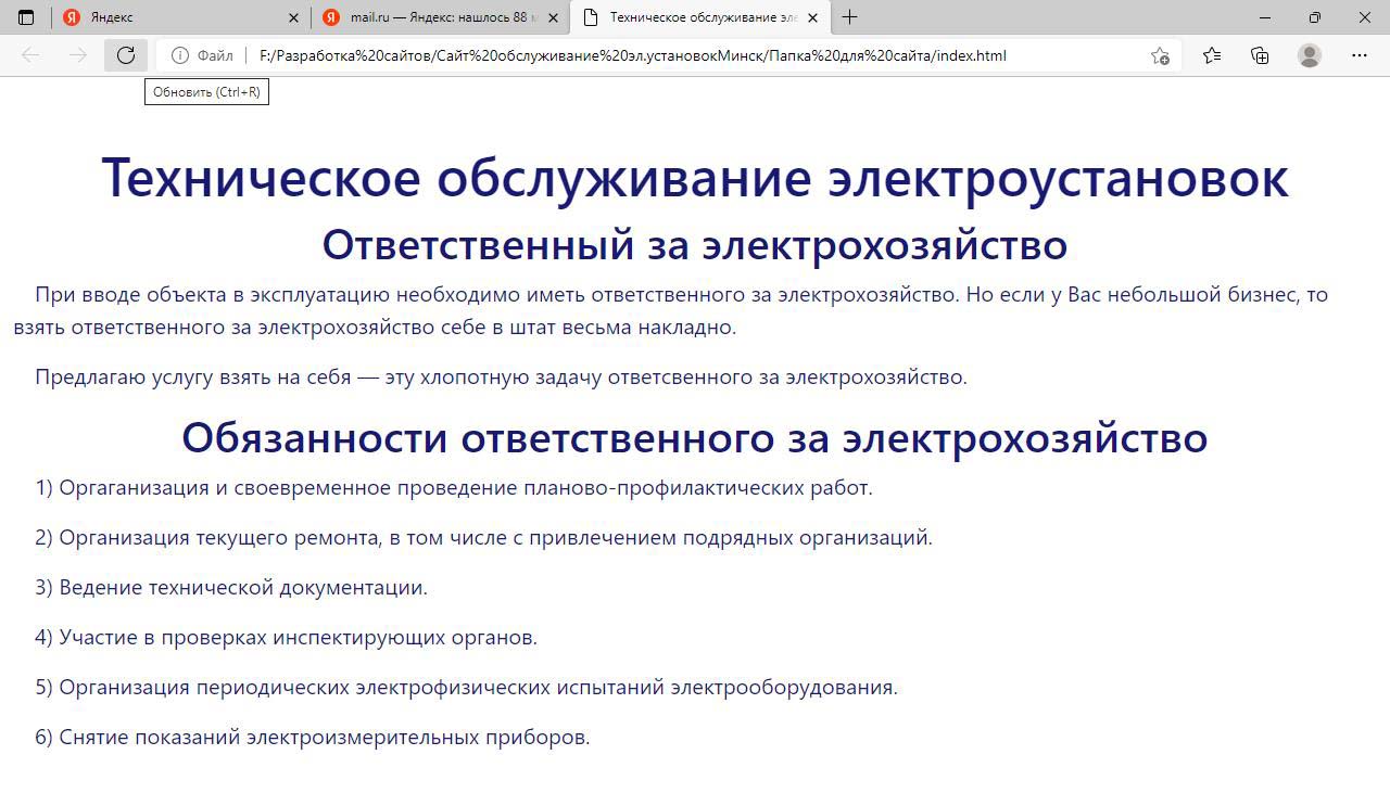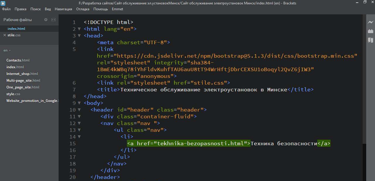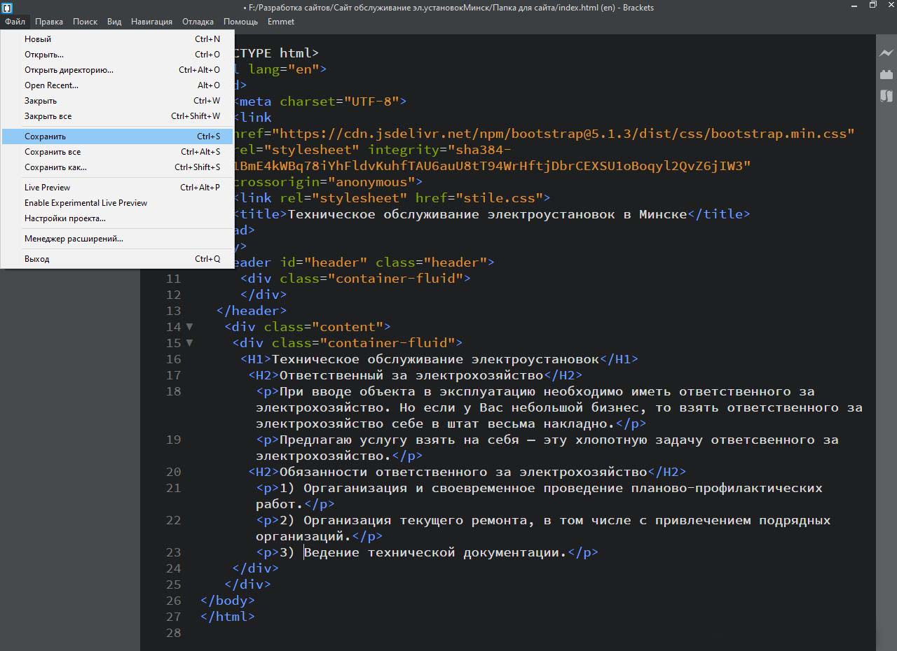 В файле index.html между тегами H1 пропишем заголовок страницы "Техническое обслуживание электроустановок".
