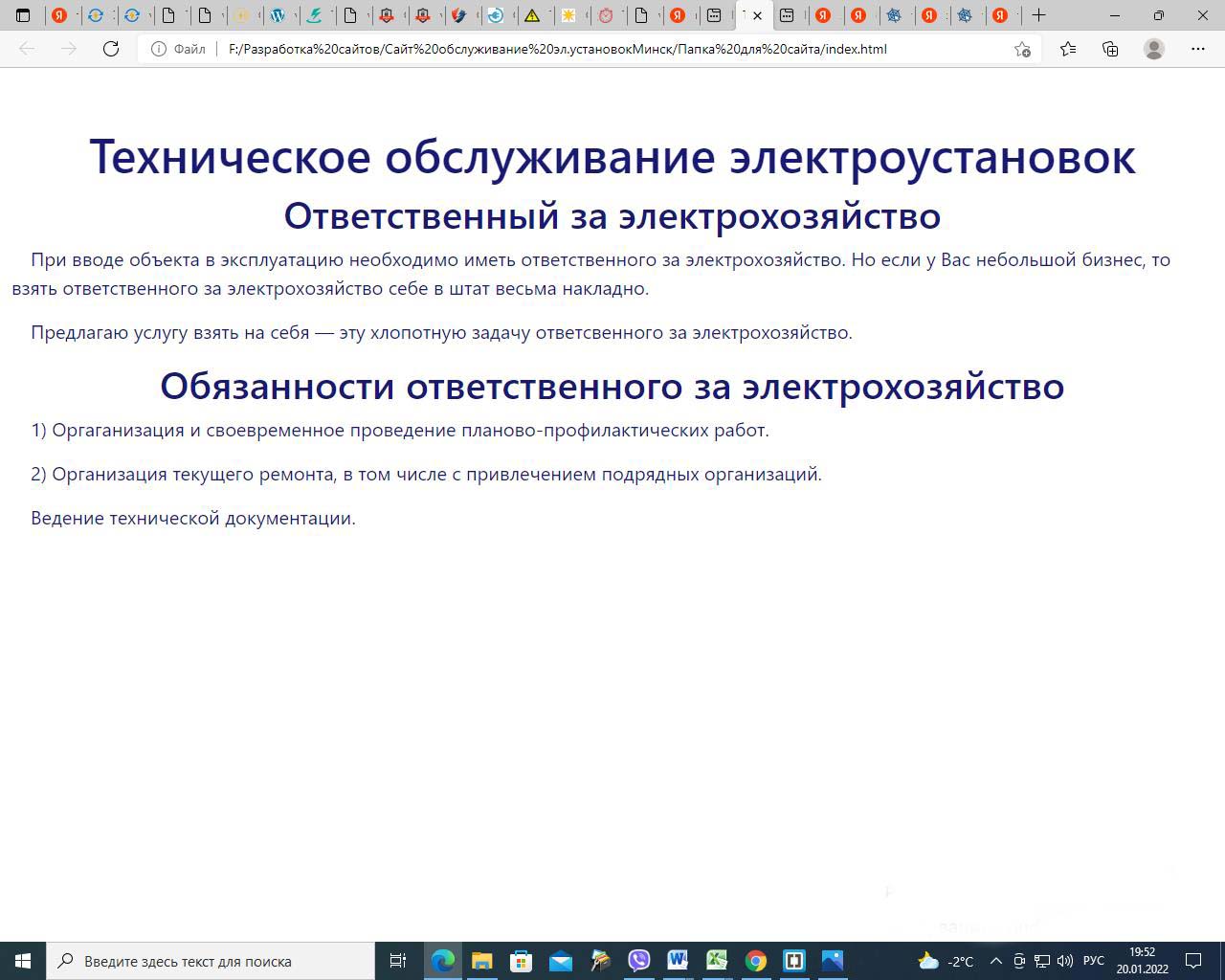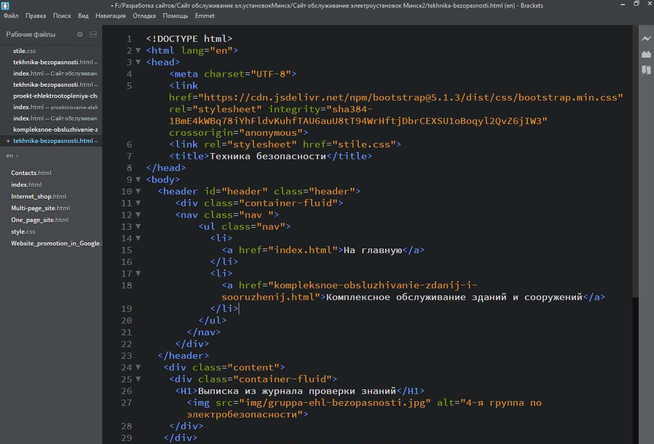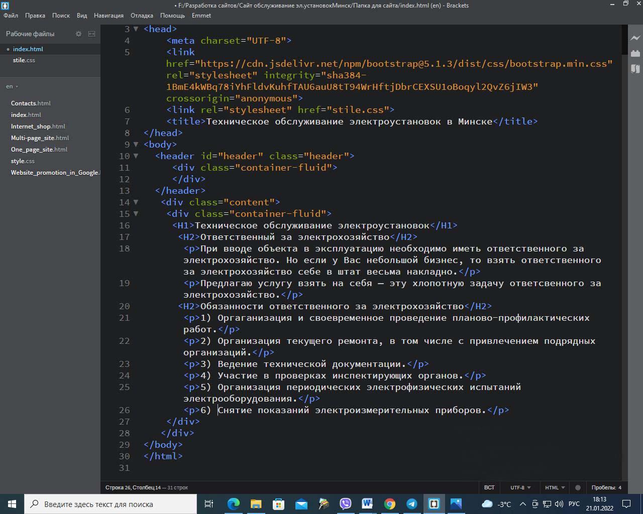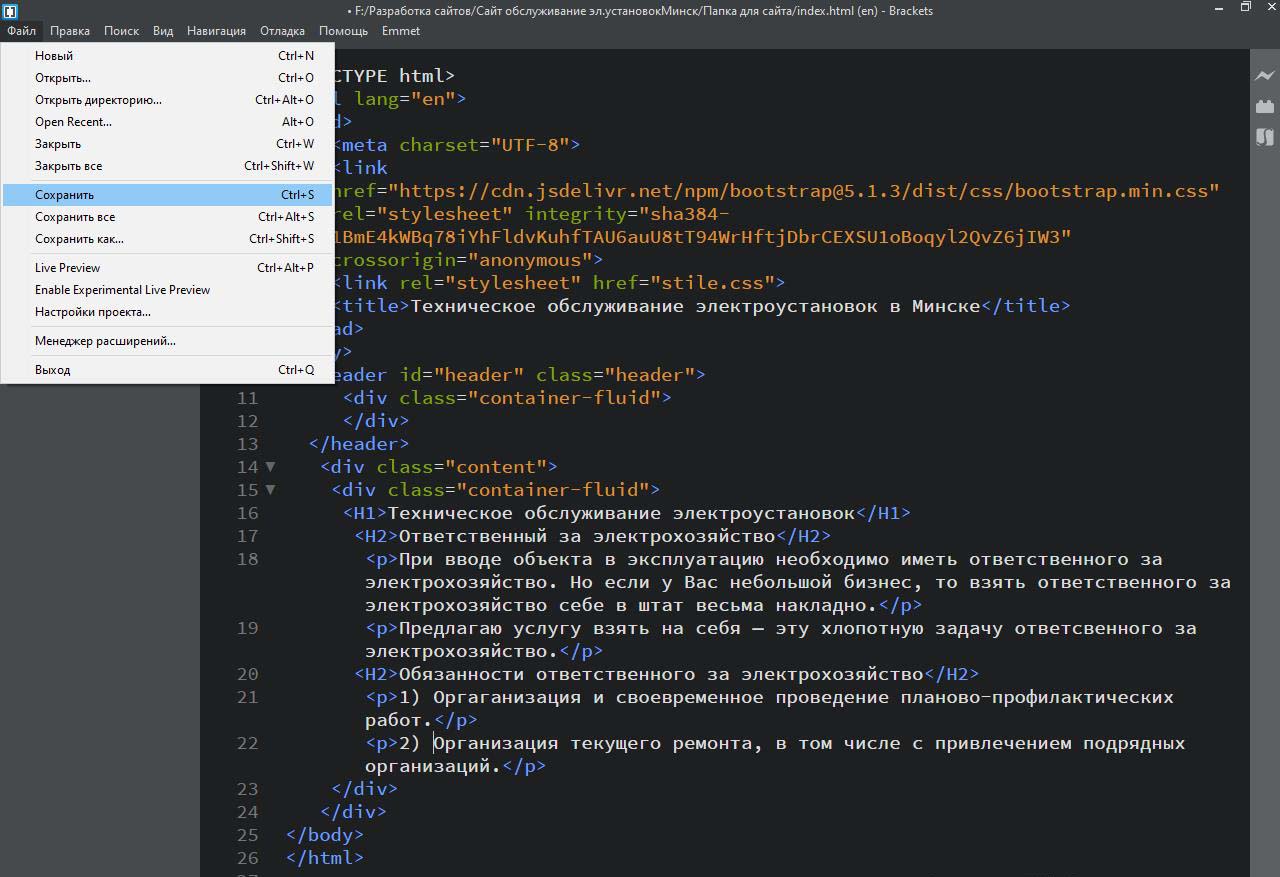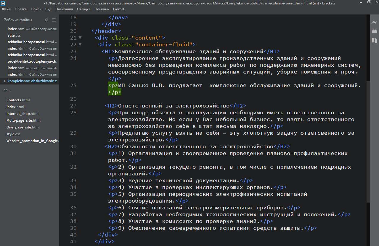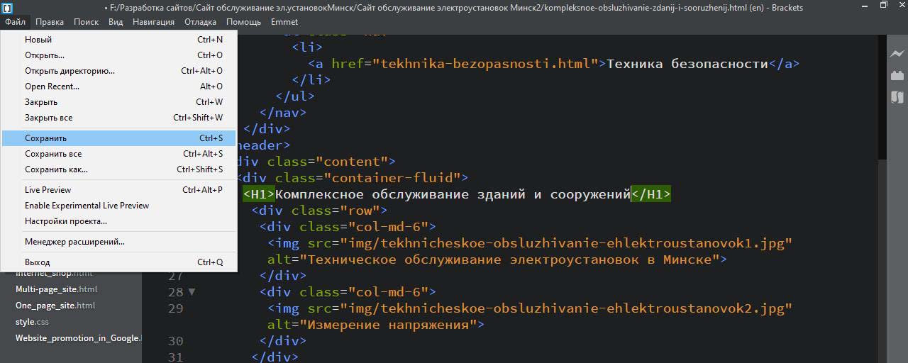 В файле index.html между тегами H1 пропишем заголовок страницы "Техническое обслуживание электроустановок".