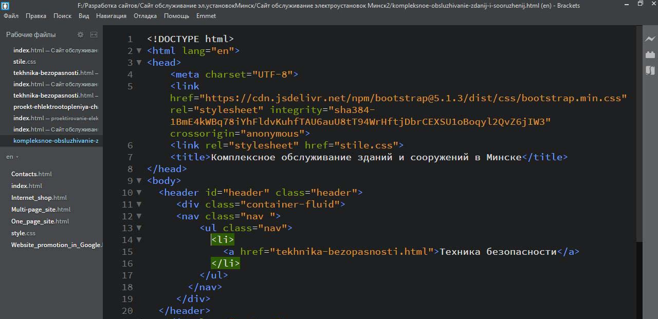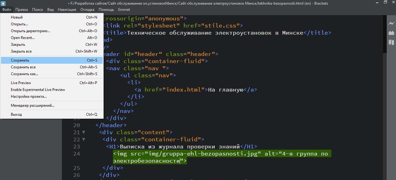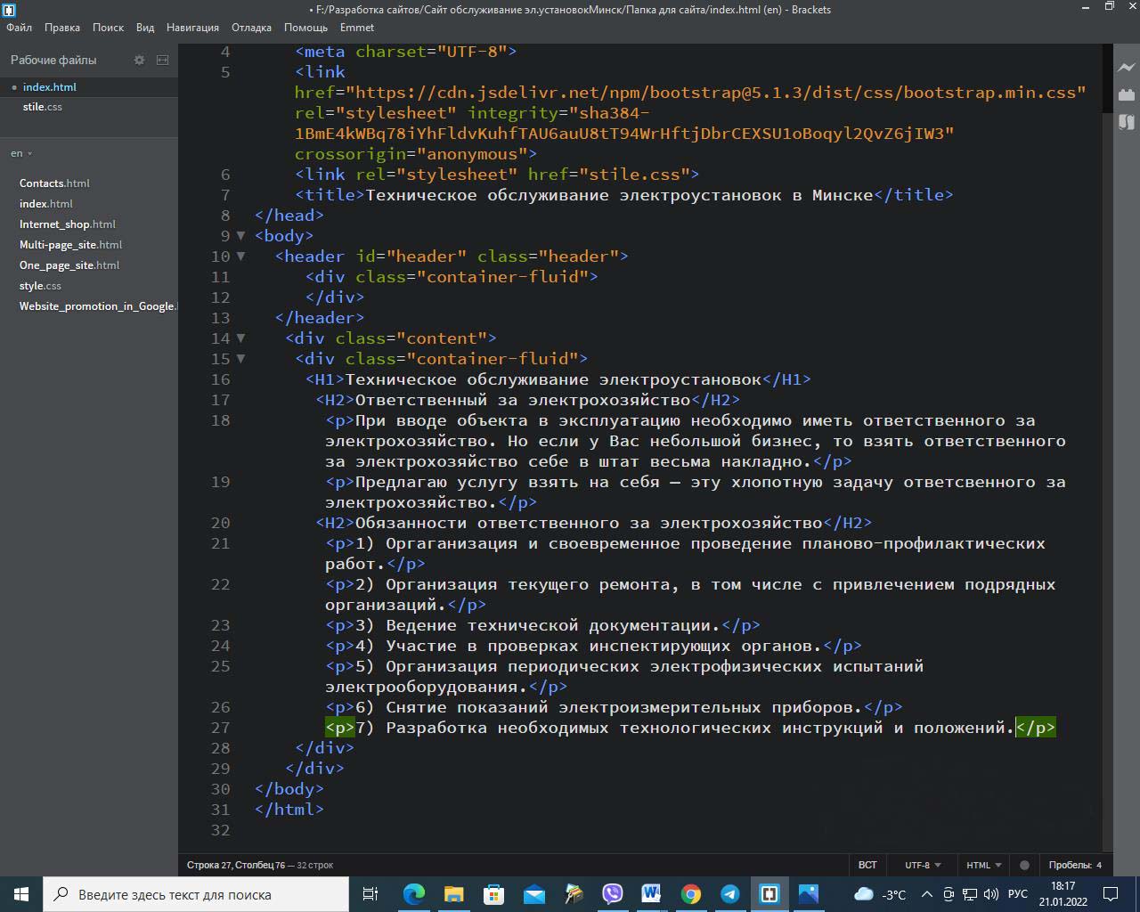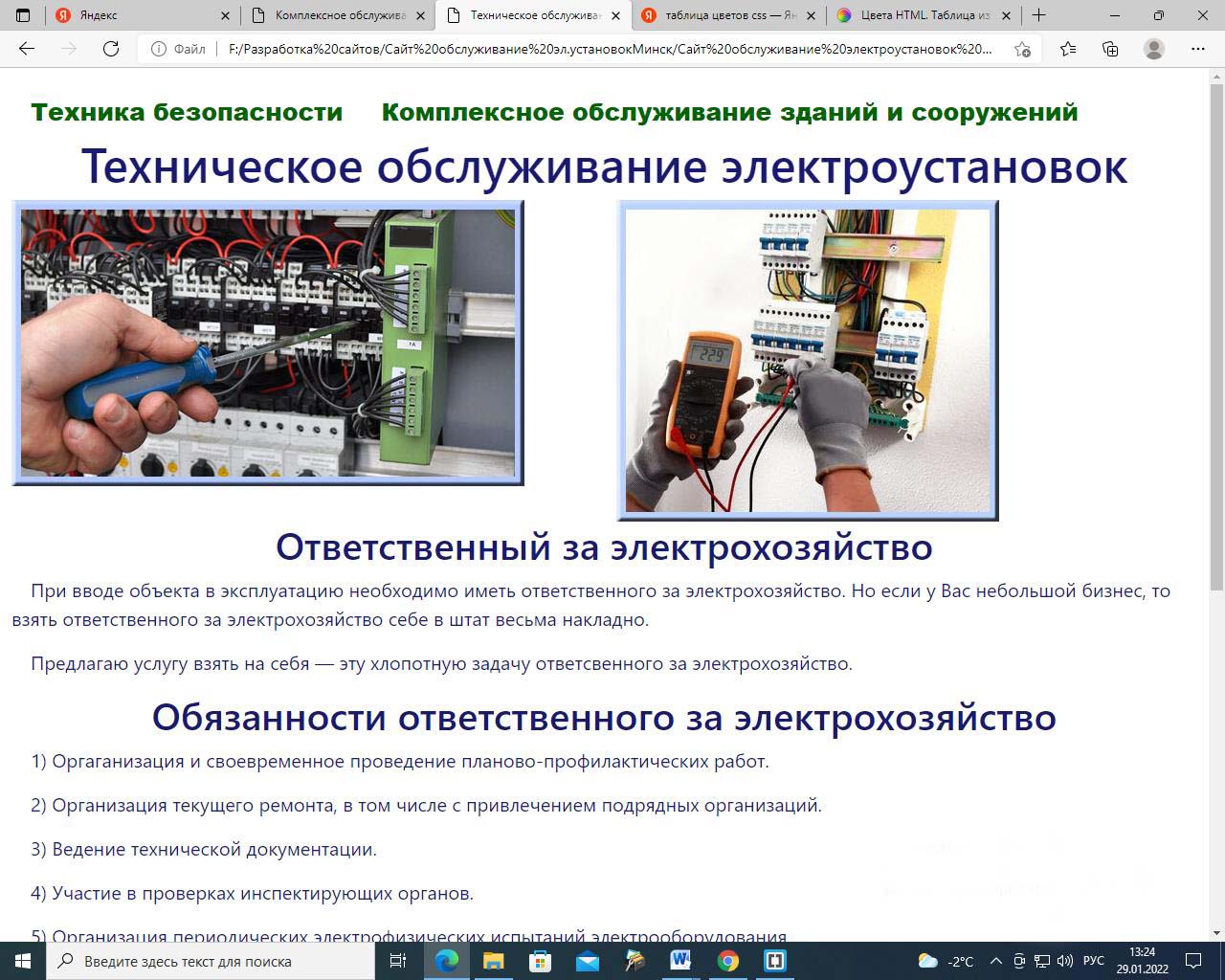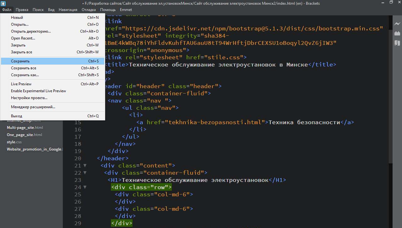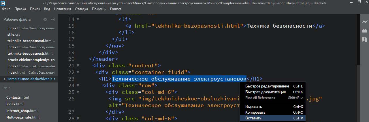 В файле index.html между тегами H1 пропишем заголовок страницы "Техническое обслуживание электроустановок".