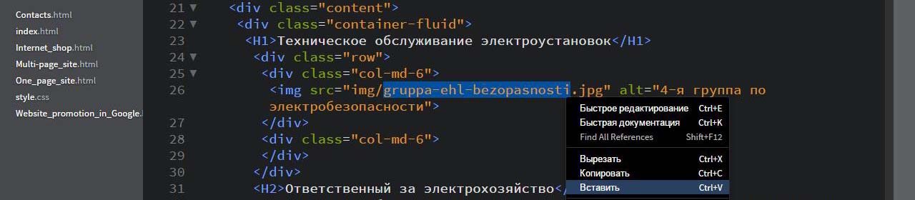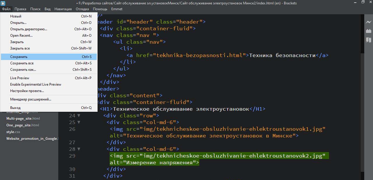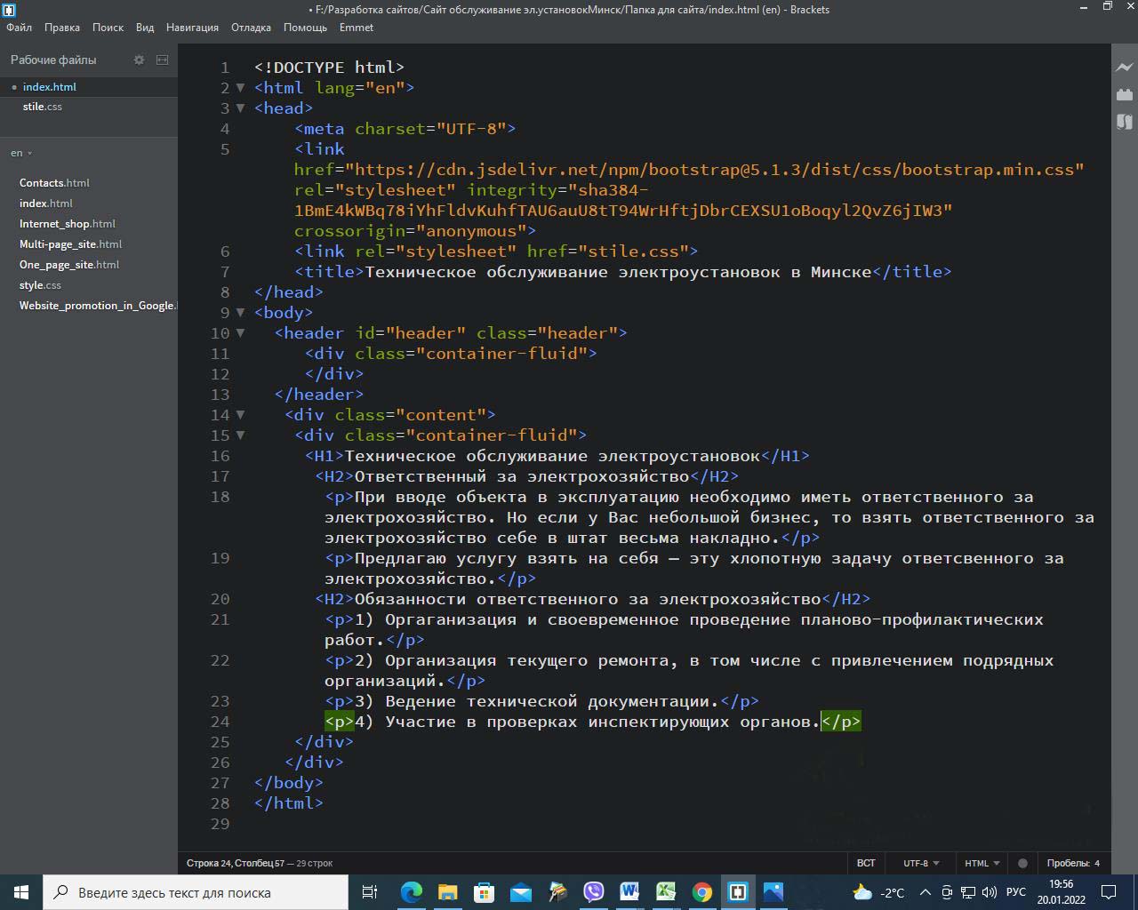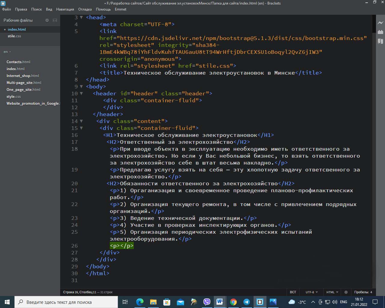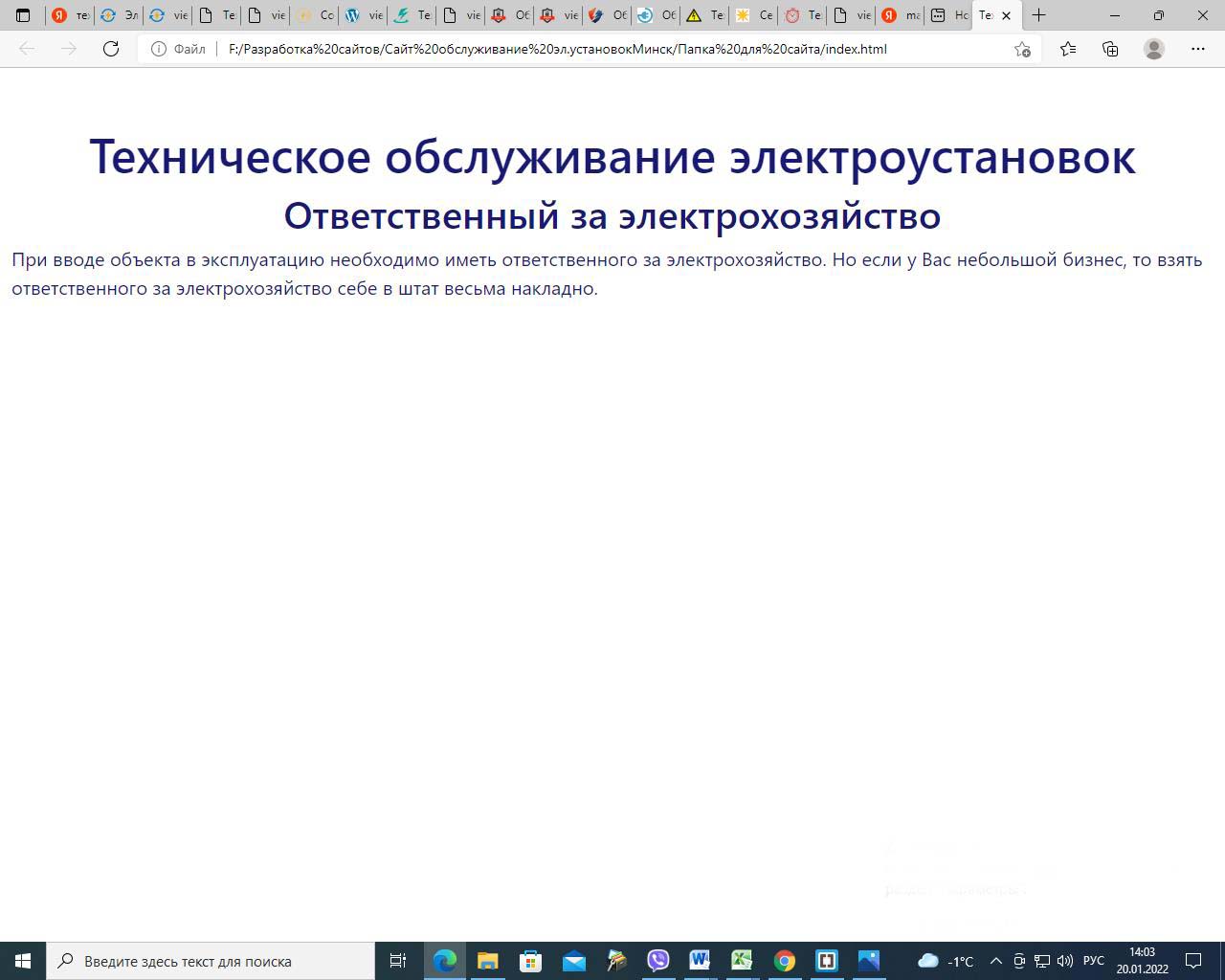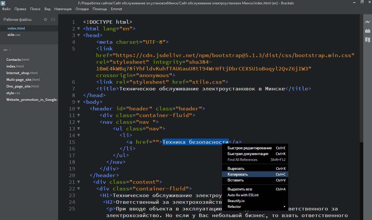 В файле index.html между тегами H1 пропишем заголовок страницы "Техническое обслуживание электроустановок".