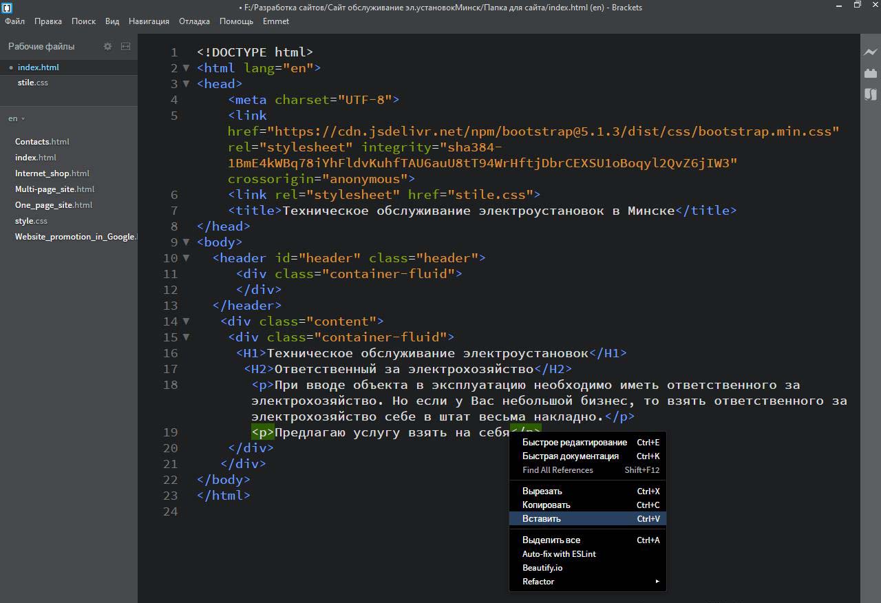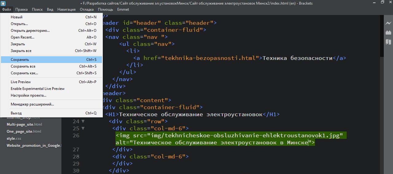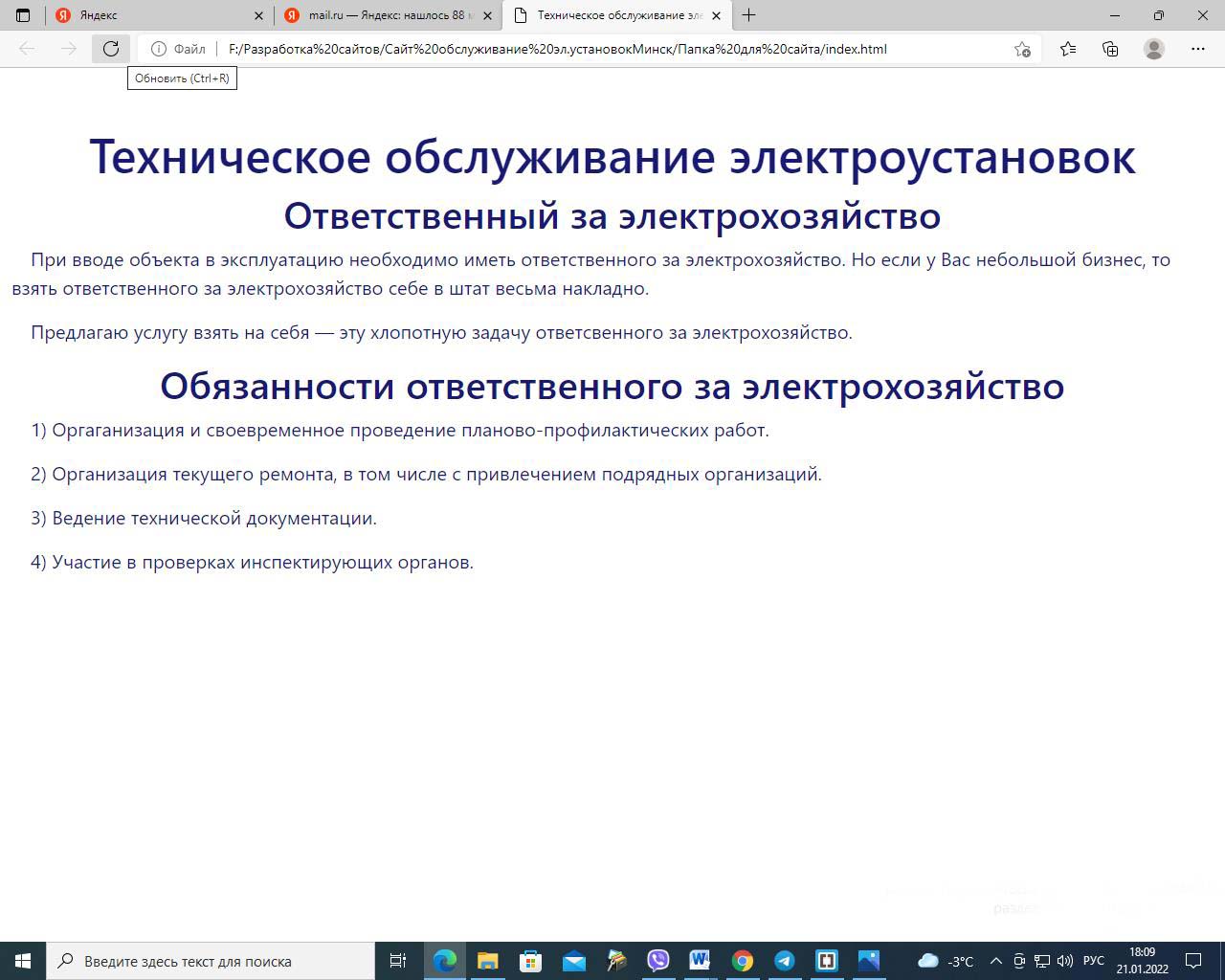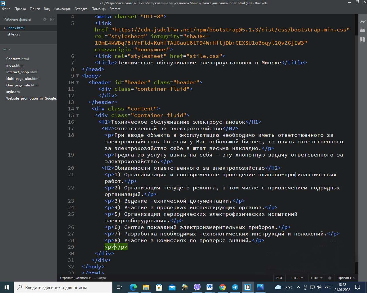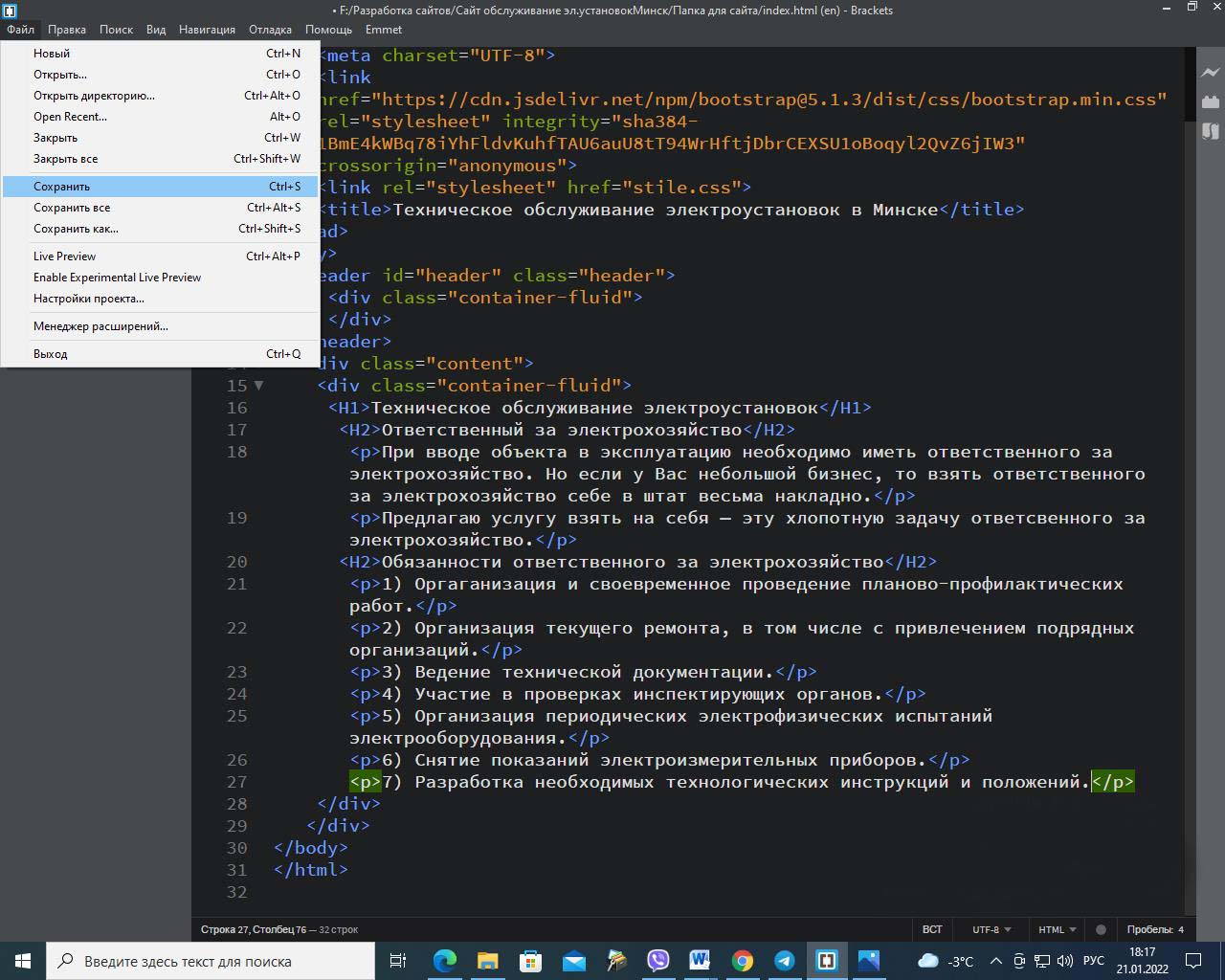 В файле index.html между тегами H1 пропишем заголовок страницы "Техническое обслуживание электроустановок".