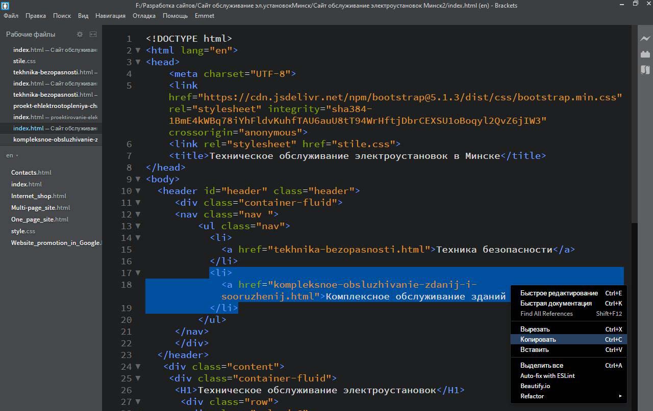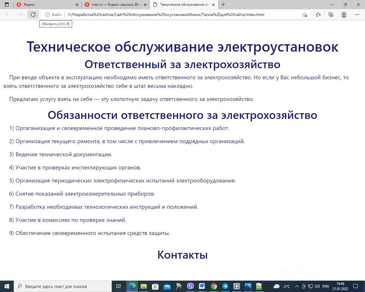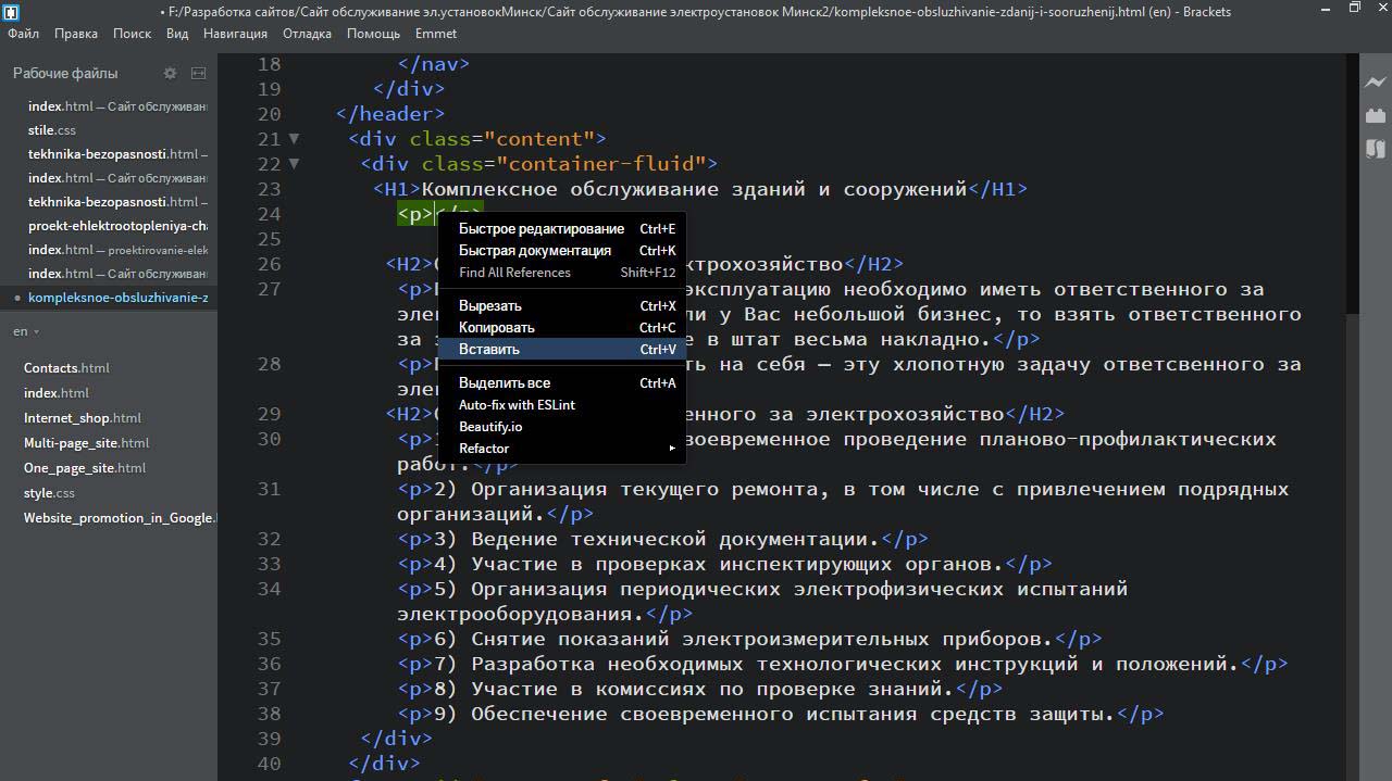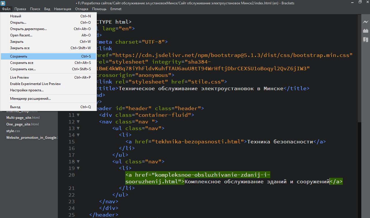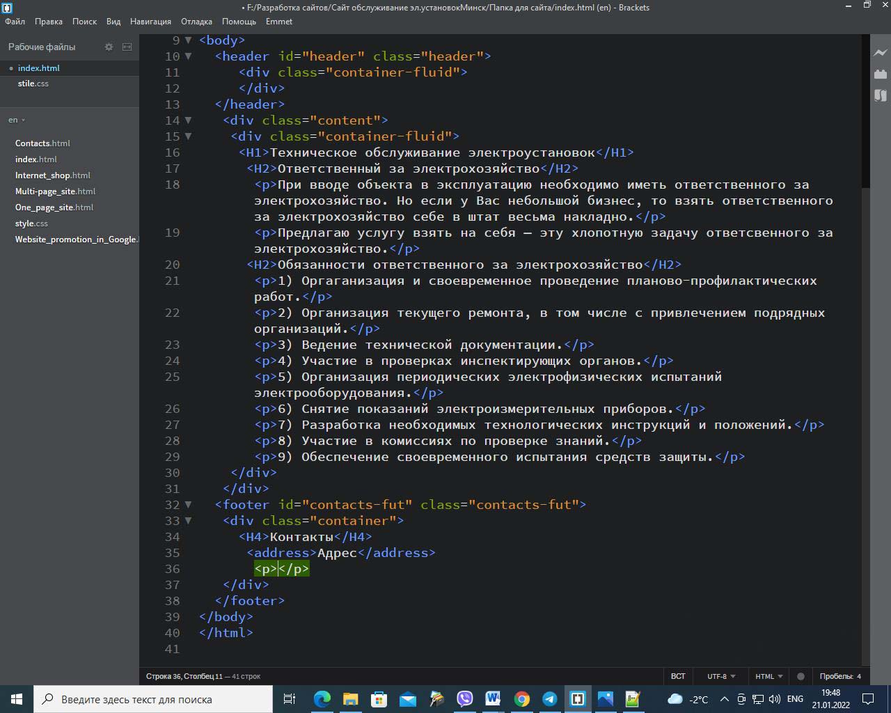 В файле index.html между тегами H1 пропишем заголовок страницы "Техническое обслуживание электроустановок".