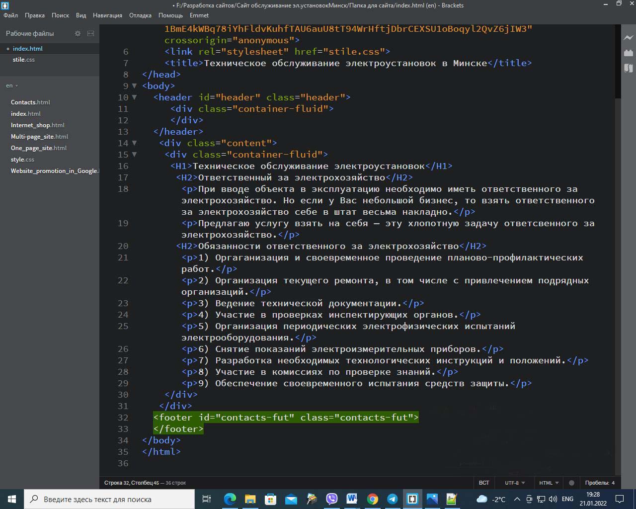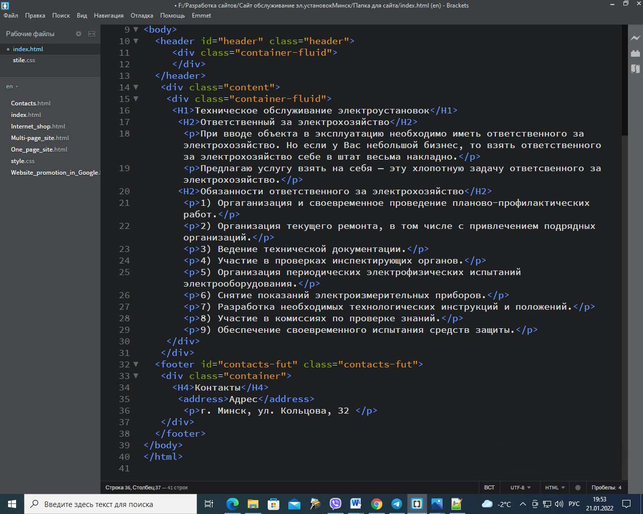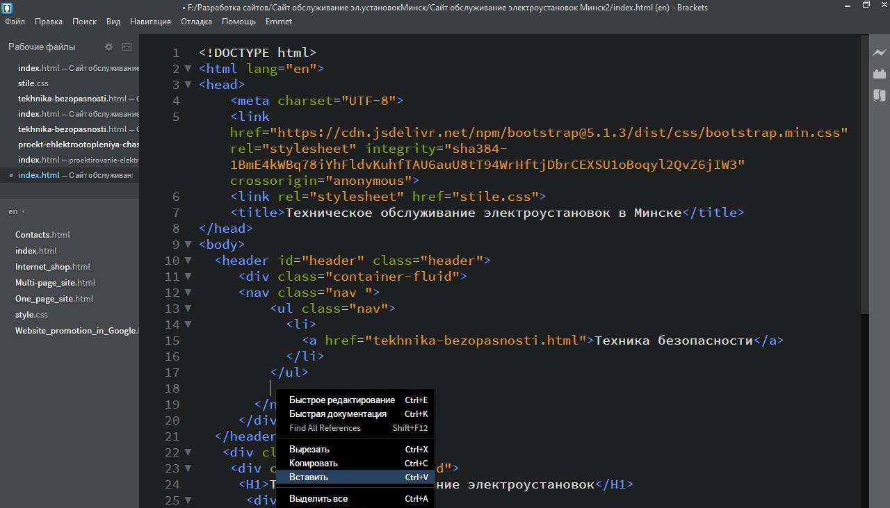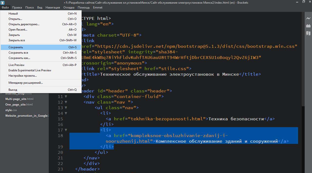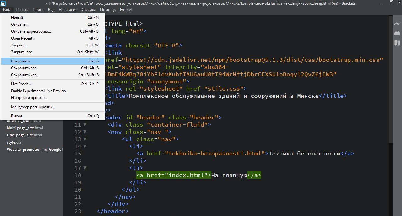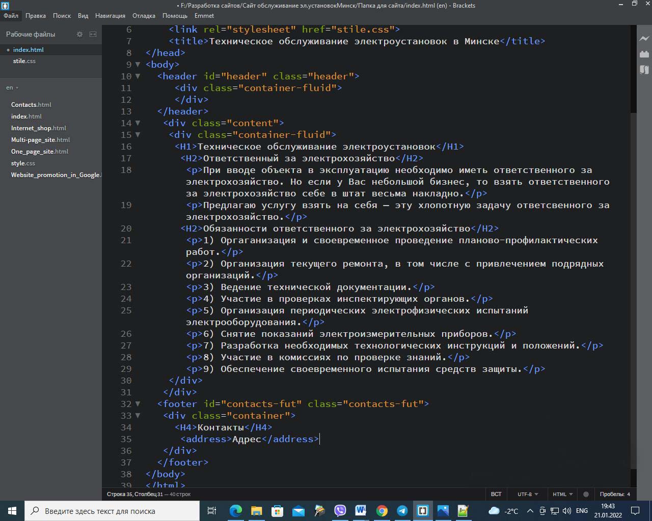 В файле index.html между тегами H1 пропишем заголовок страницы "Техническое обслуживание электроустановок".