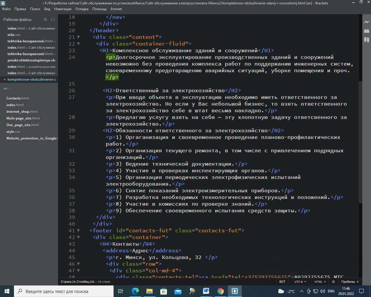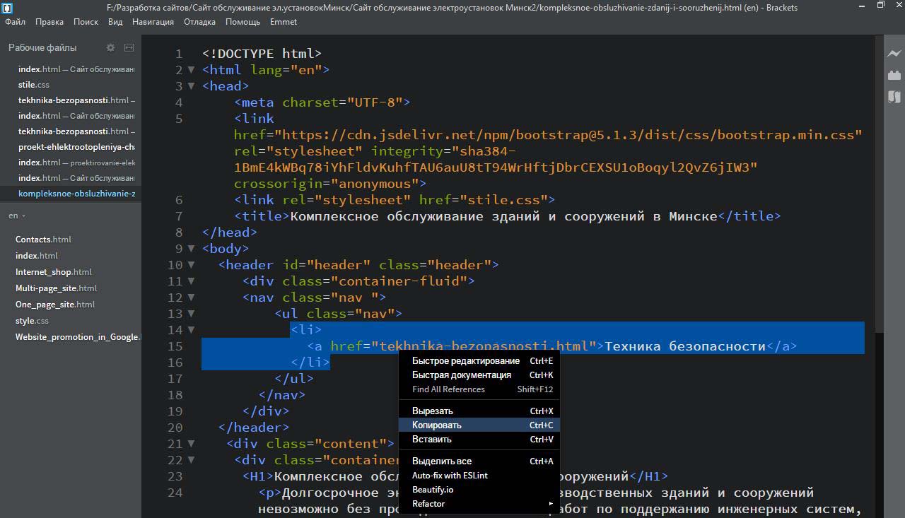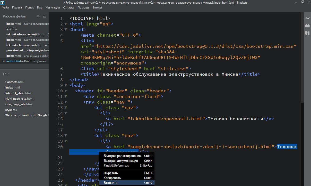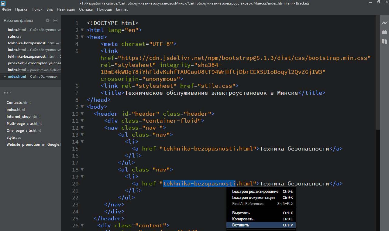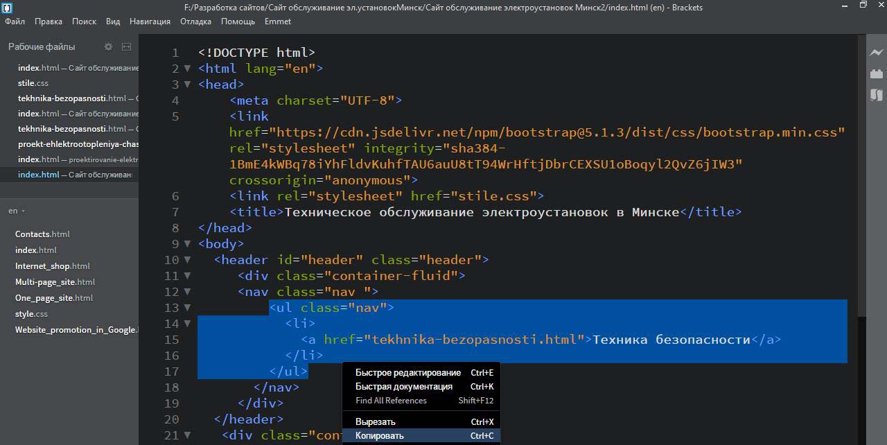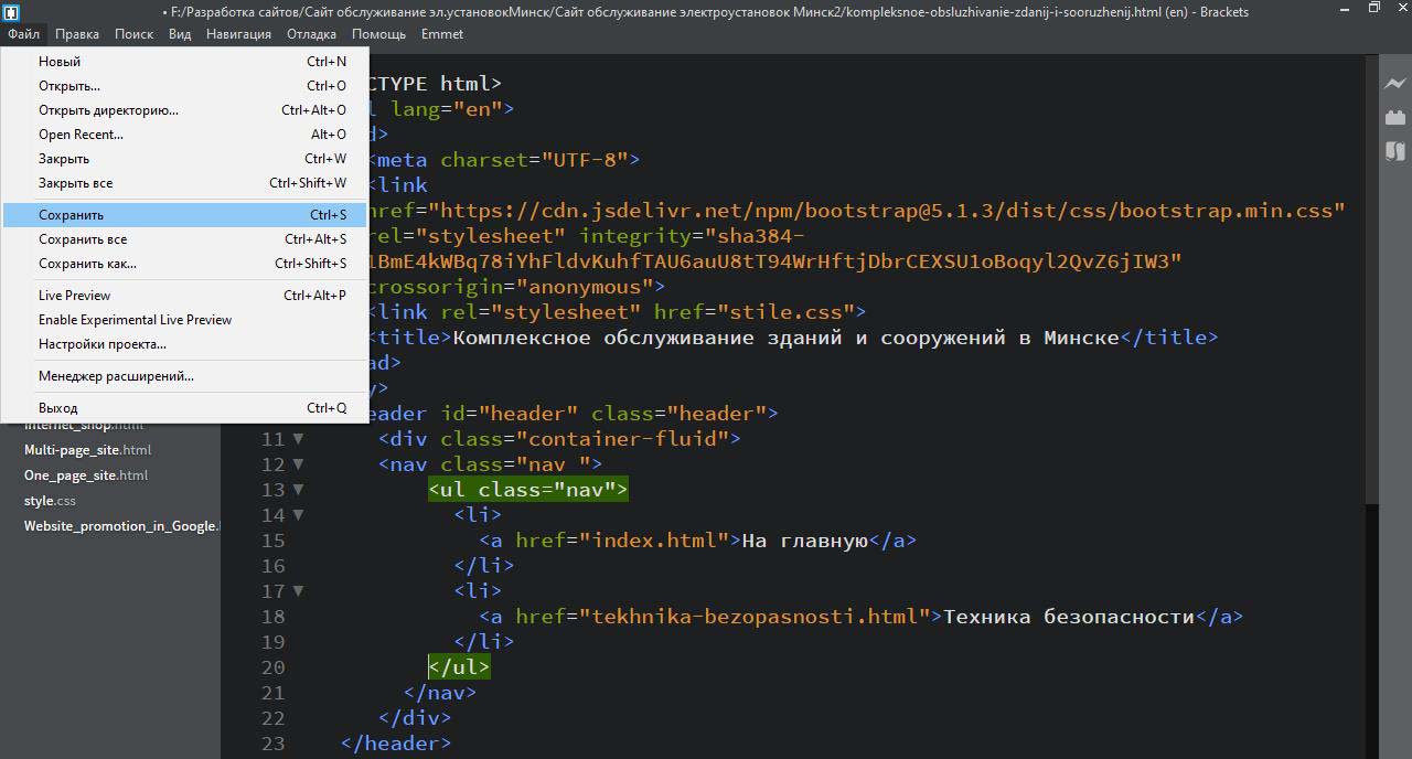 В файле index.html между тегами H1 пропишем заголовок страницы "Техническое обслуживание электроустановок".