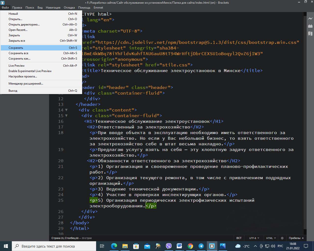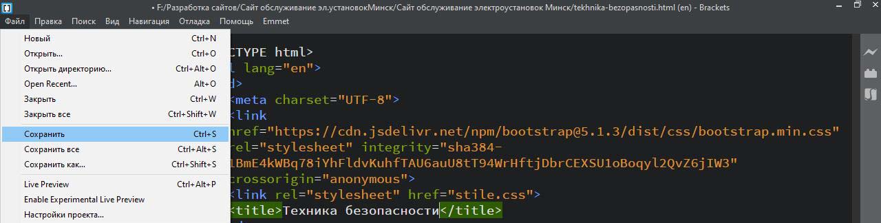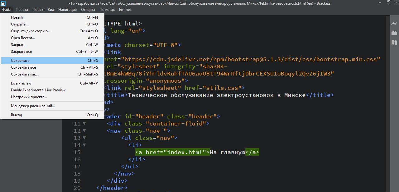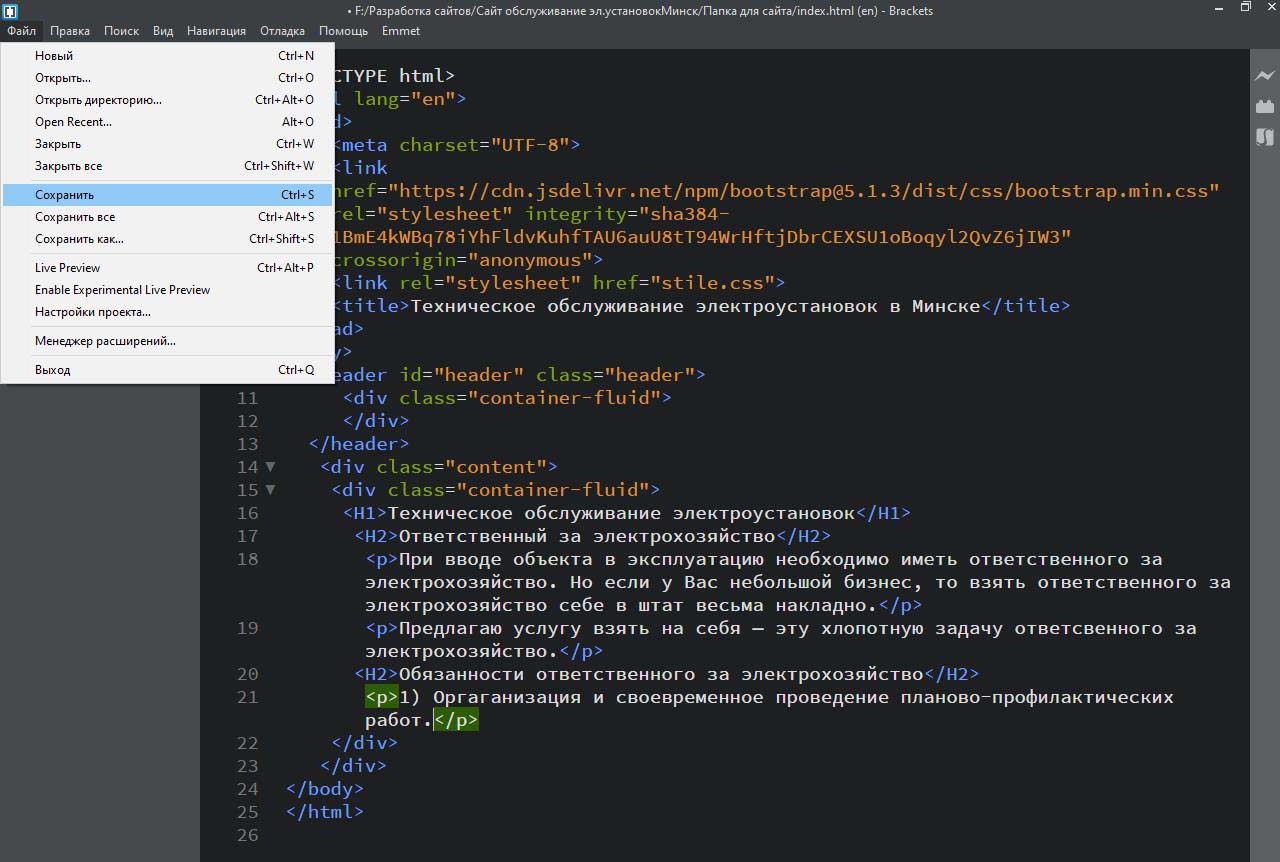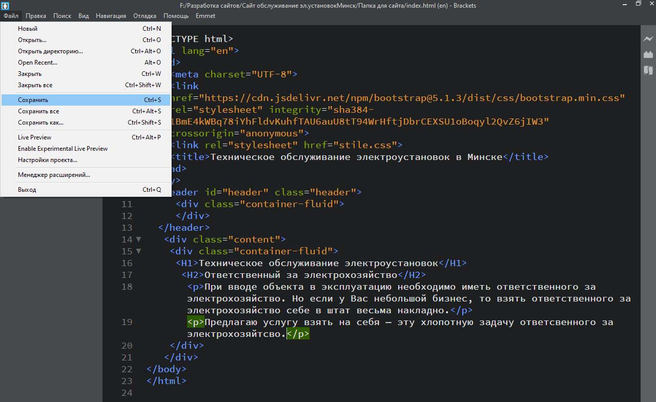 В файле index.html прописывем текст параграфа. Жмем сохранить.