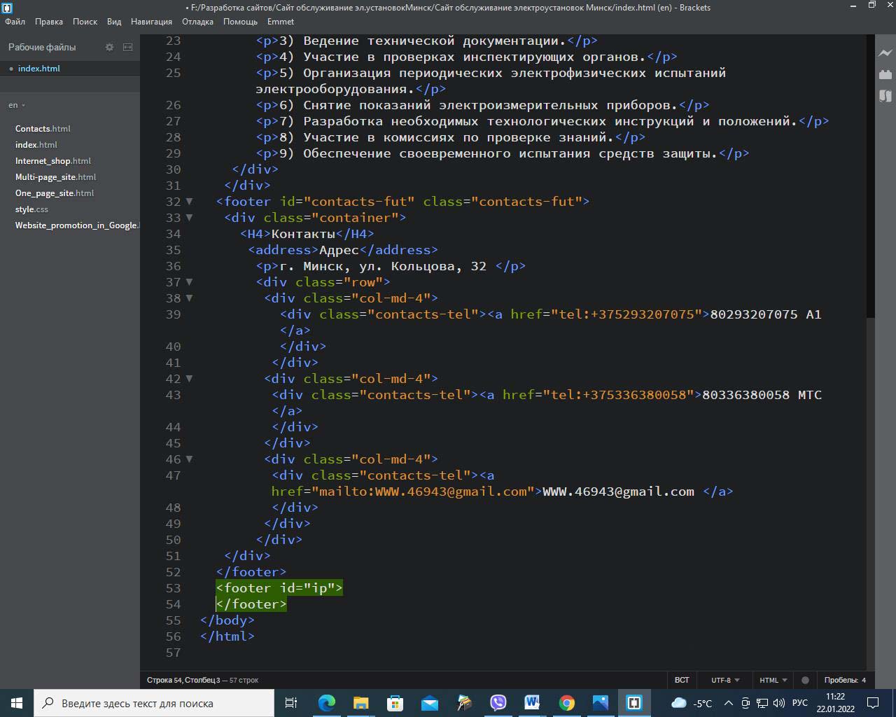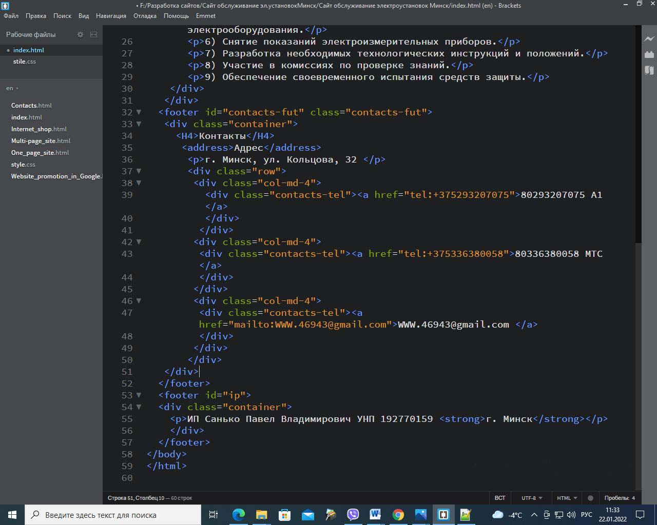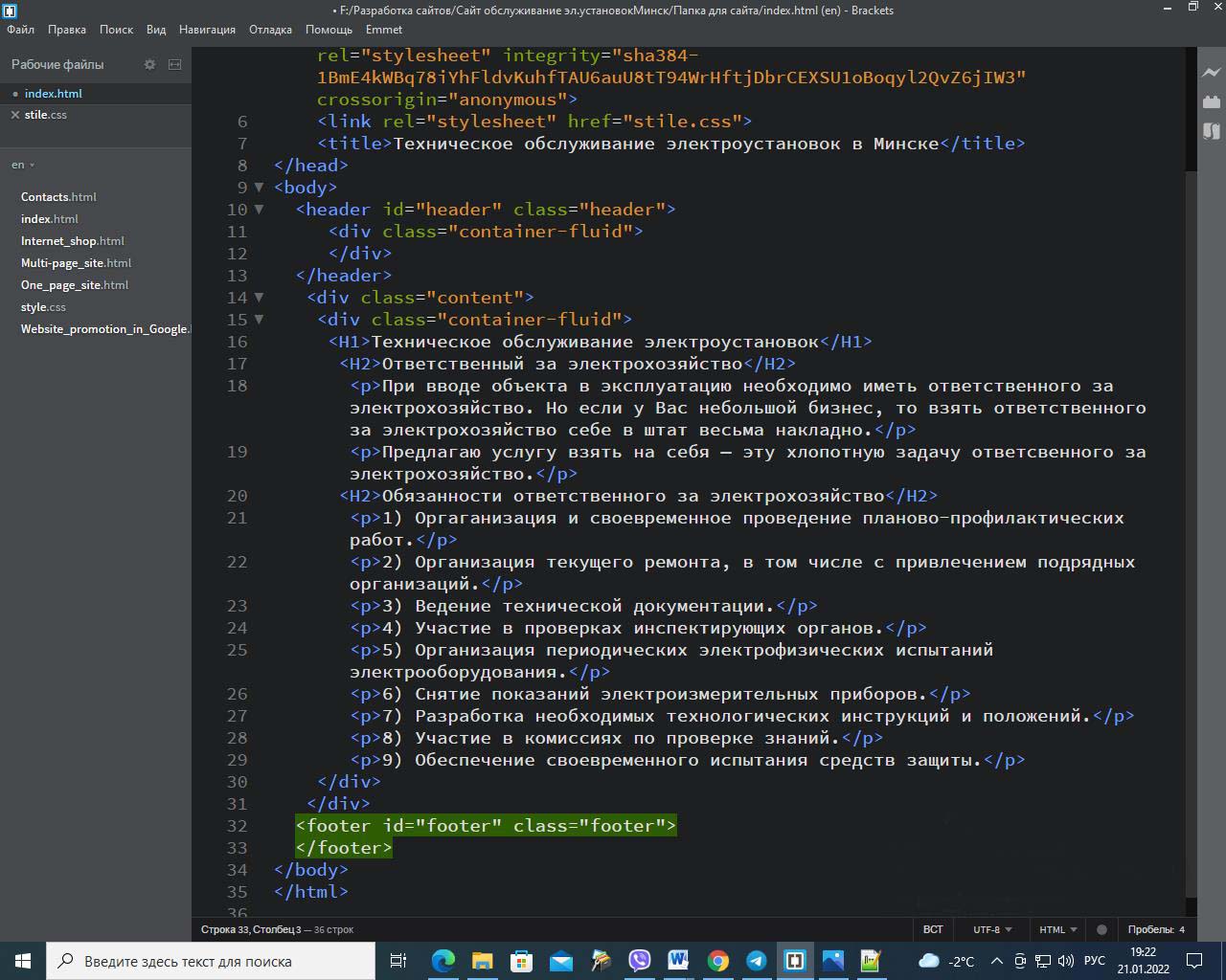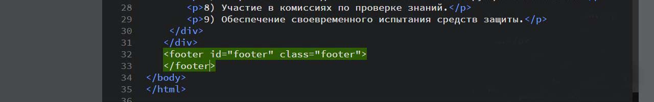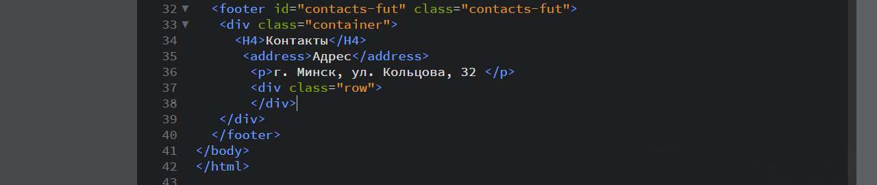 В файле index.html добавим разметку семантическими тегами html 5 footer для нижней части сайта где будут размещаться контактные данные.
