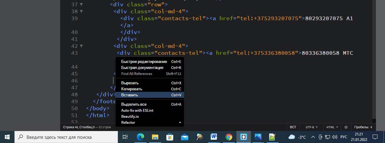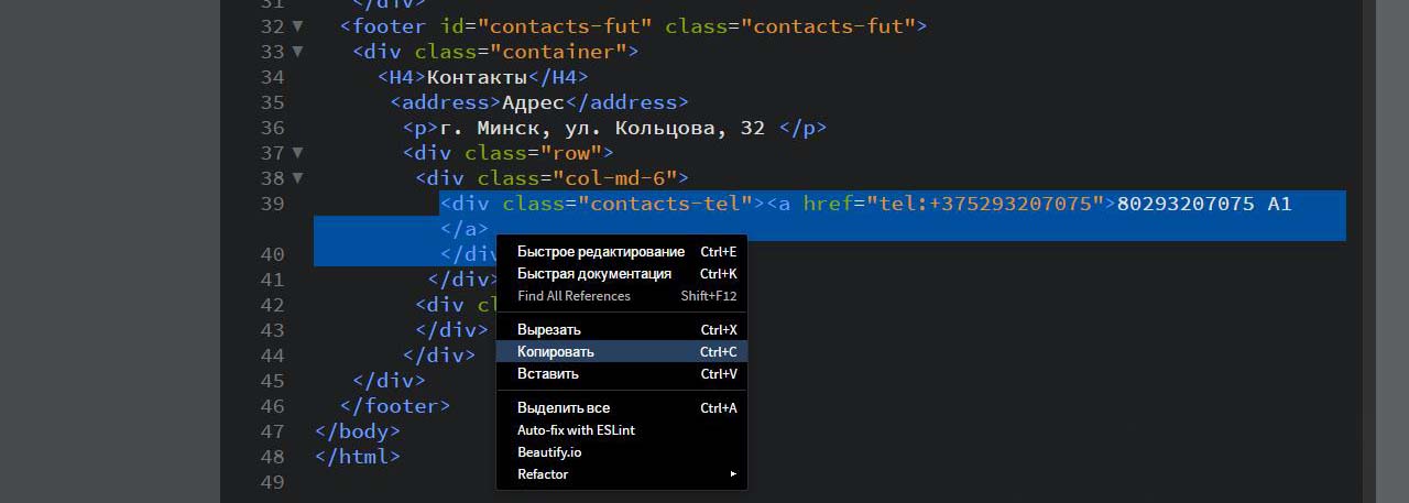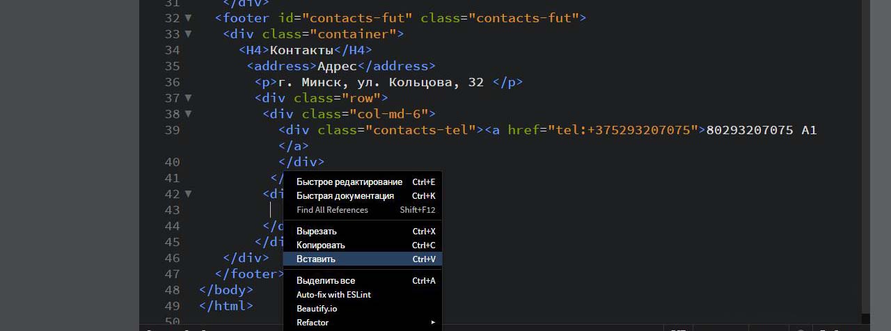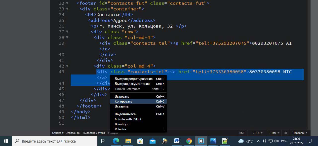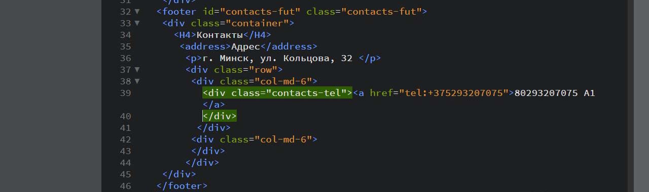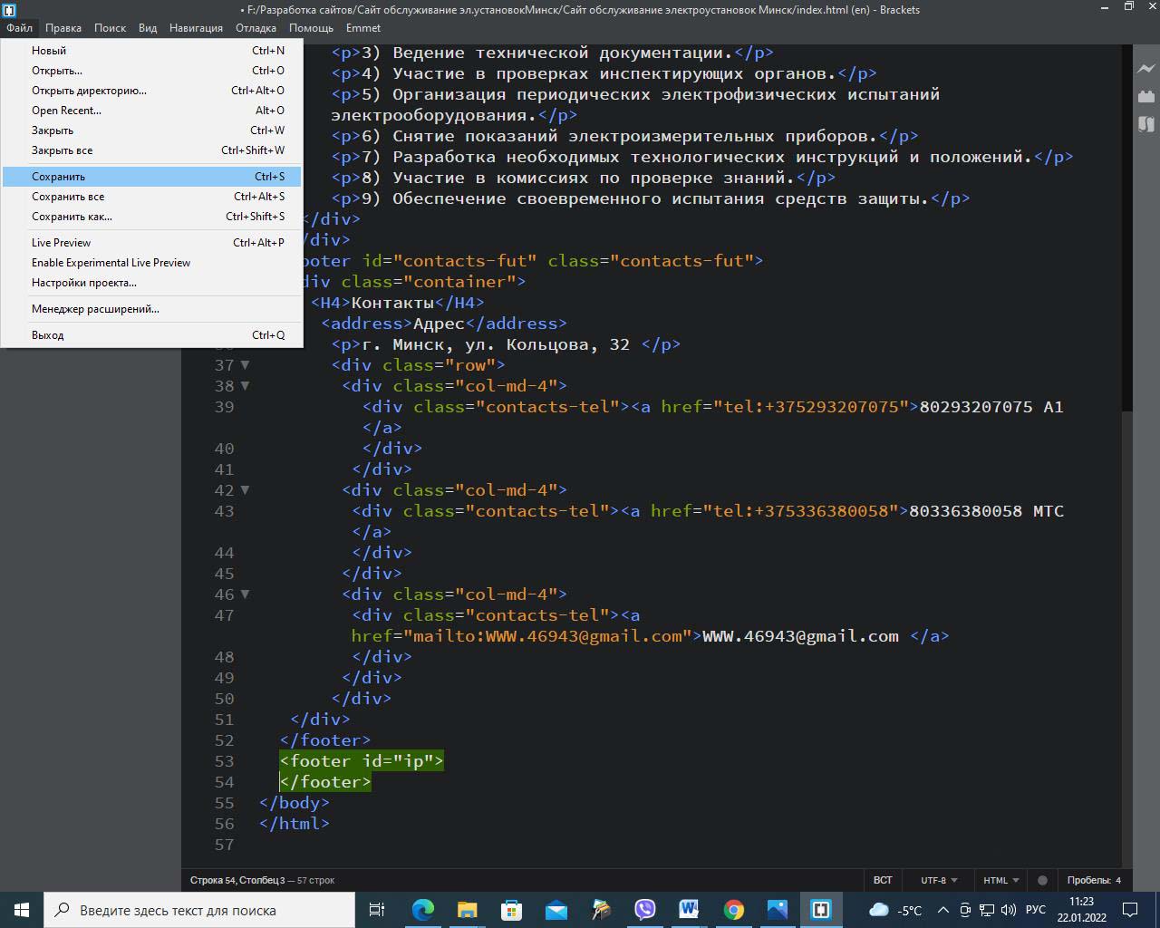 В файле index.html добавим разметку семантическими тегами html 5 footer для нижней части сайта где будут размещаться контактные данные.