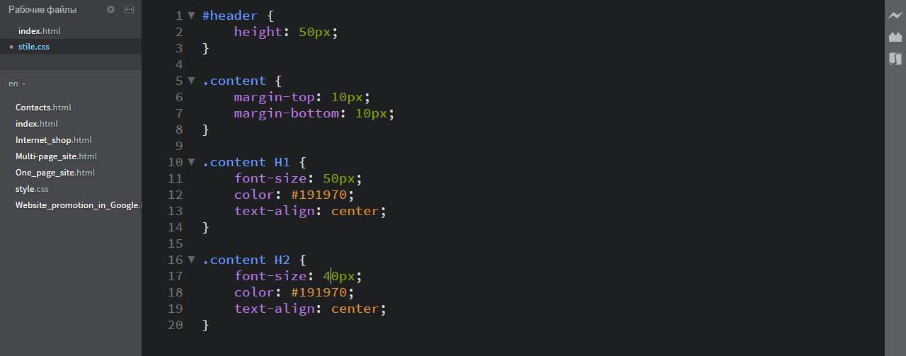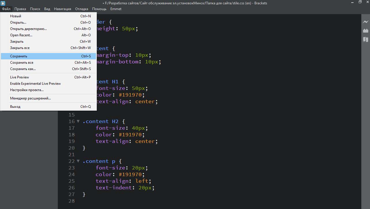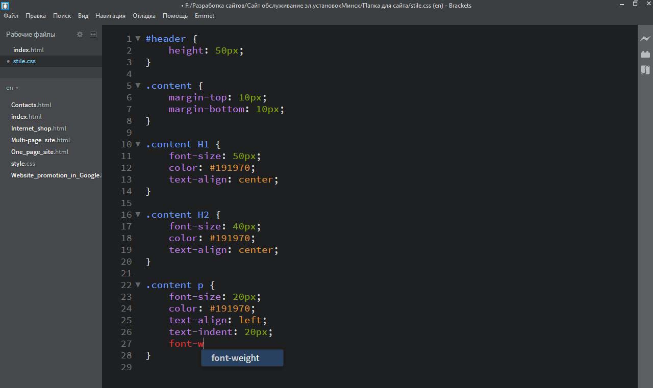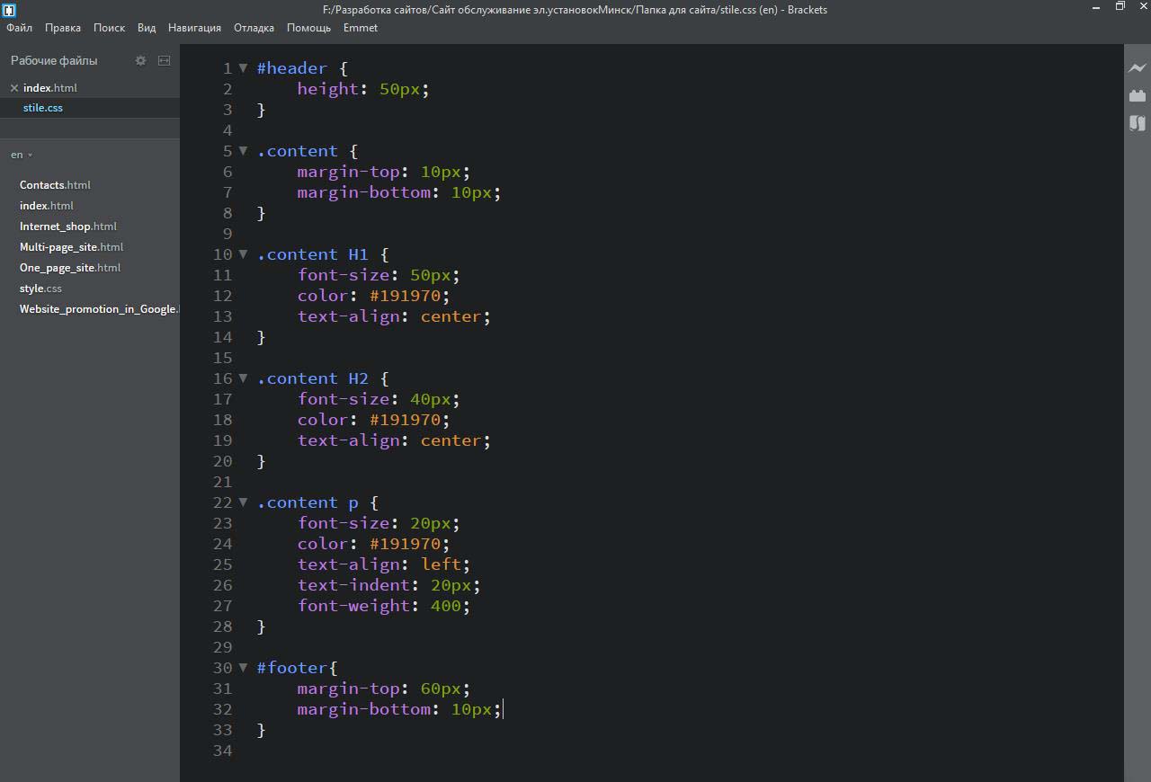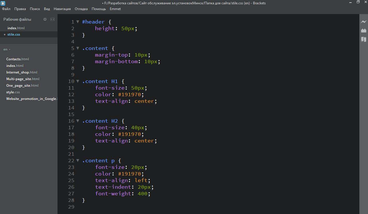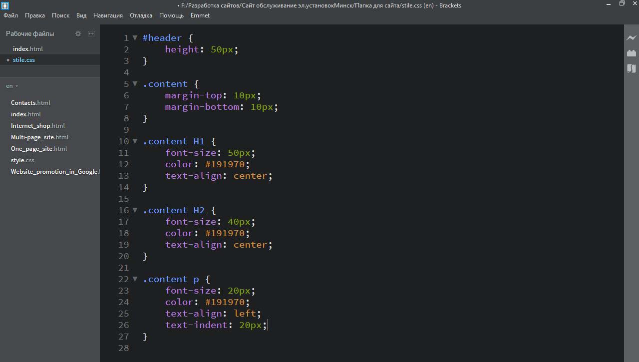 c привязкой к контентной части сайта начиная с новой строки ставим точку и печатаем content и через пробел H2 ставим фигурные скобки и между фигурными скобками печатаем font-zize двоеточие 40px (высота шрифта 40 пикселей) и ставим точку с запятой, color двоеточие пробел решетка и сразу числовое значение цвета взятое из таблицы цветов css в интернете и сразу ставим точку с запятой, с новой строки вводим text-align двоеточие и через пробел center (центрирование текста по центру) и ставим точку с запятой как показано на скриншоте с редактора кода Brackets. Созраняем изменения.