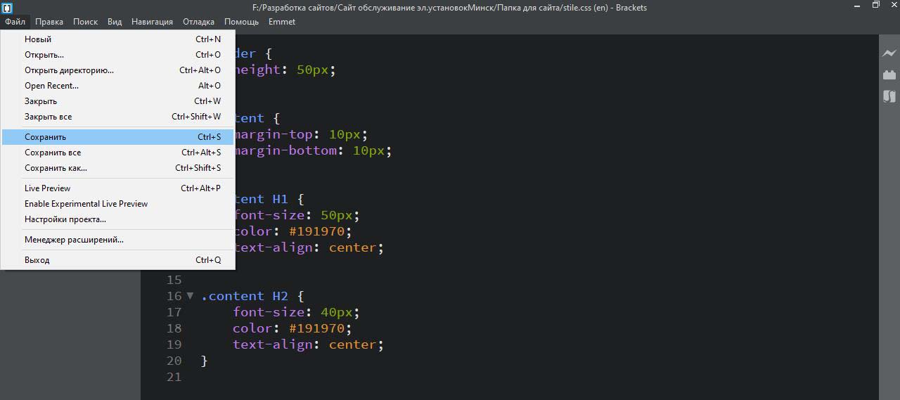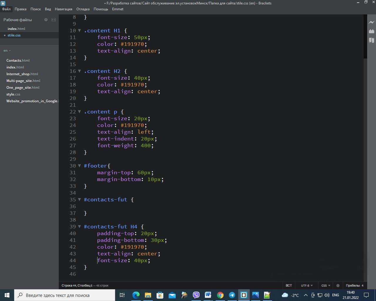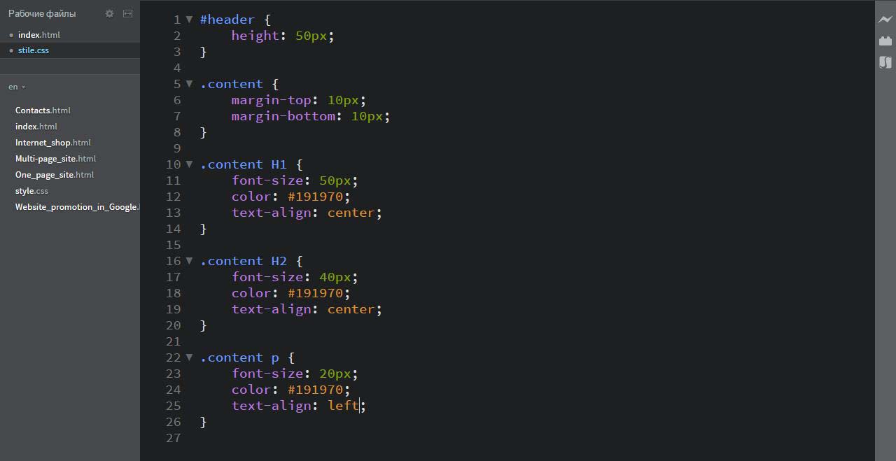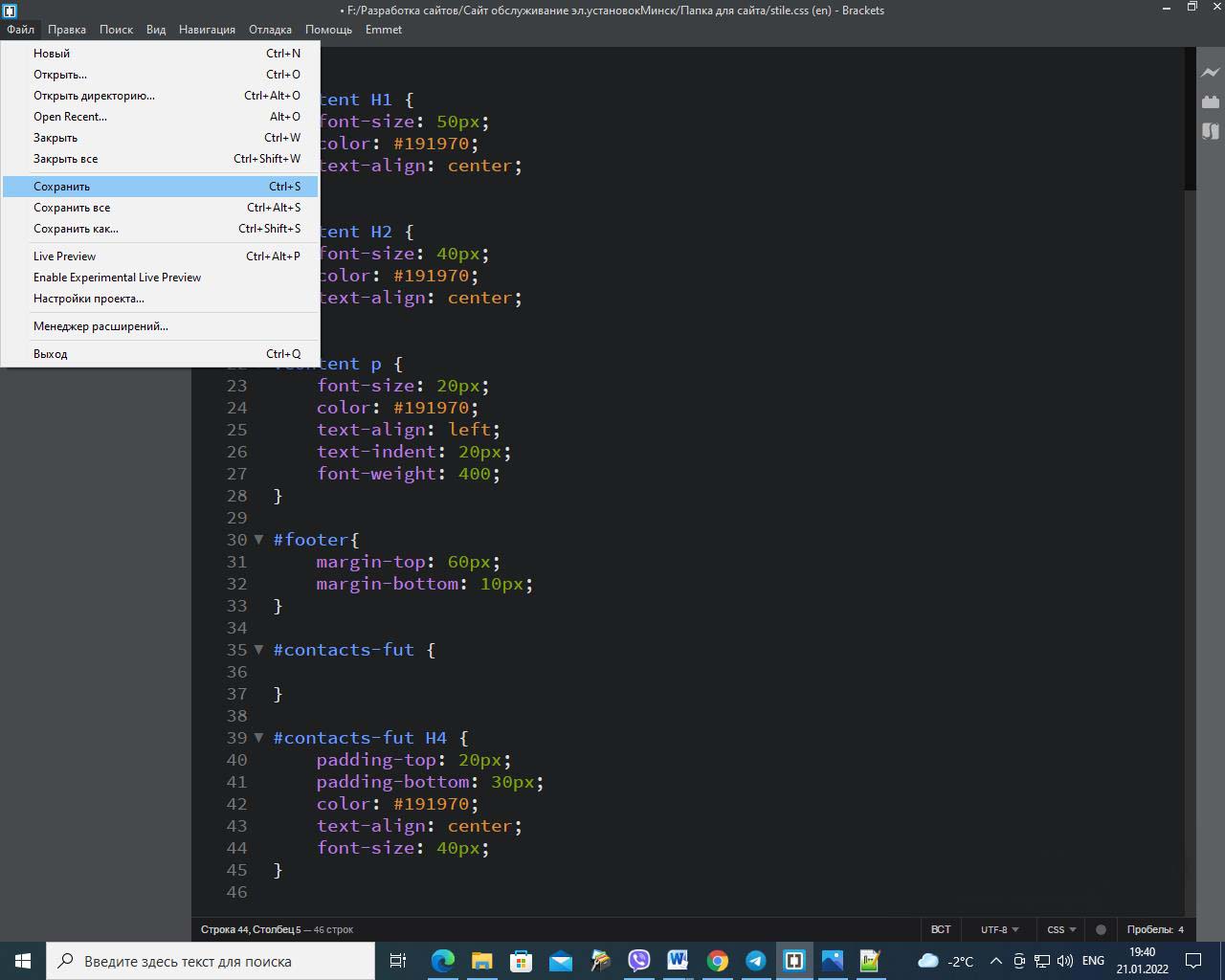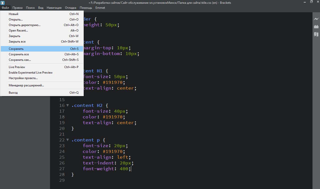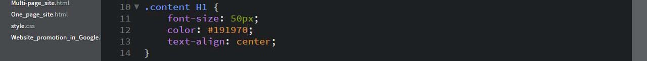 c привязкой к контентной части сайта начиная с новой строки ставим точку и печатаем content и через пробел H2 ставим фигурные скобки и между фигурными скобками печатаем font-zize двоеточие 40px (высота шрифта 40 пикселей) и ставим точку с запятой, color двоеточие пробел решетка и сразу числовое значение цвета взятое из таблицы цветов css в интернете и сразу ставим точку с запятой, с новой строки вводим text-align двоеточие и через пробел center (центрирование текста по центру) и ставим точку с запятой как показано на скриншоте с редактора кода Brackets. Созраняем изменения.