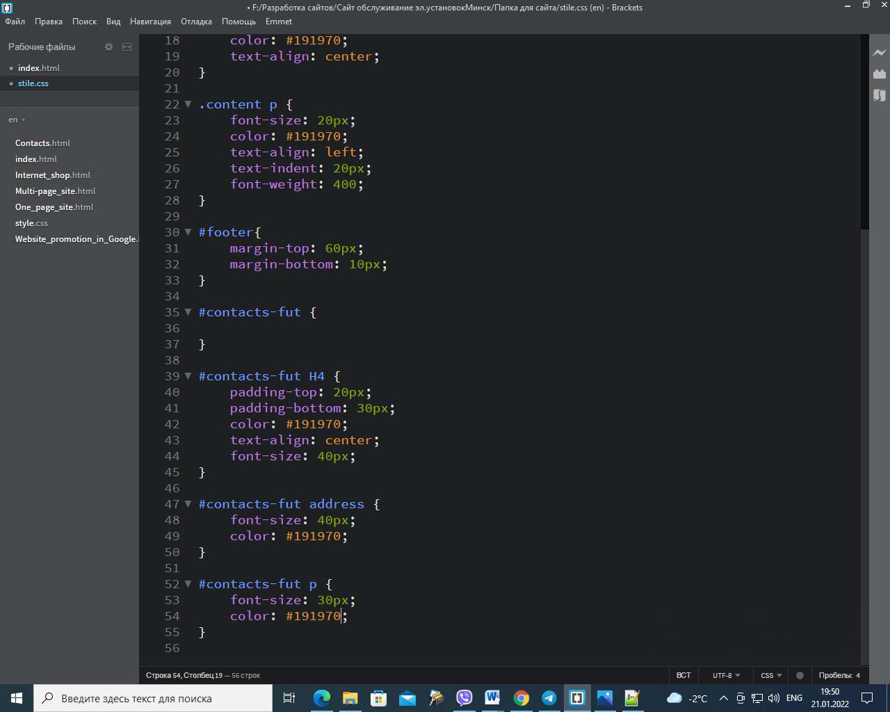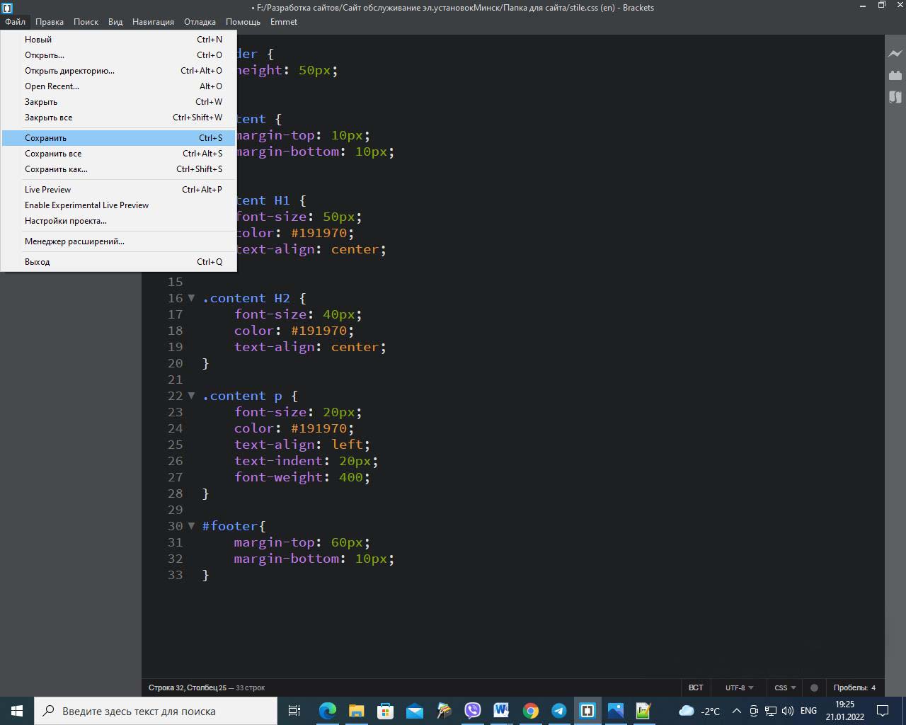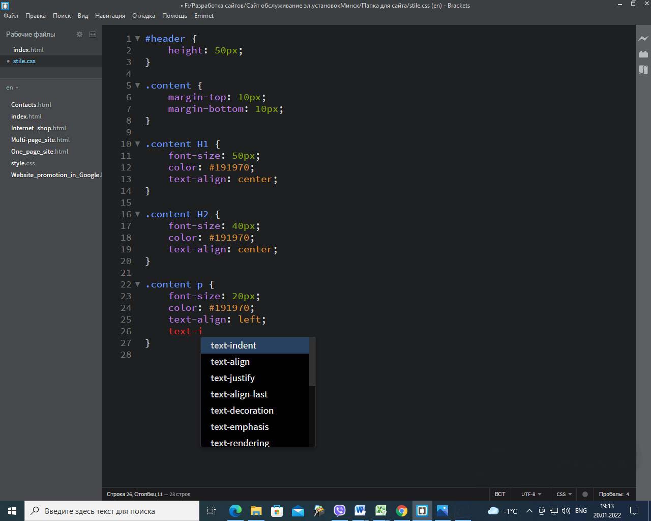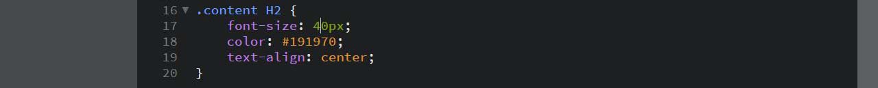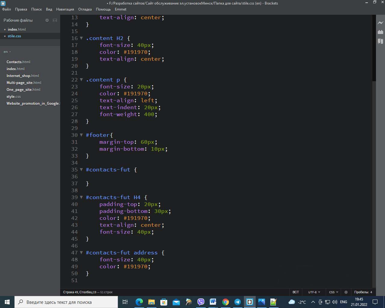 c привязкой к контентной части сайта начиная с новой строки ставим точку и печатаем content и через пробел H2 ставим фигурные скобки и между фигурными скобками печатаем font-zize двоеточие 40px (высота шрифта 40 пикселей) и ставим точку с запятой, color двоеточие пробел решетка и сразу числовое значение цвета взятое из таблицы цветов css в интернете и сразу ставим точку с запятой, с новой строки вводим text-align двоеточие и через пробел center (центрирование текста по центру) и ставим точку с запятой как показано на скриншоте с редактора кода Brackets. Созраняем изменения.