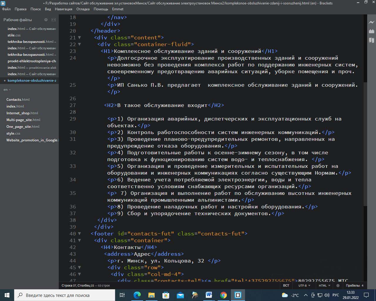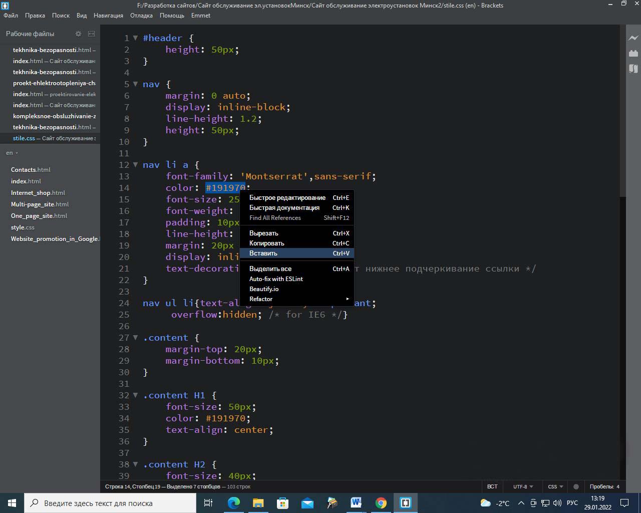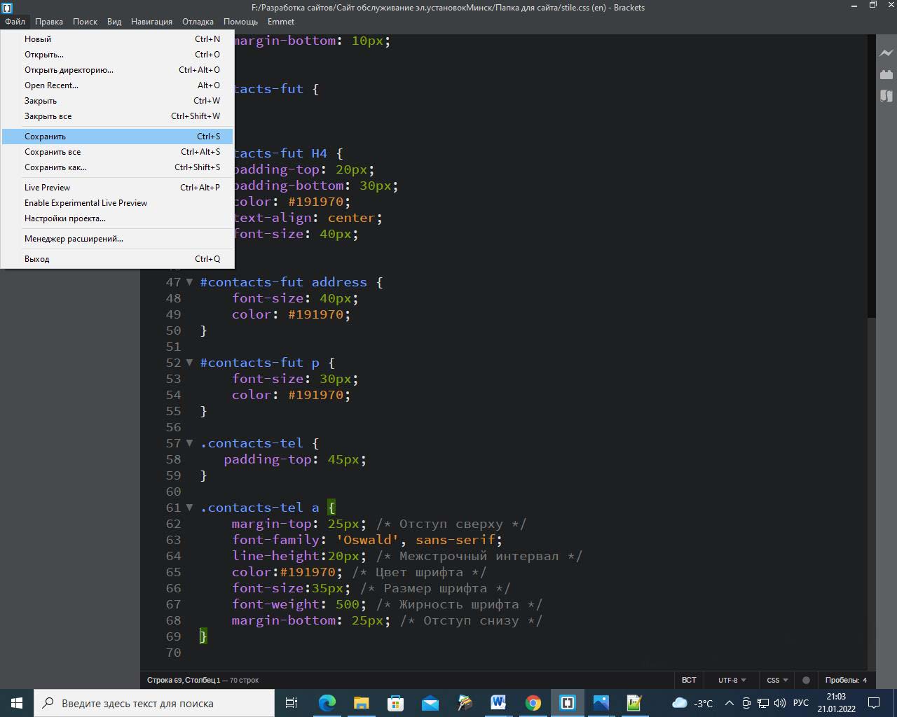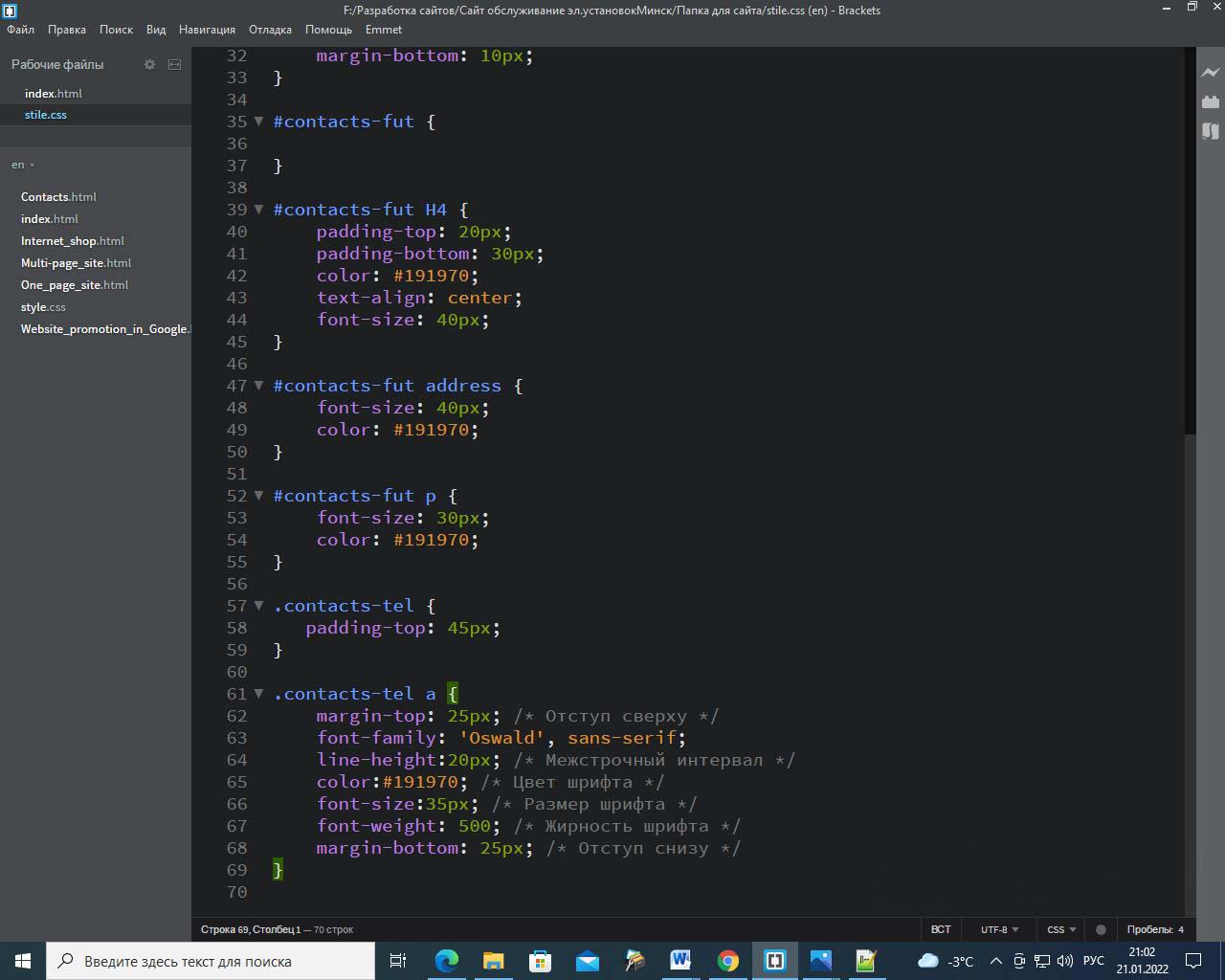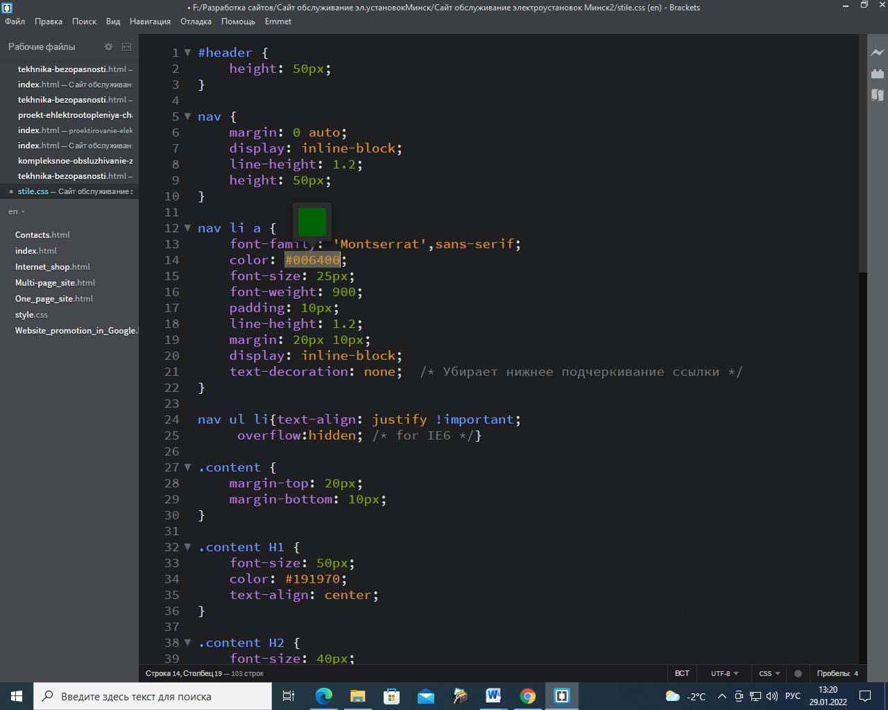 c привязкой к контентной части сайта начиная с новой строки ставим точку и печатаем content и через пробел H2 ставим фигурные скобки и между фигурными скобками печатаем font-zize двоеточие 40px (высота шрифта 40 пикселей) и ставим точку с запятой, color двоеточие пробел решетка и сразу числовое значение цвета взятое из таблицы цветов css в интернете и сразу ставим точку с запятой, с новой строки вводим text-align двоеточие и через пробел center (центрирование текста по центру) и ставим точку с запятой как показано на скриншоте с редактора кода Brackets. Созраняем изменения.