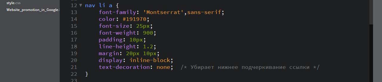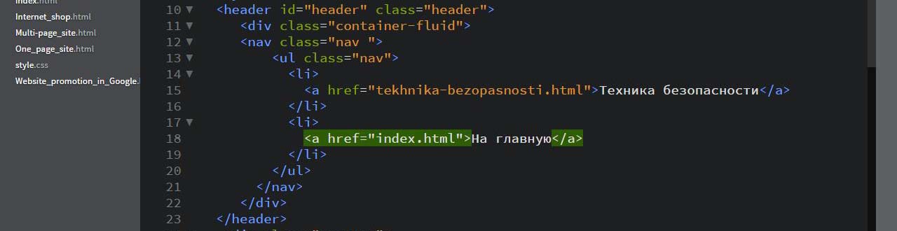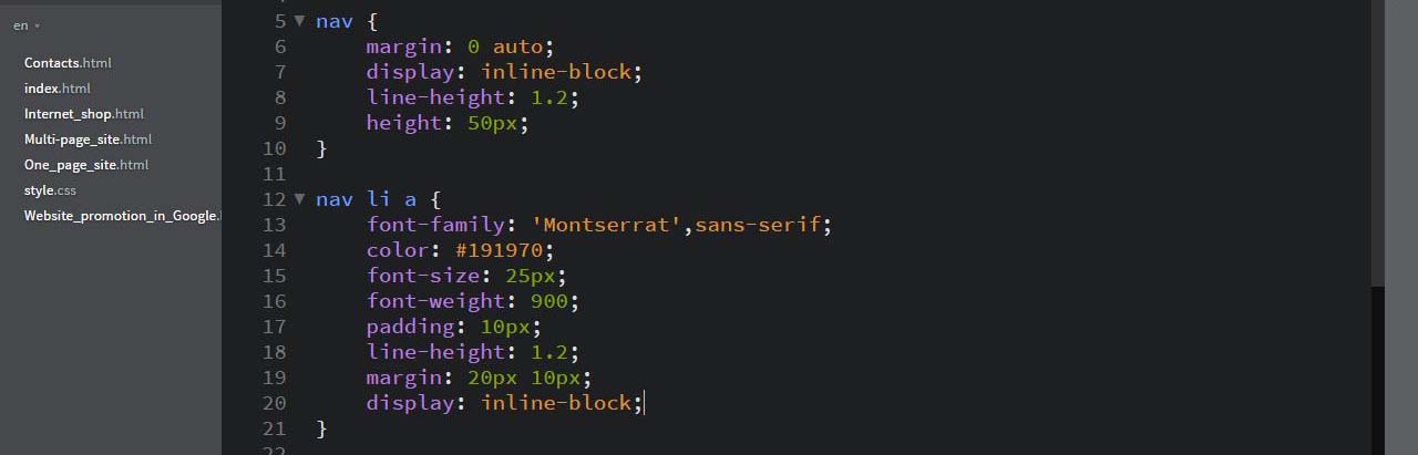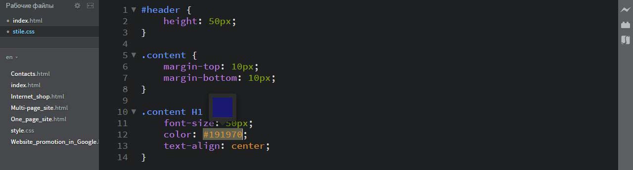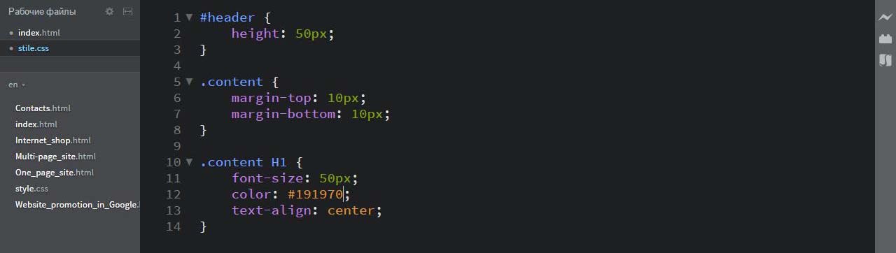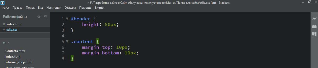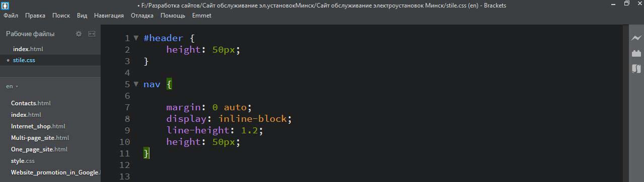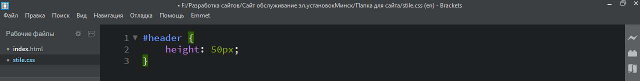 Во вкладке с рабочими файлами выберем файл stile.css. Напишем высоту верхней части сайта, называемой хэдером. Зададим его с помощью идентификатора # и тега HTML5 header. Между фигурными скобками пишем haight что означает высота и после двоеточия указываем значение 50px пикселей. Ставим точку с запятой.