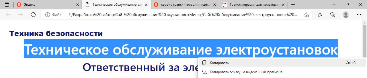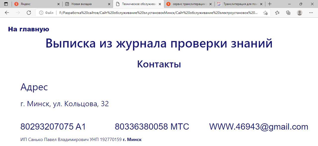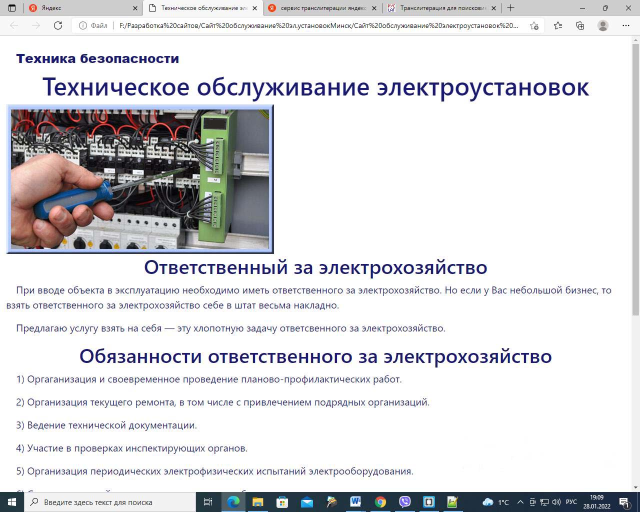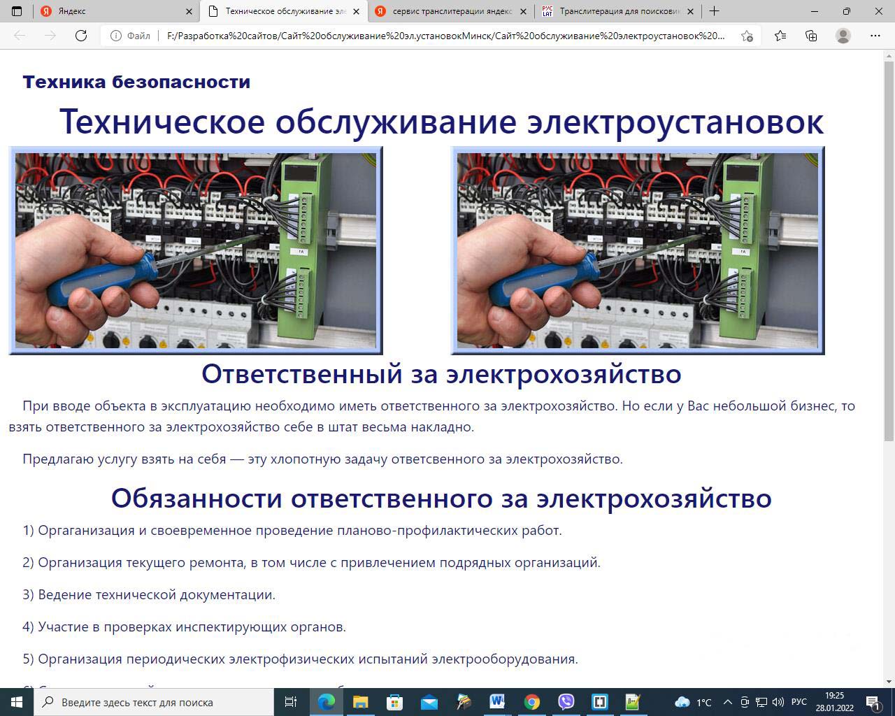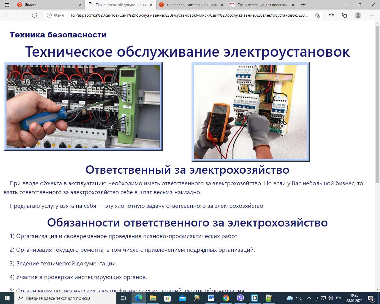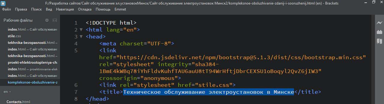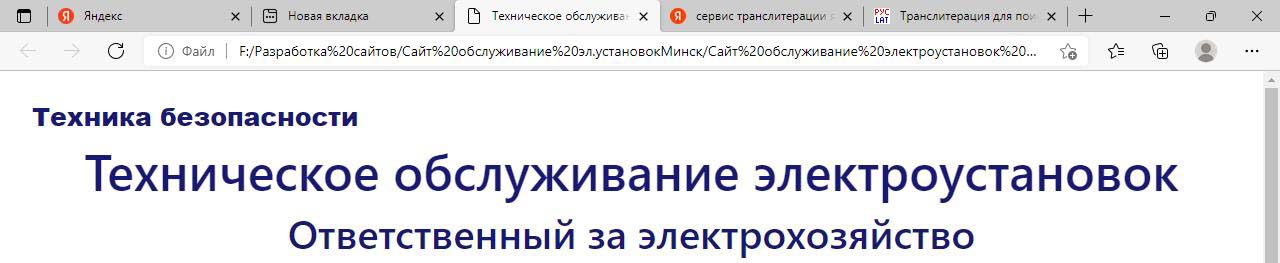 Между тегами title напишем более подходящий заголовок для поисковой выдачи "Техническое обслуживание электроустановок в Минске".