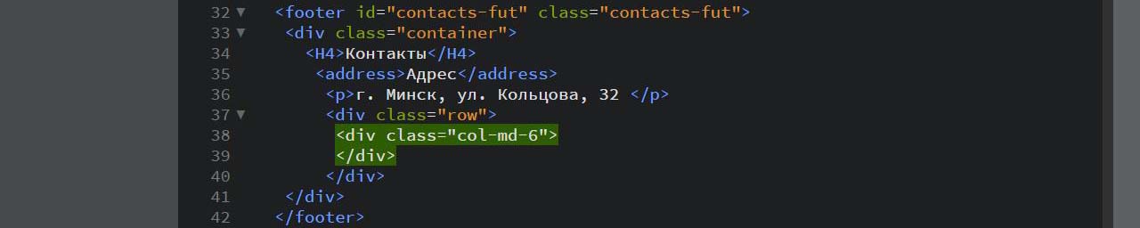 В файле index.html между тегами футера вставим контейнер с бутстрап.