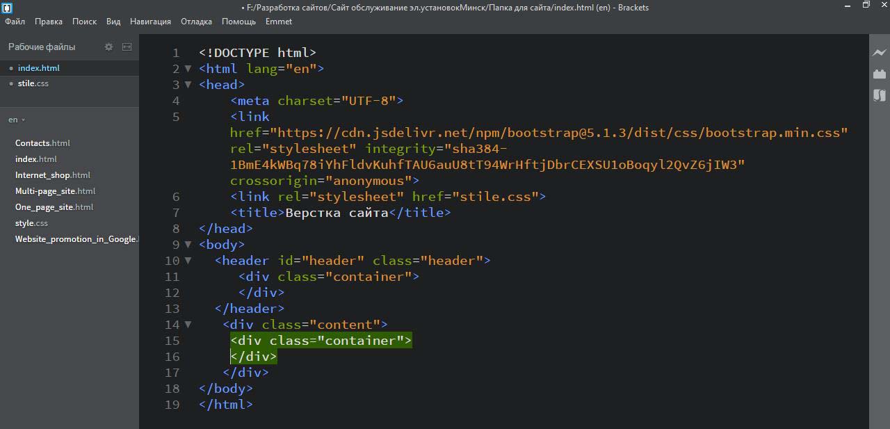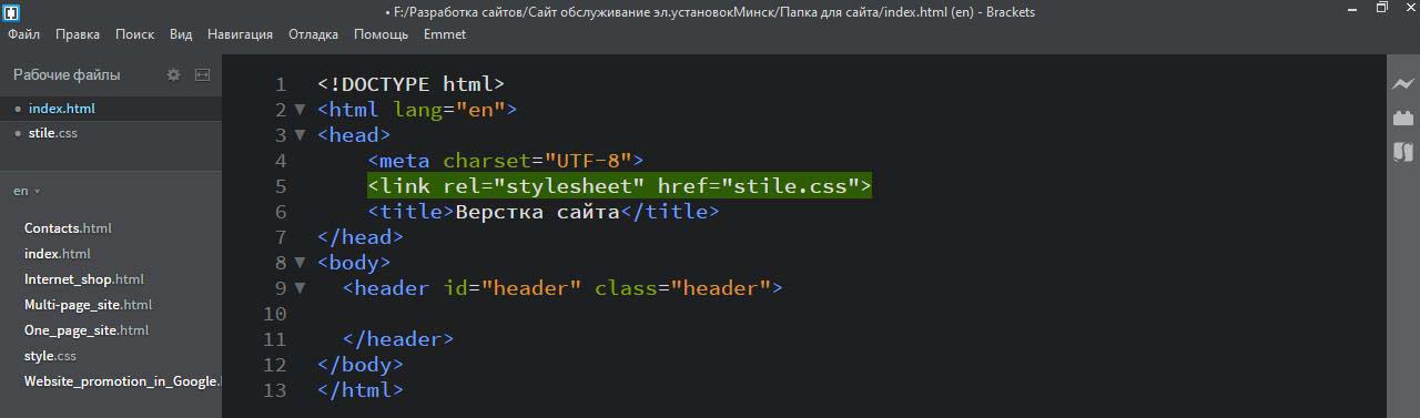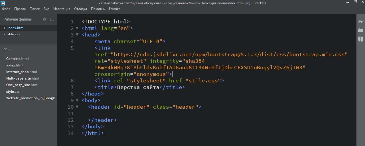 В файле index.html между тегами title укажем заголовок для поисковых систем "Верстка сайта", который также отображается во вкладке бразера.