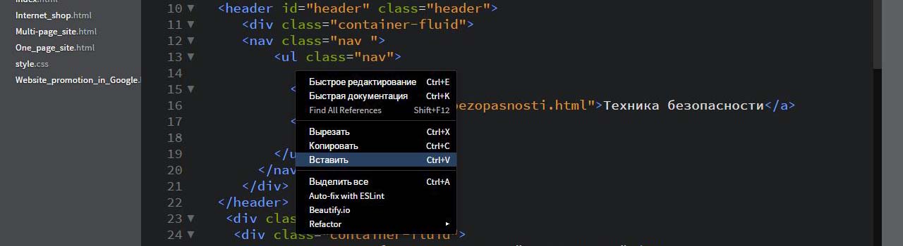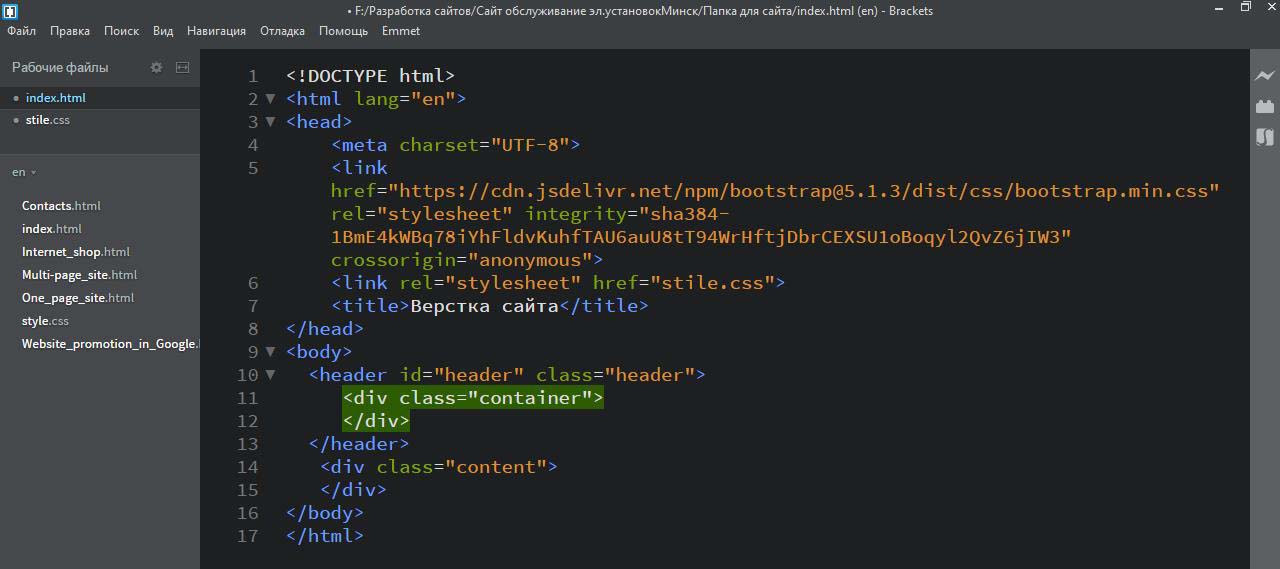 В header пропишем контейнер с бутстрап класс conteiner, который в дальнейшем будет ограничивать содержимое страницы по ширине так чтобы оно не вылазило за пределы экрана.