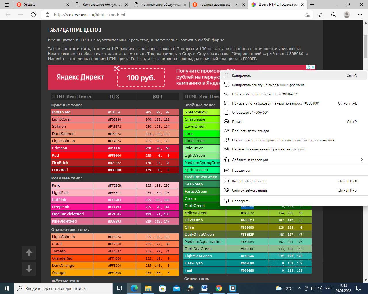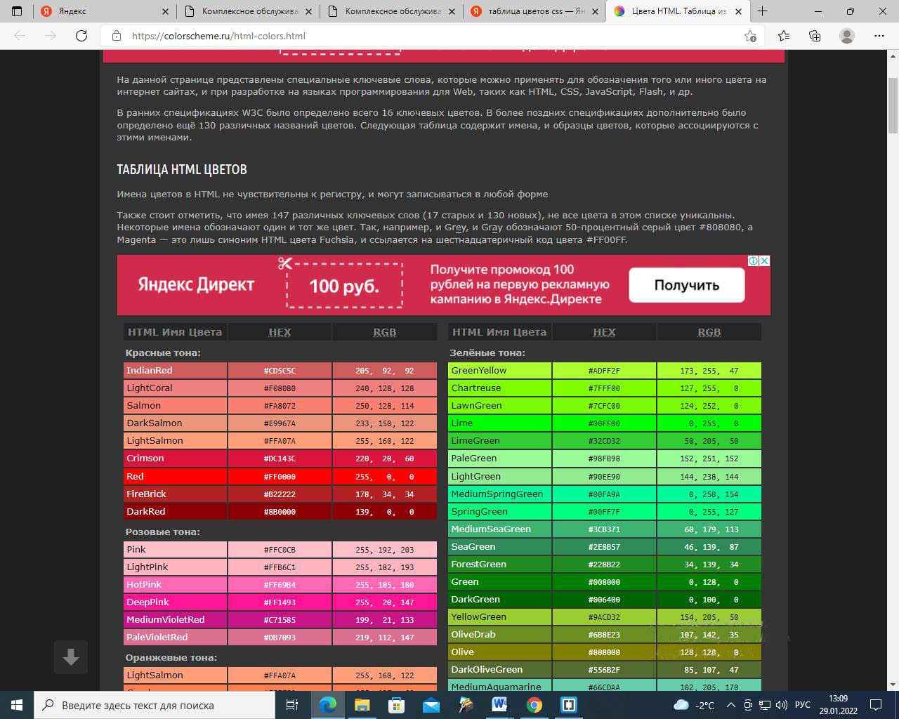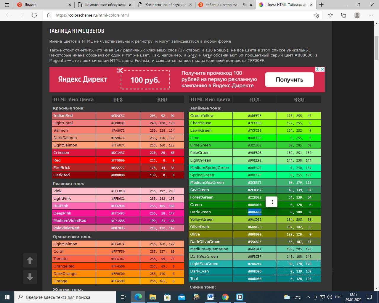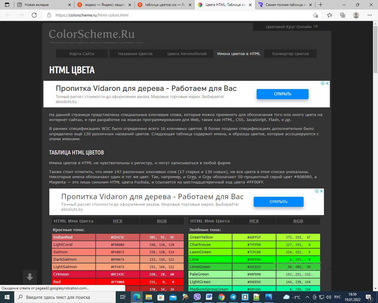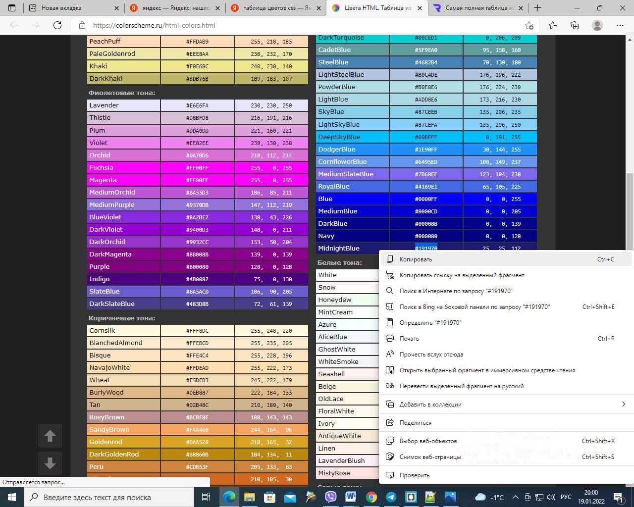 Подключим цвета css. В Яндексе набираем таблица цветов css.