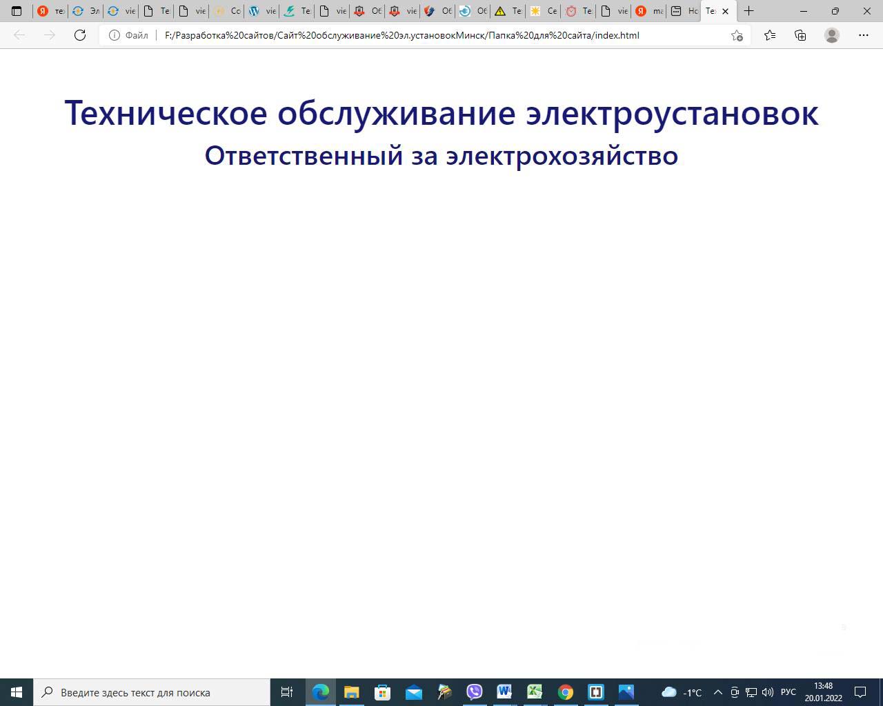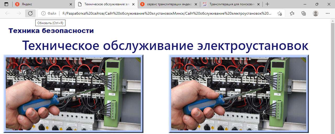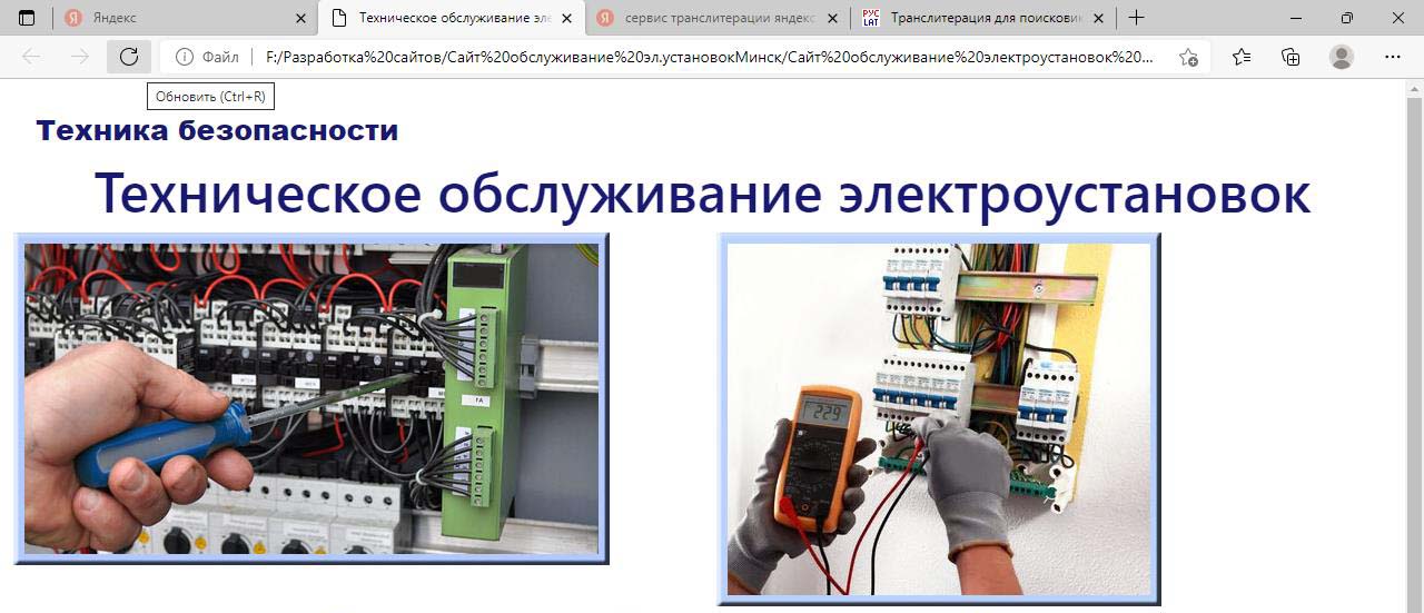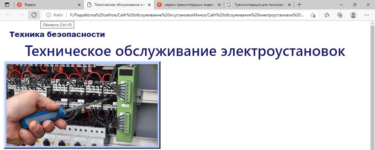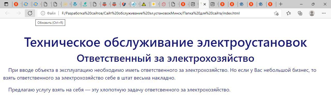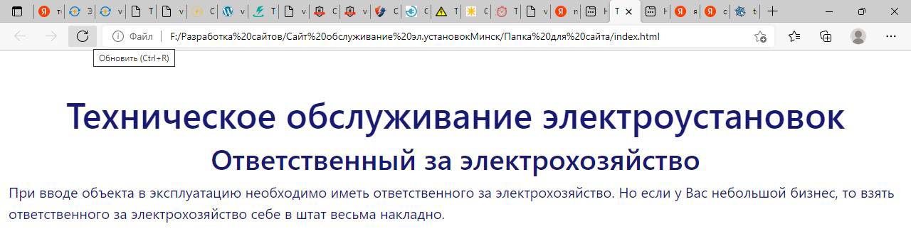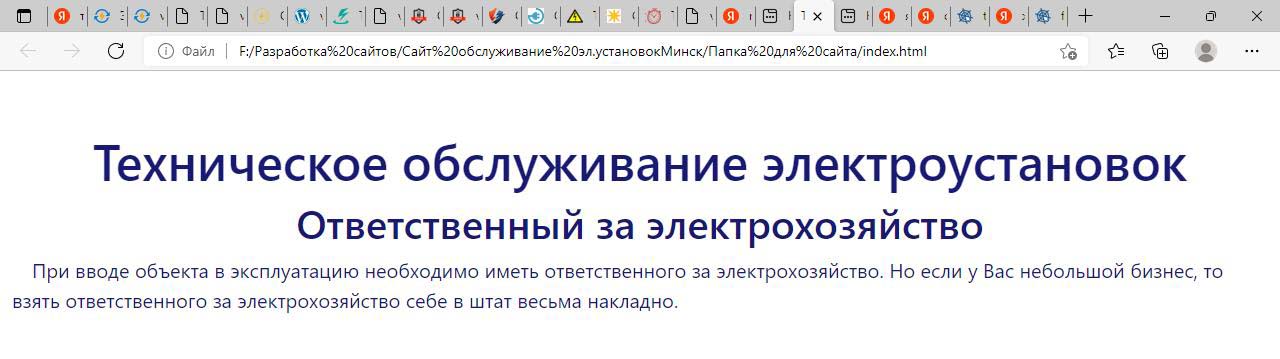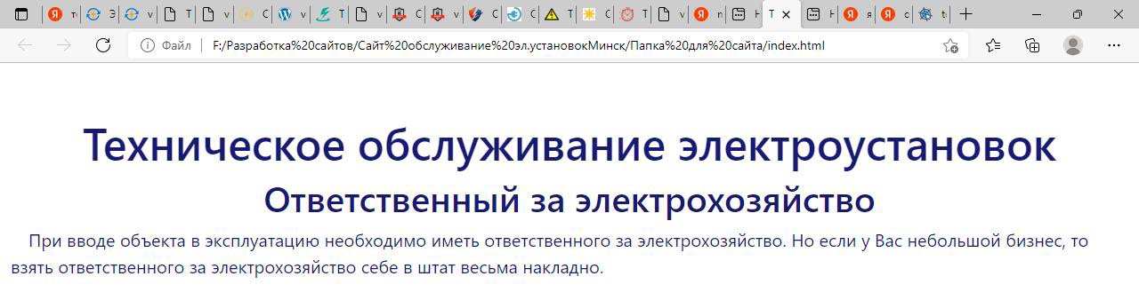 Он откроется в браузере по умолчанию и мы увидим на экране заголовок страницы техническое обслуживание электроустановок с отступом сверху, высотой текста 50px и выравниванием текста по центру заданными в файле css.