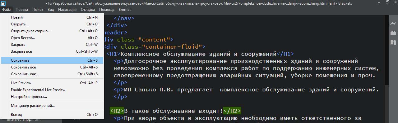 В файле index.html пропишем подзаголовок страницы H2. Нажмем сохранить.