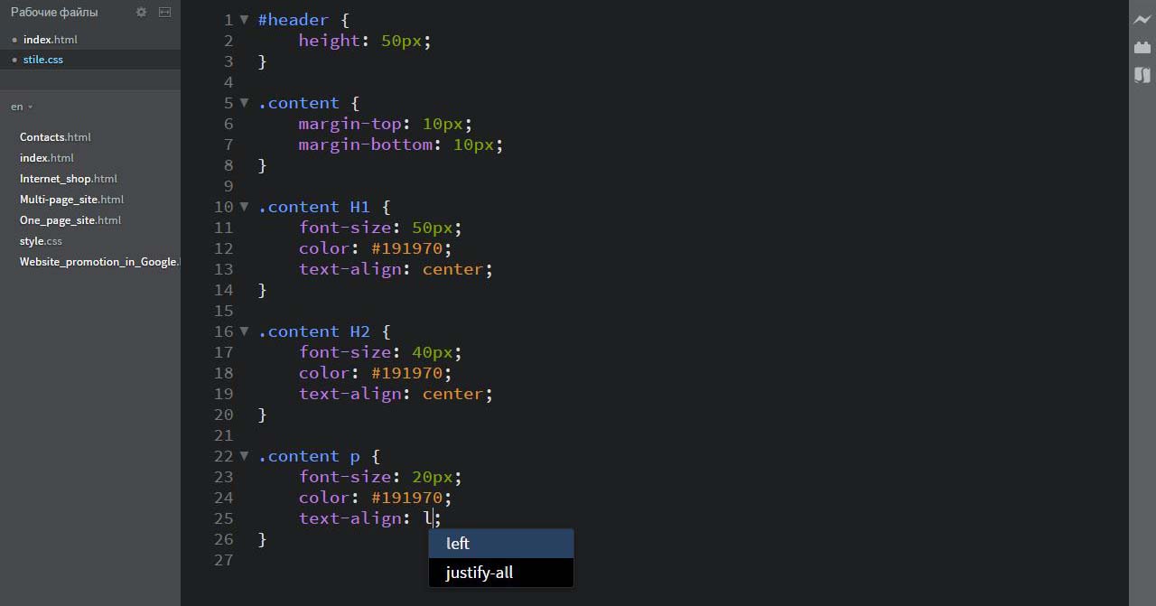 Создадим css стили для заголовка страницы H1: размер шрифта 50px, цвет темно-синий, выравнивание текста по центру.