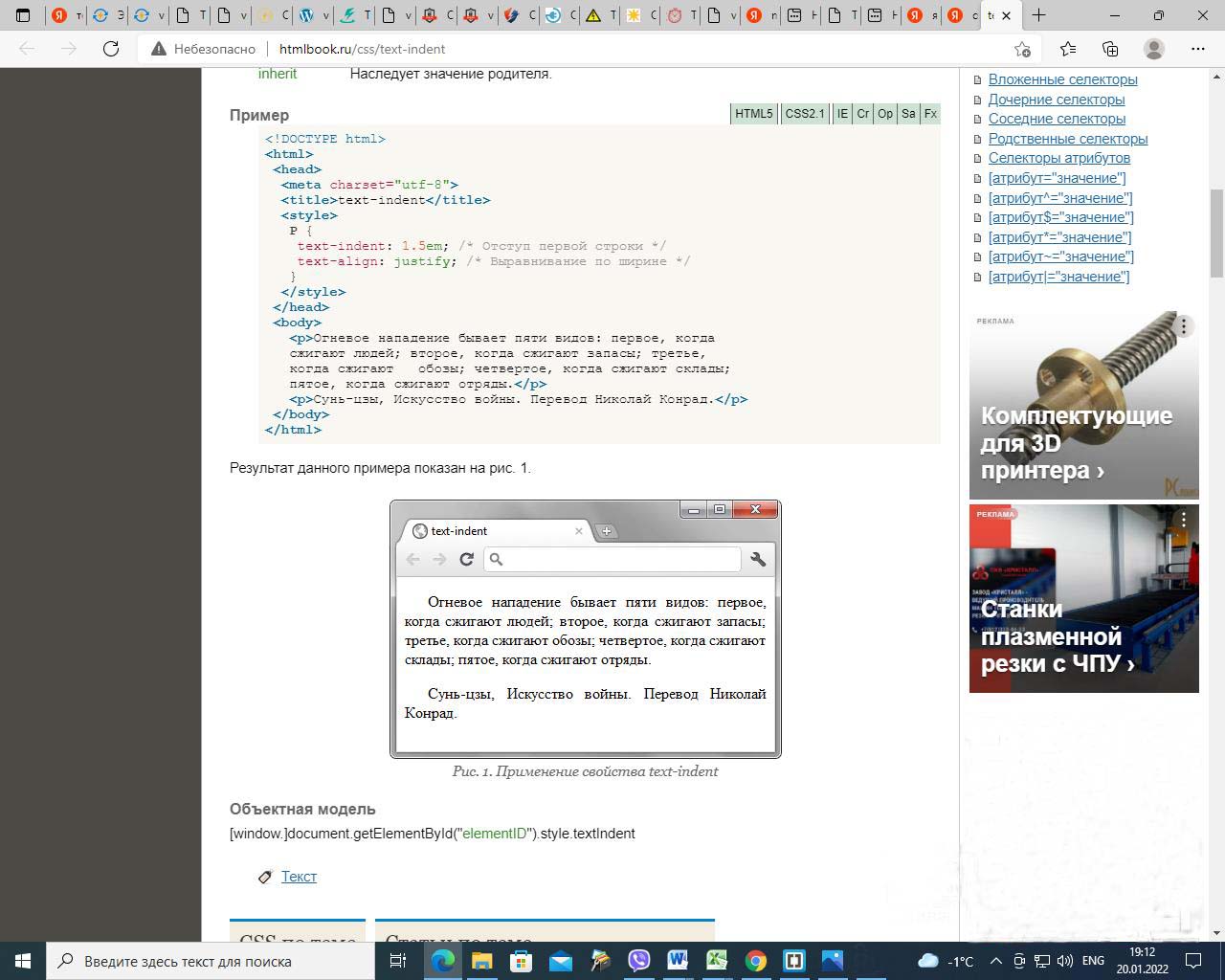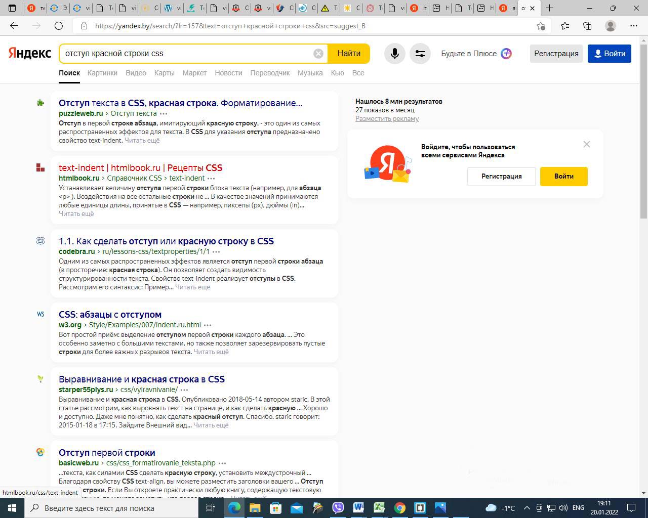Теперь сделаем отступ красной строки. Набираем в яндекс отступ красной строки css и окрываем учебник.