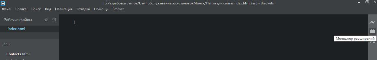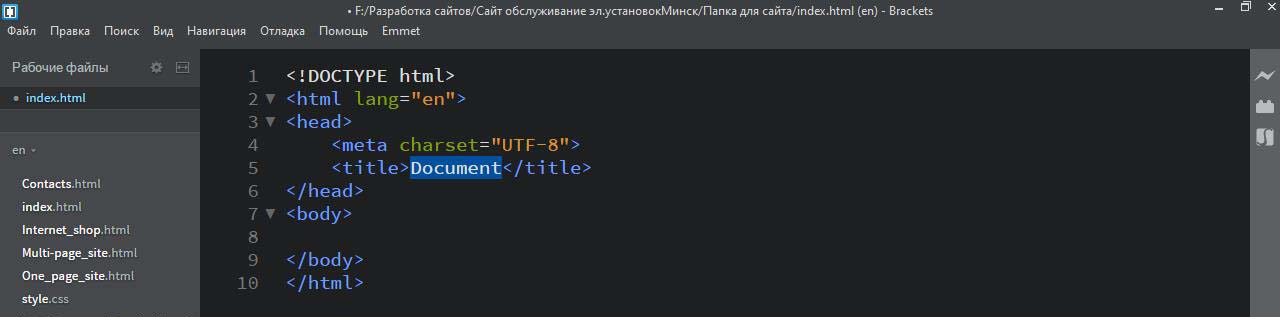 Сохраняем под названием index.html. Теперь в списке файлов появился файл главной страницы сайта index с расширением html. Для быстрого написания кода установим плагин Emmet.