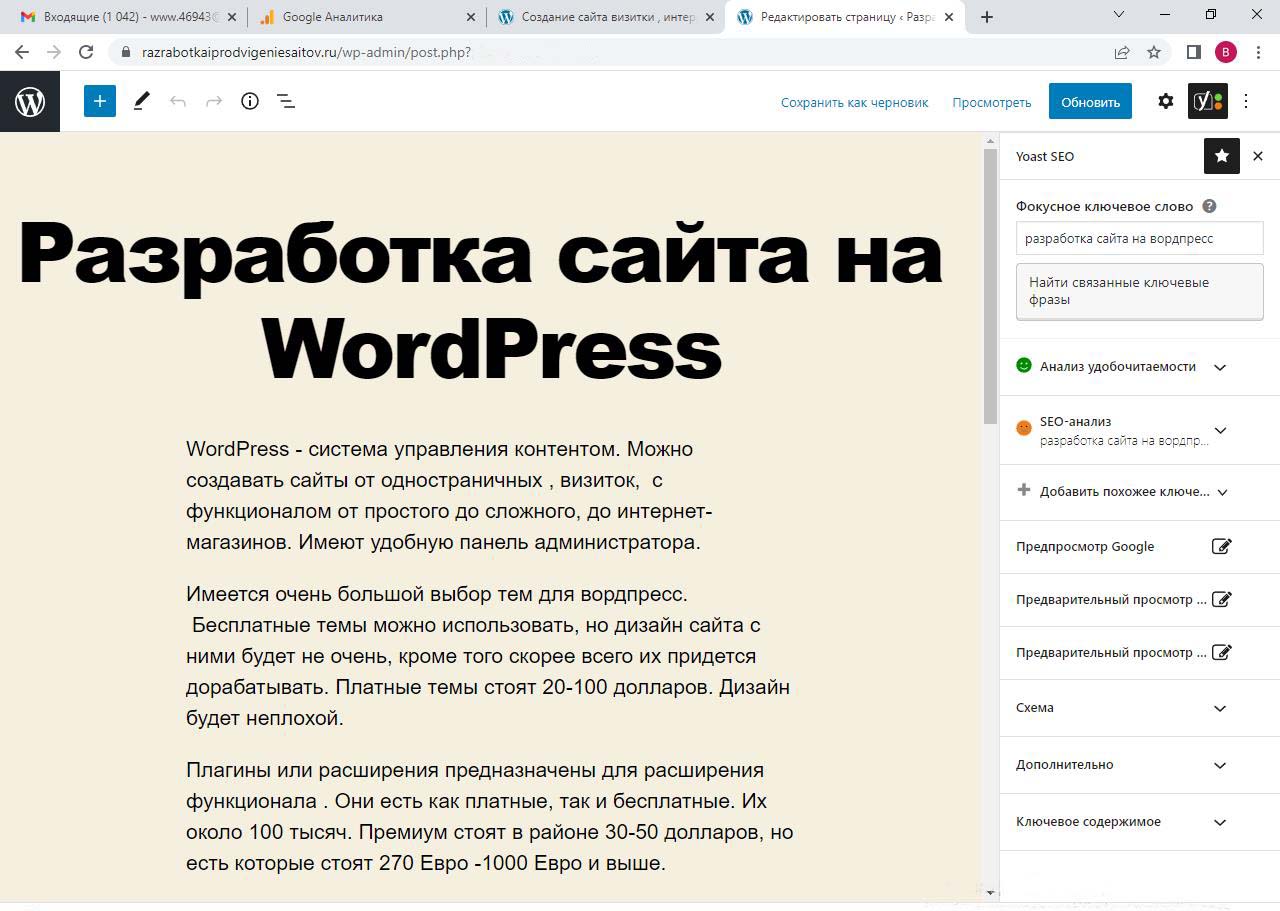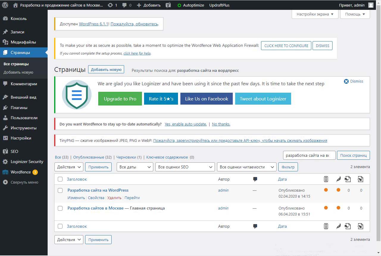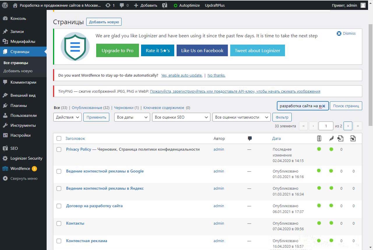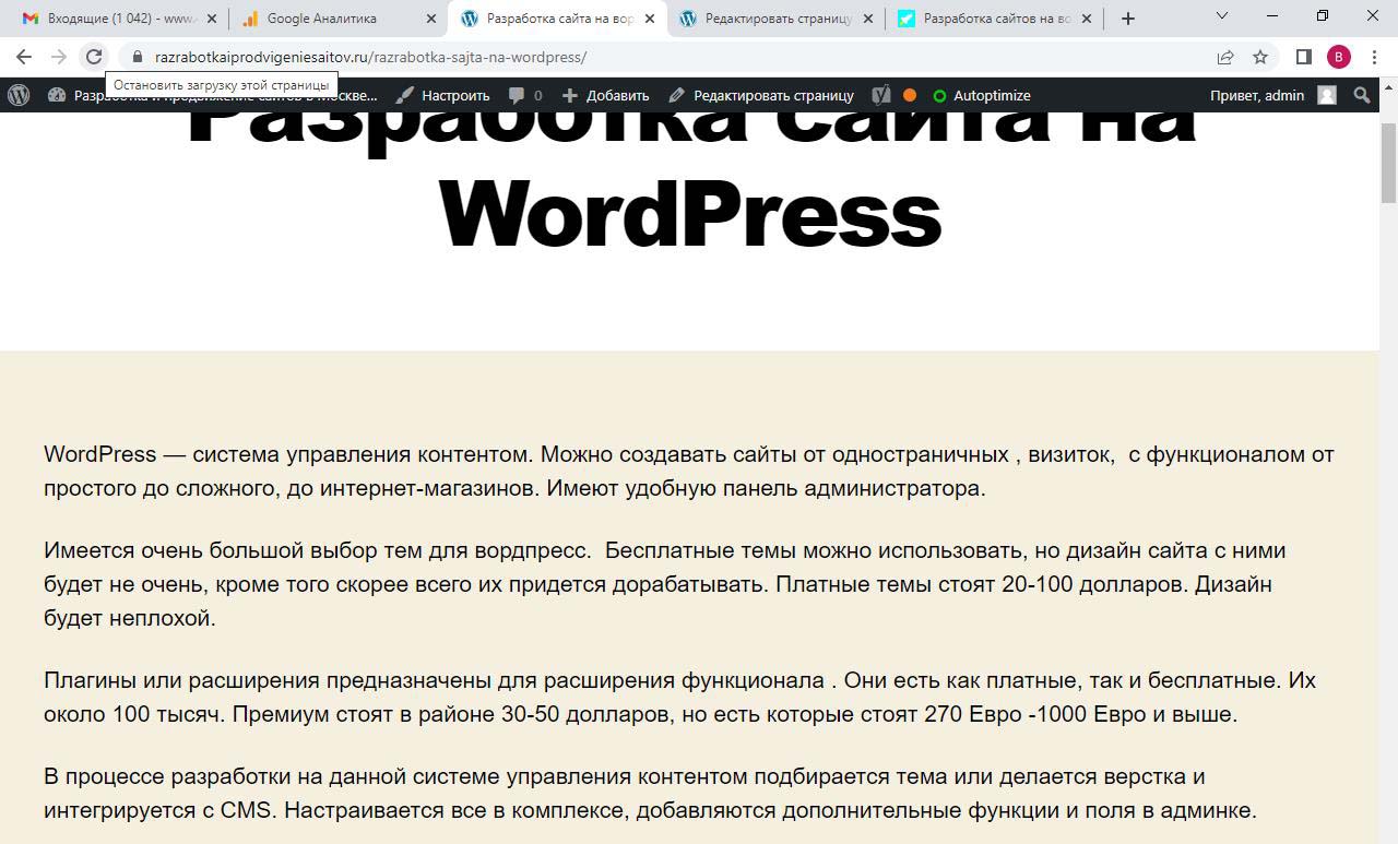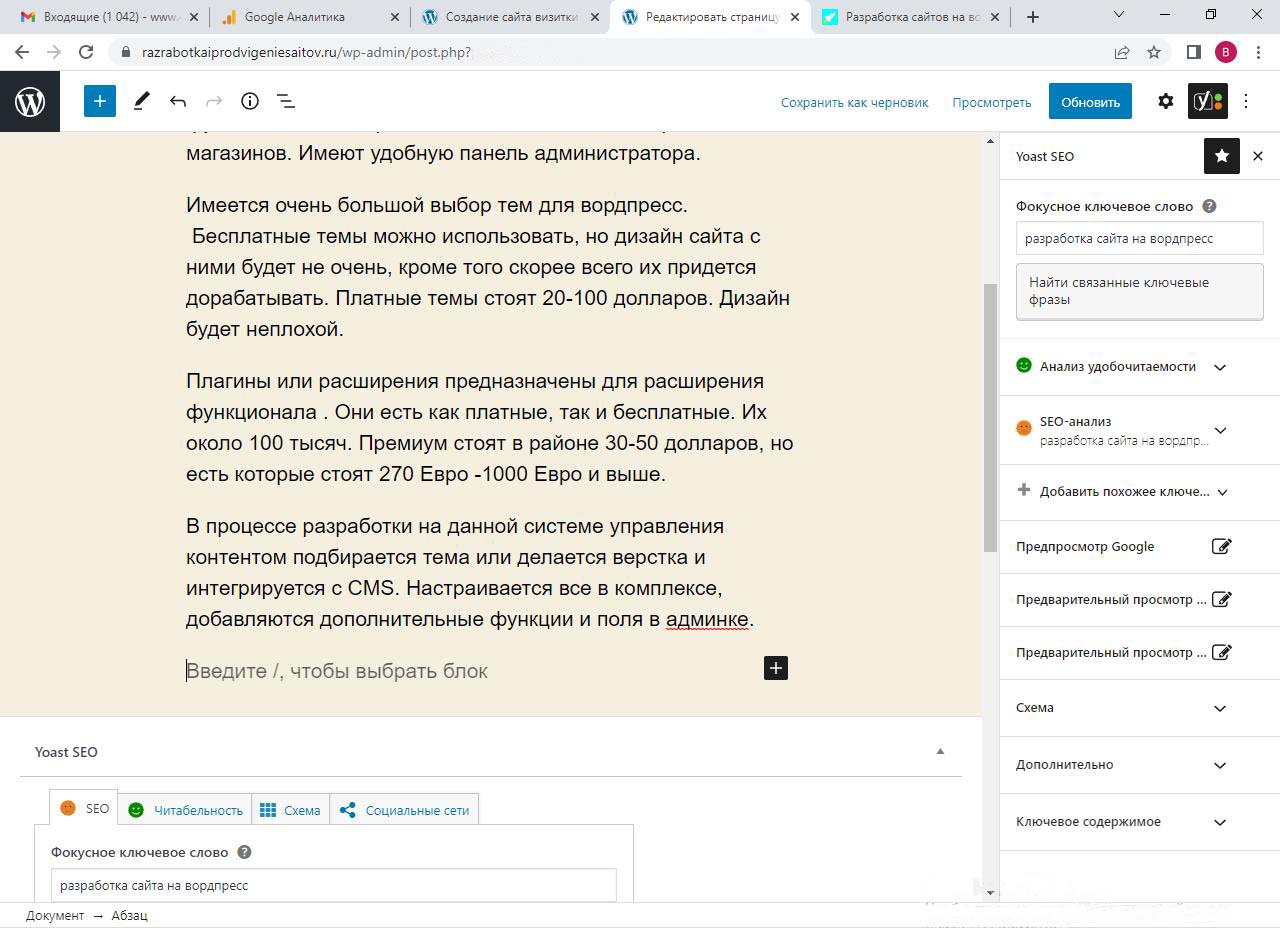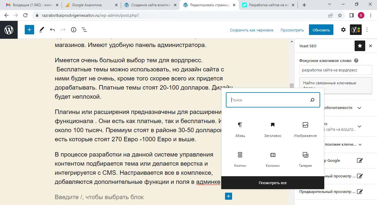 Страницу удобно найти через поиск. Найдем страницу Разработка сайта на вордпресс.