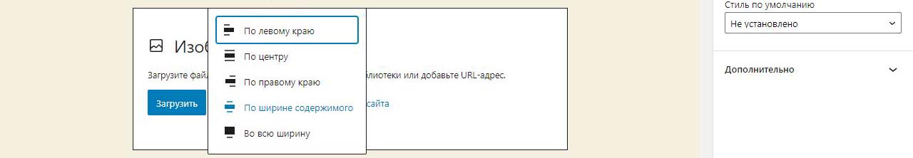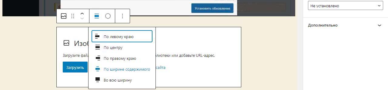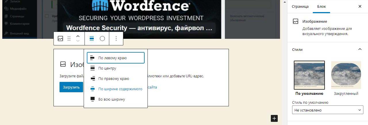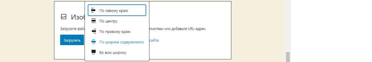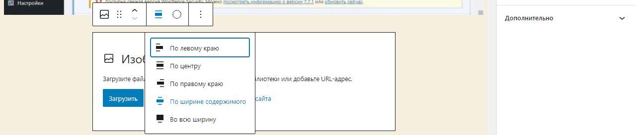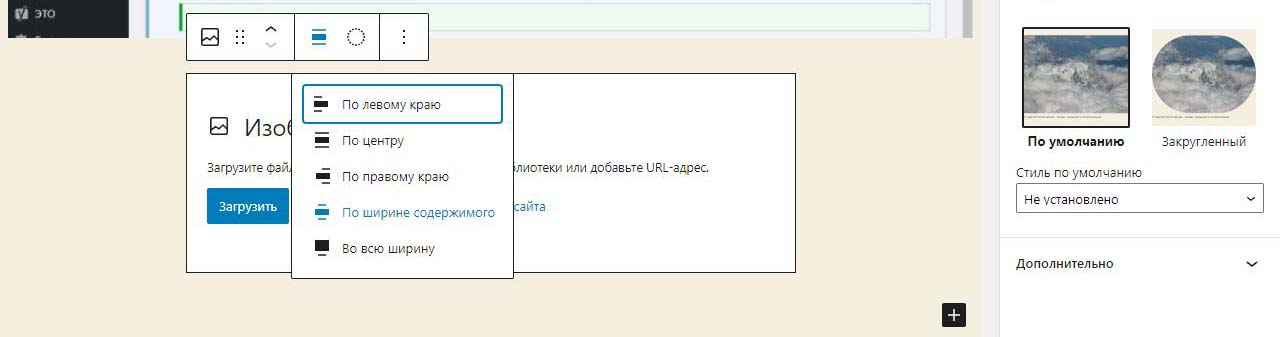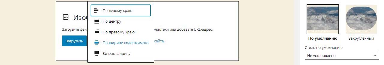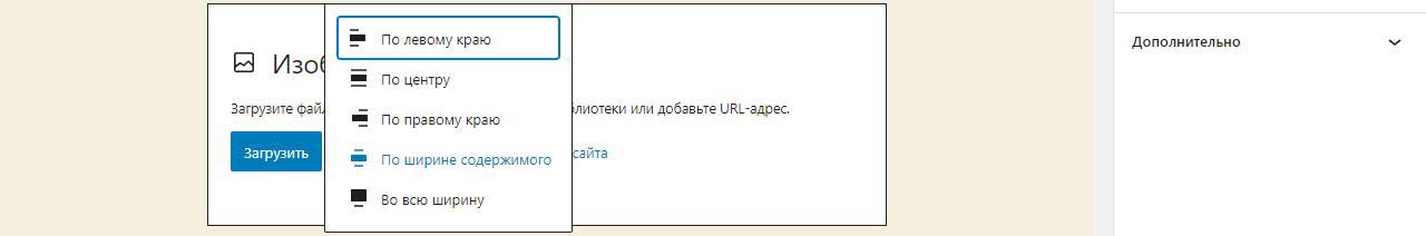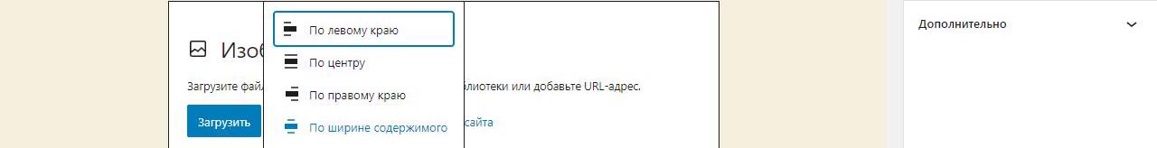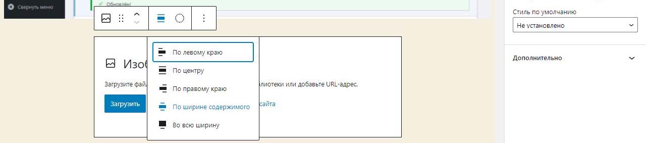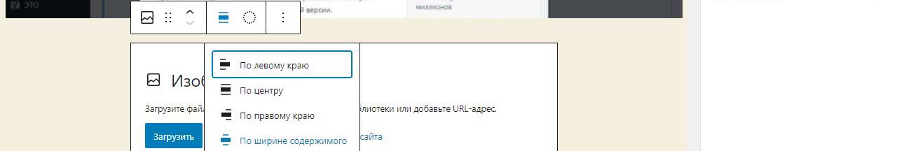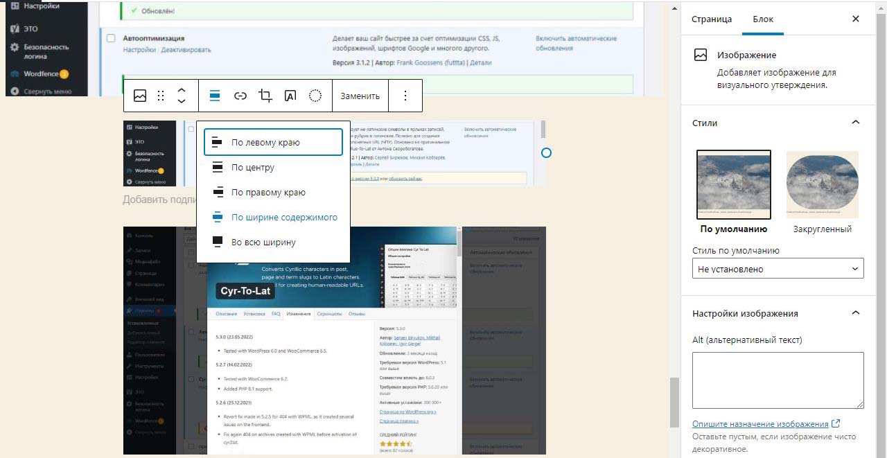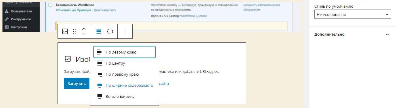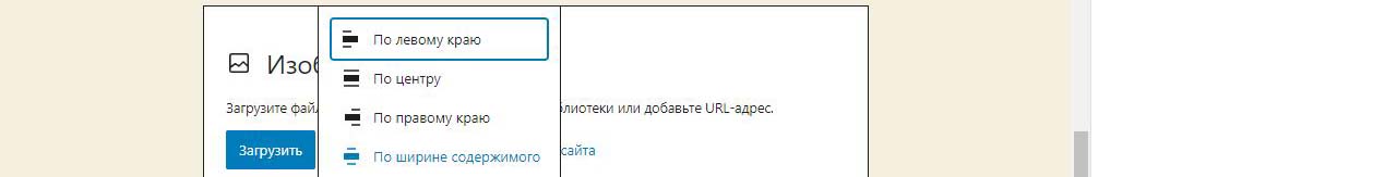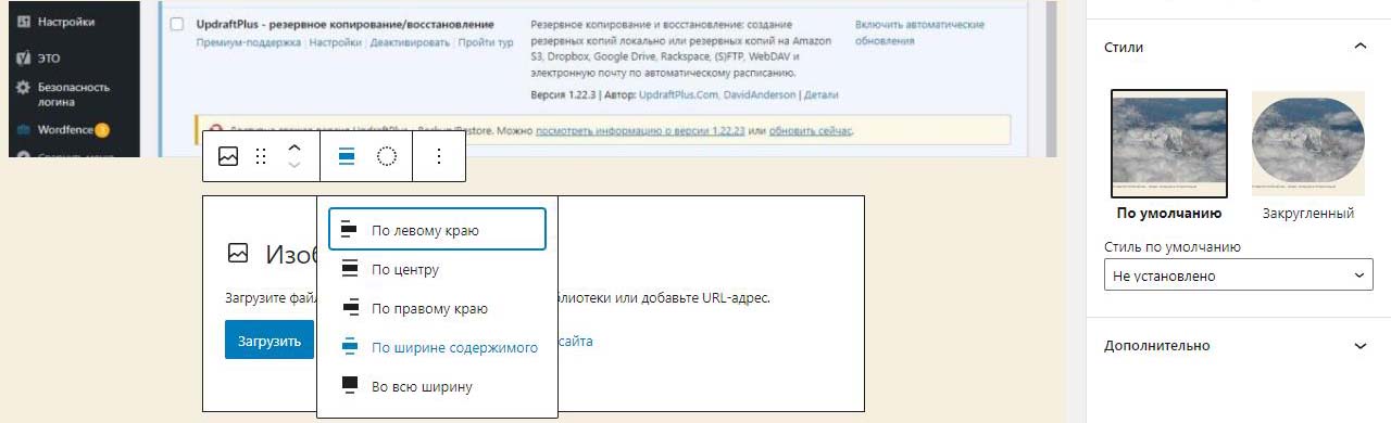 При вставке справа изображения в Wordpress в выпадающем меню можно изменить размер перед загрузкой. По умолчанию все картинки загрузились на половину ширины страницы. Выбираем изменить выравнивание