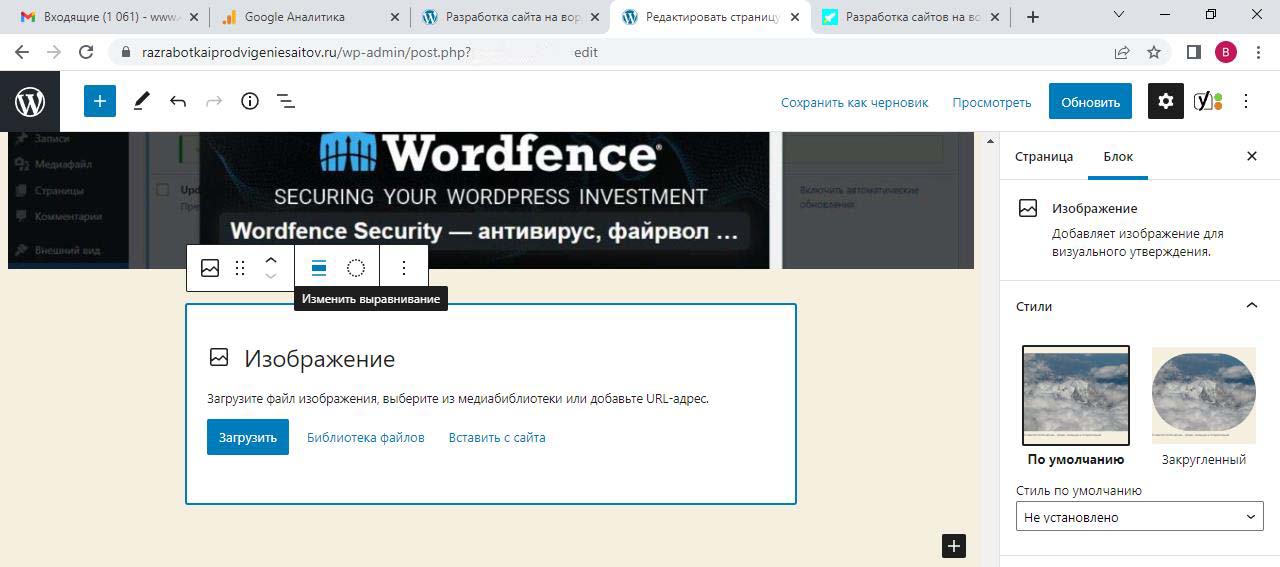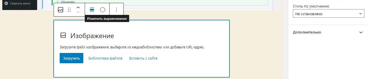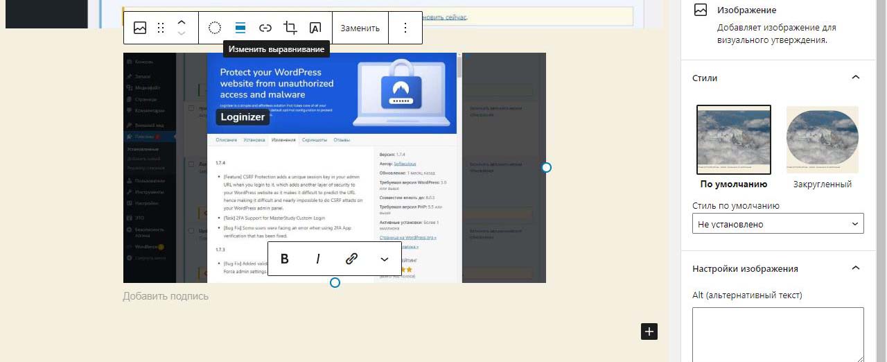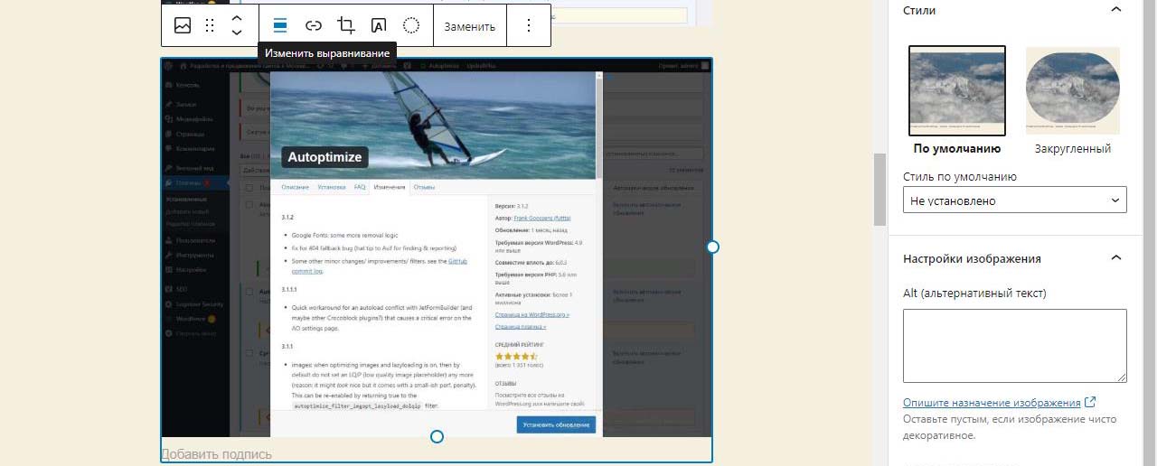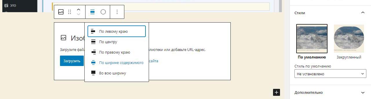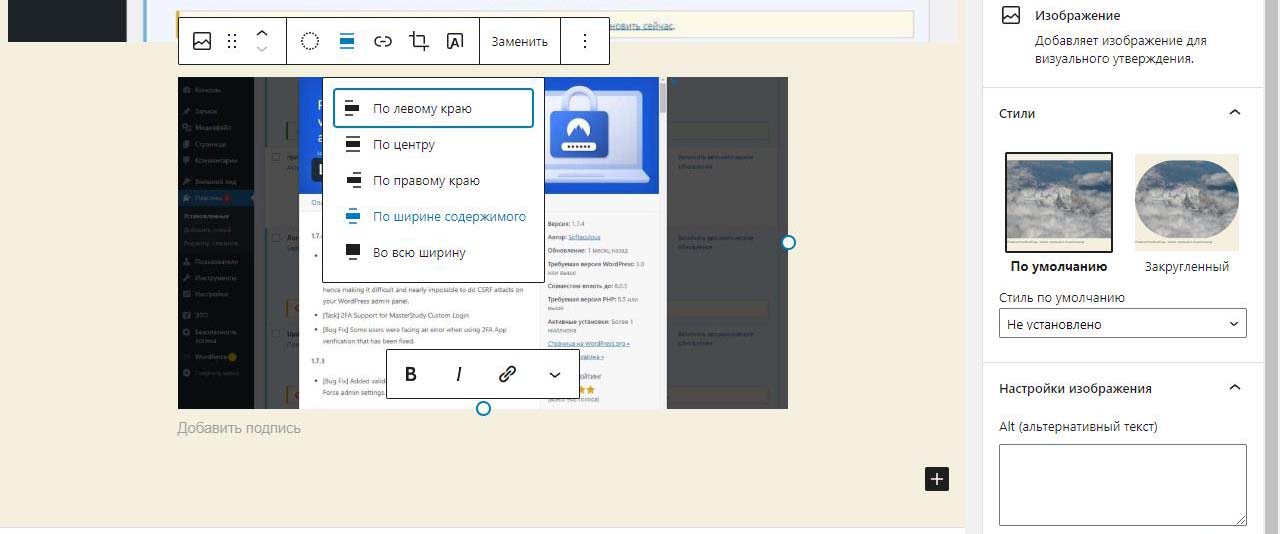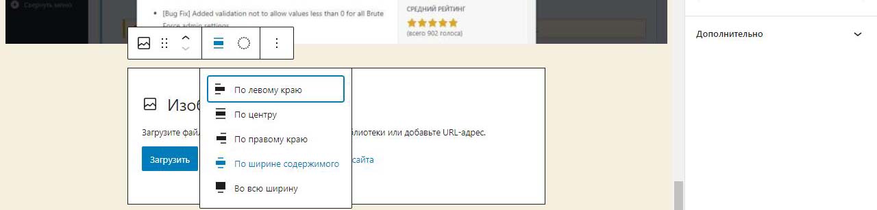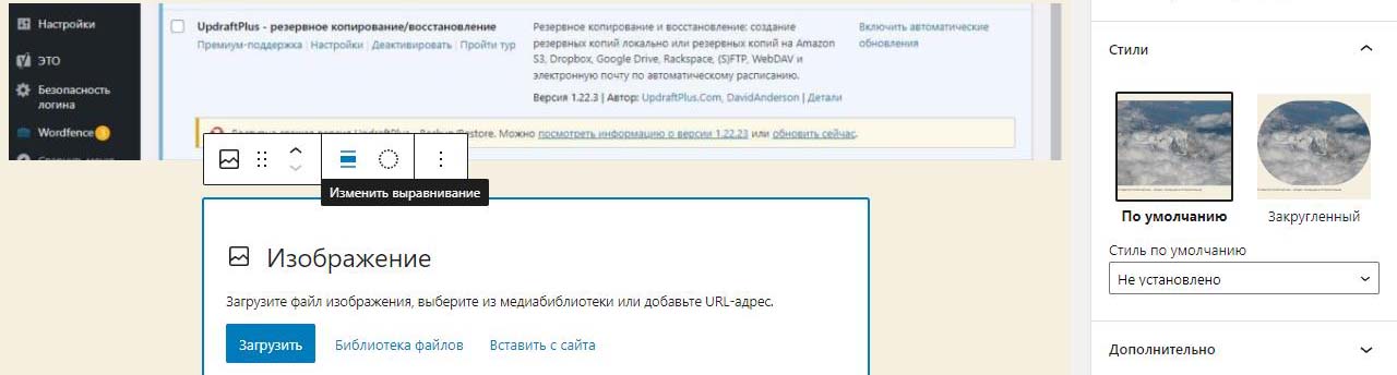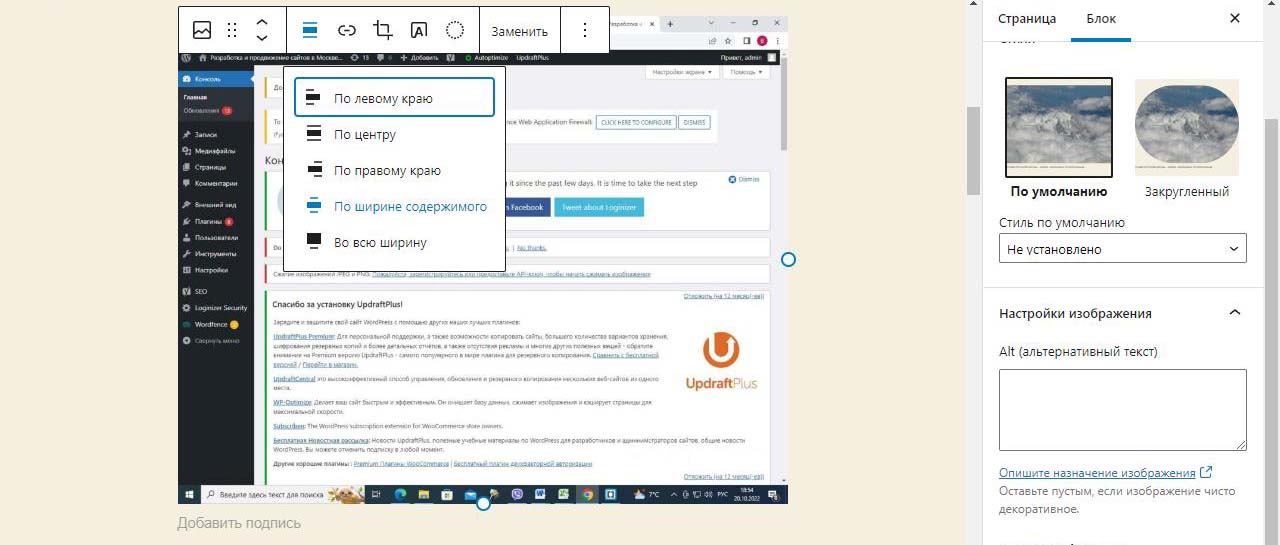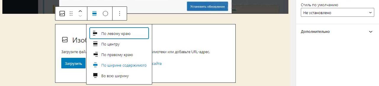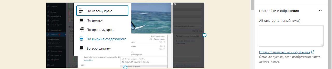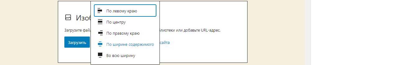 При вставке справа изображения в Wordpress в выпадающем меню можно изменить размер перед загрузкой. По умолчанию все картинки загрузились на половину ширины страницы. Выбираем изменить выравнивание