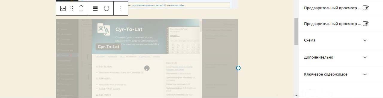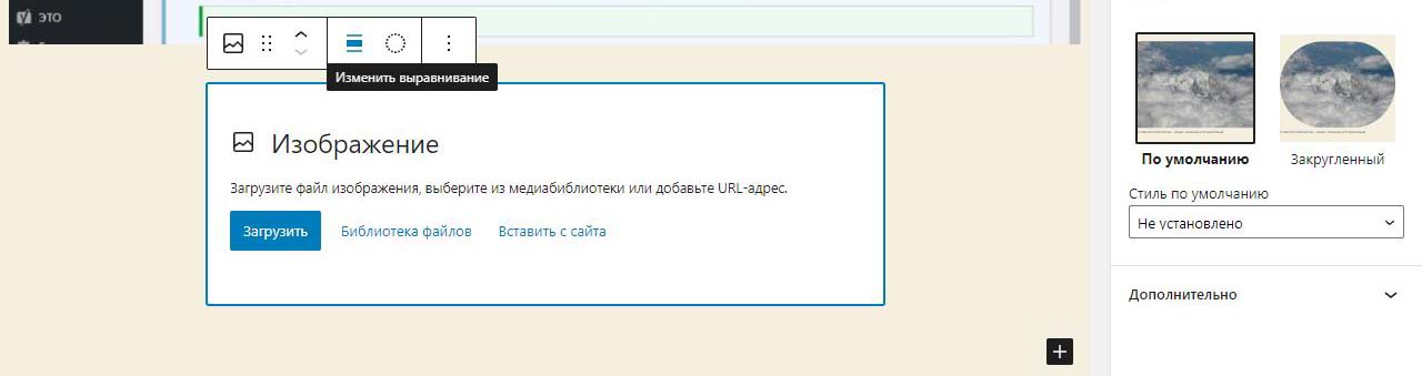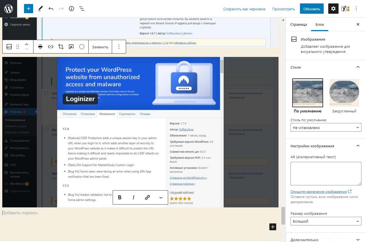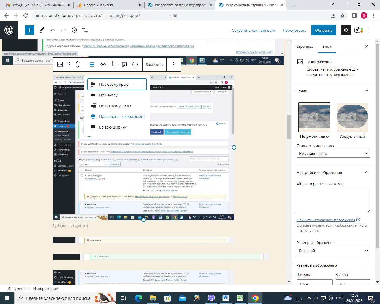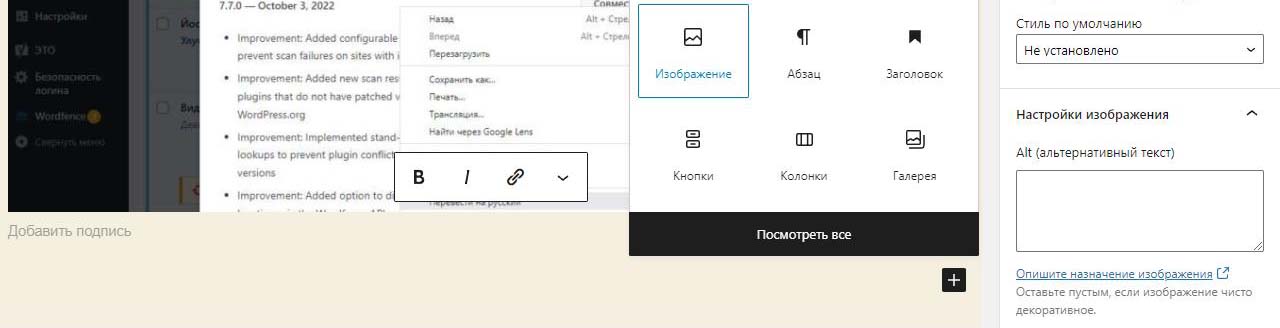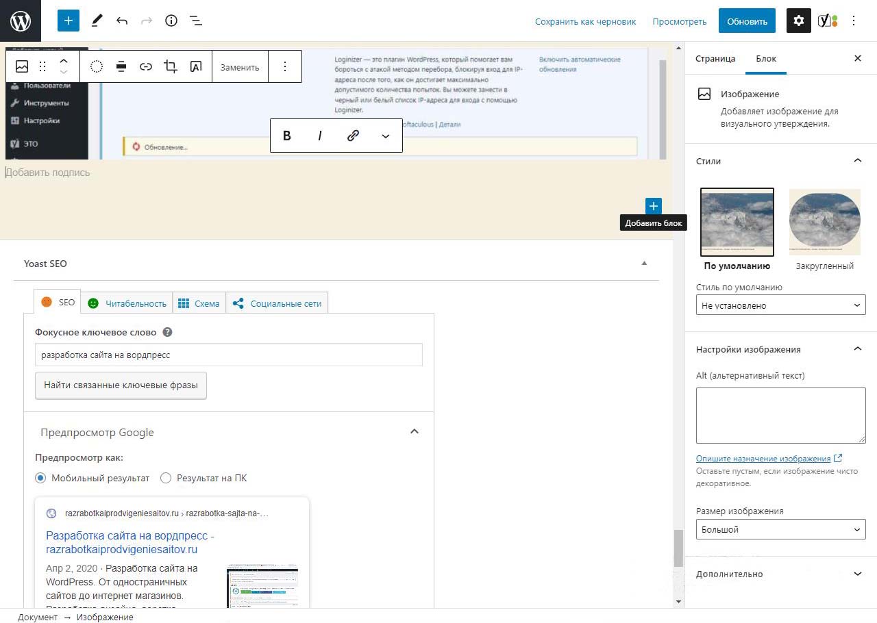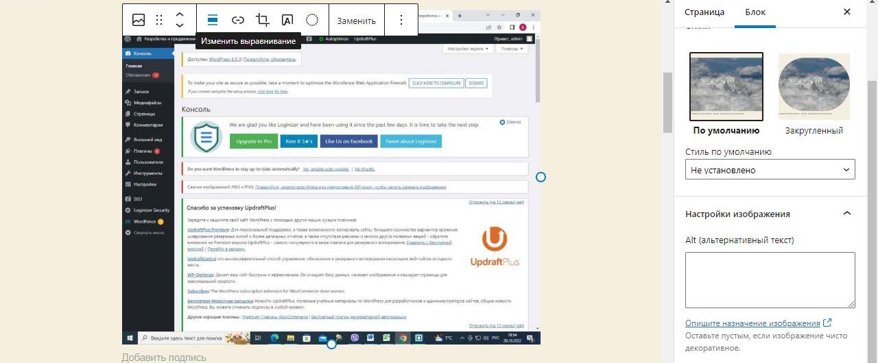 При вставке справа изображения в Wordpress в выпадающем меню можно изменить размер перед загрузкой. По умолчанию все картинки загрузились на половину ширины страницы. Выбираем изменить выравнивание