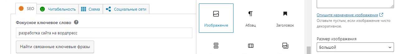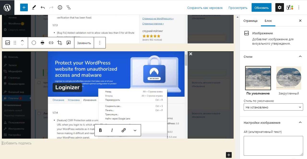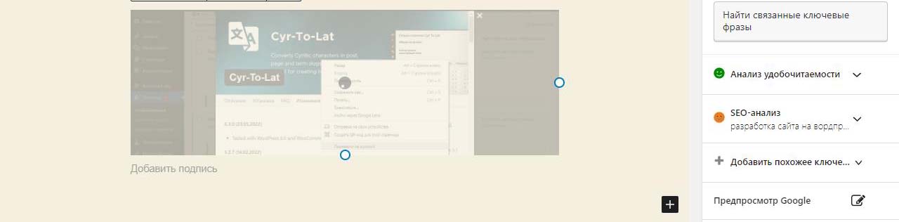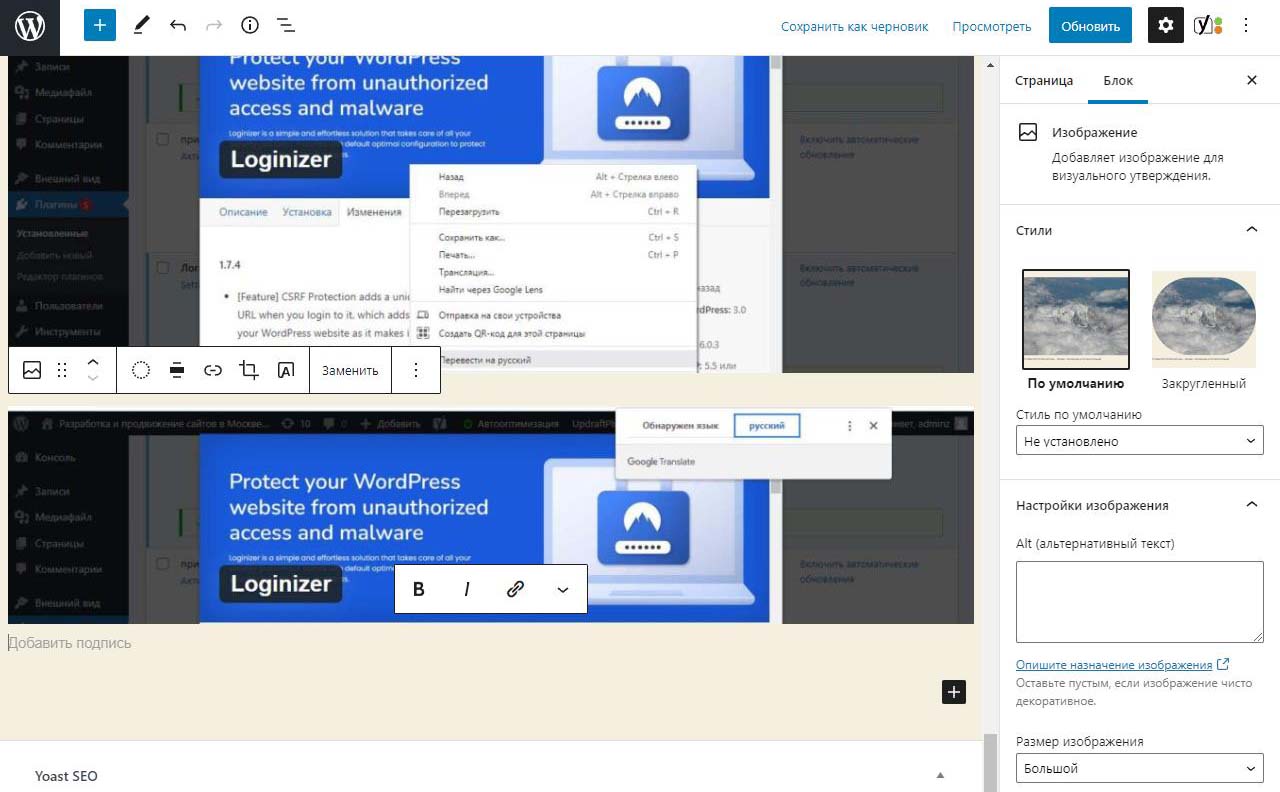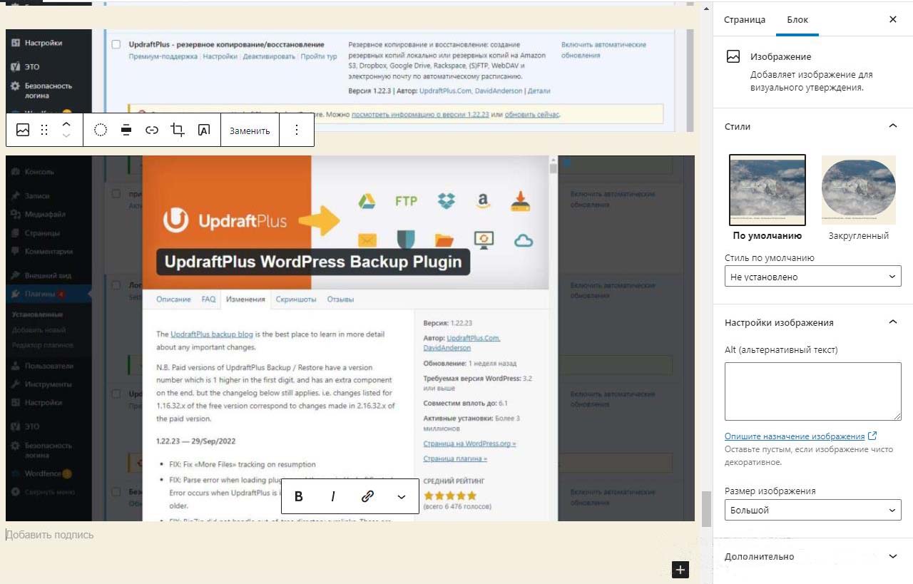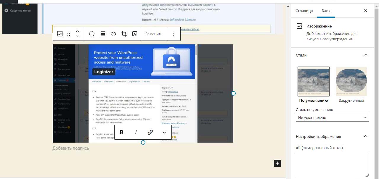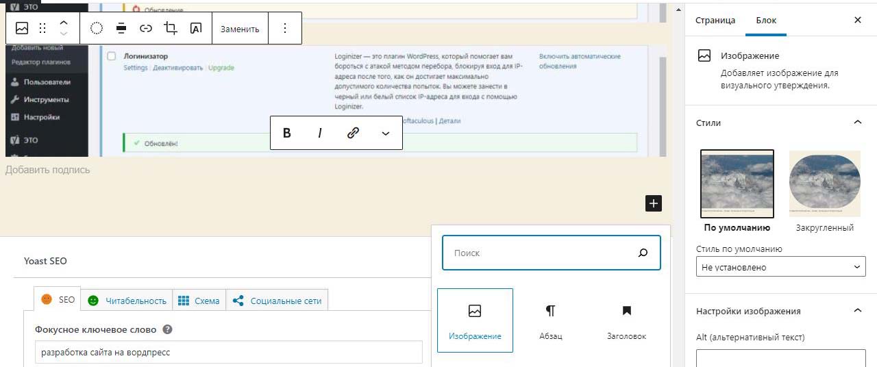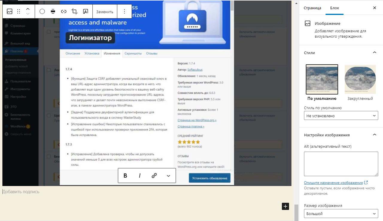 При вставке справа изображения в Wordpress в выпадающем меню можно изменить размер перед загрузкой. По умолчанию все картинки загрузились на половину ширины страницы. Выбираем изменить выравнивание