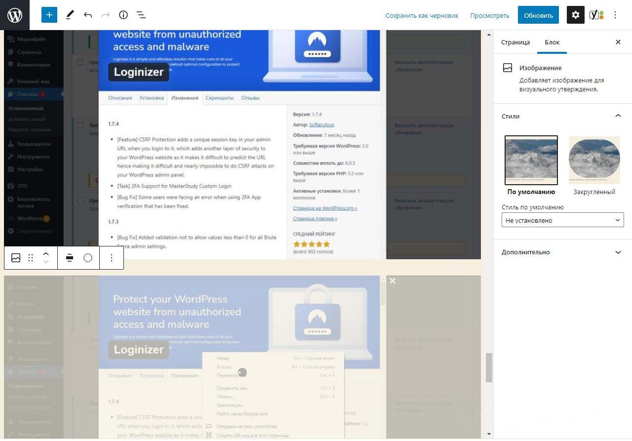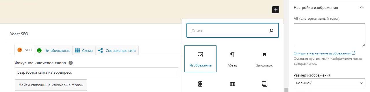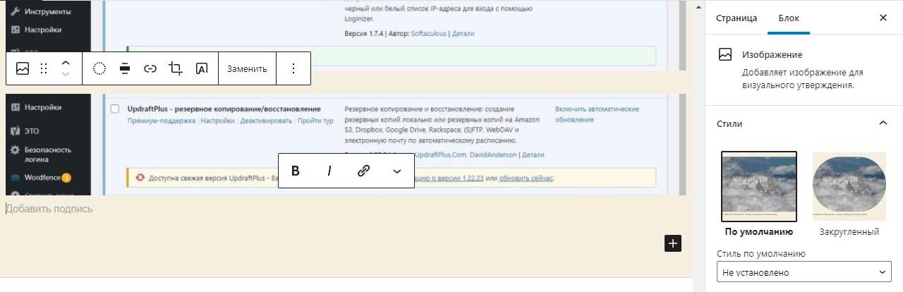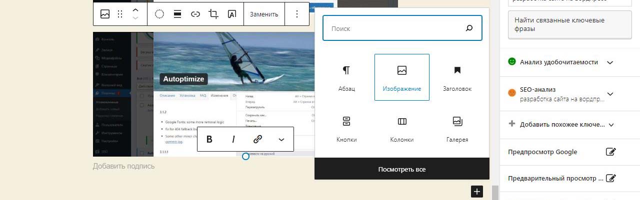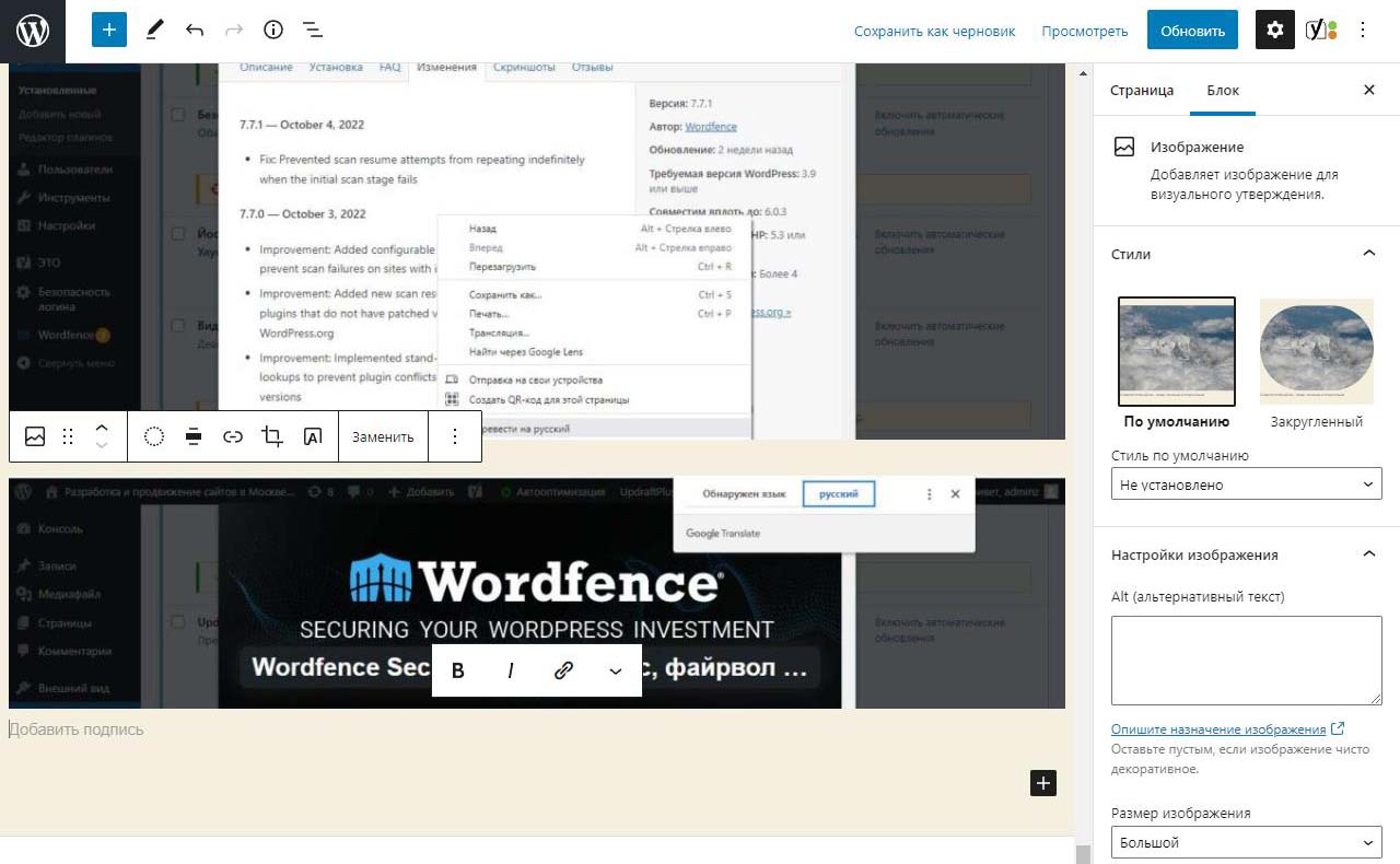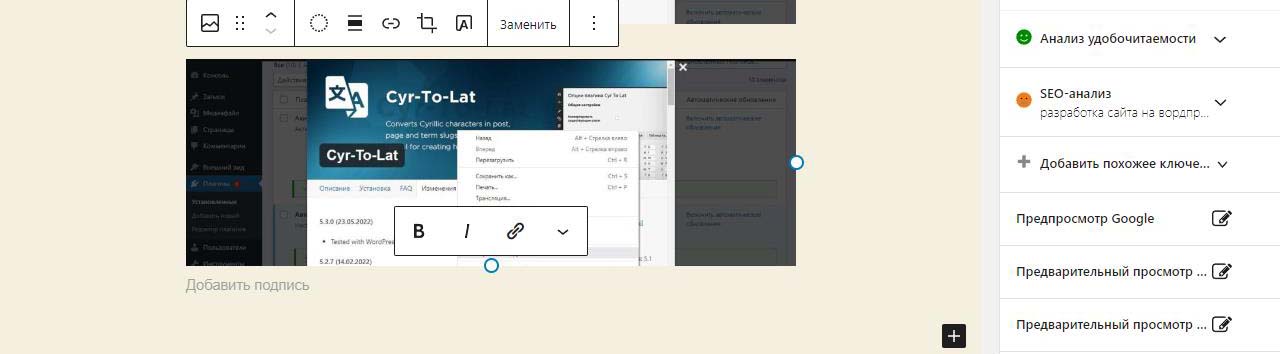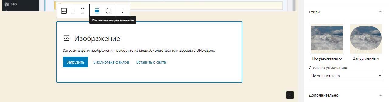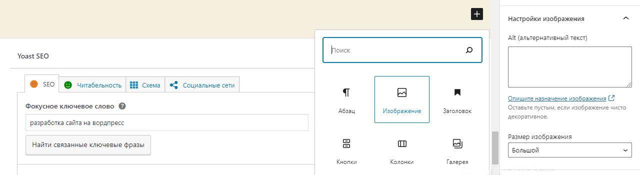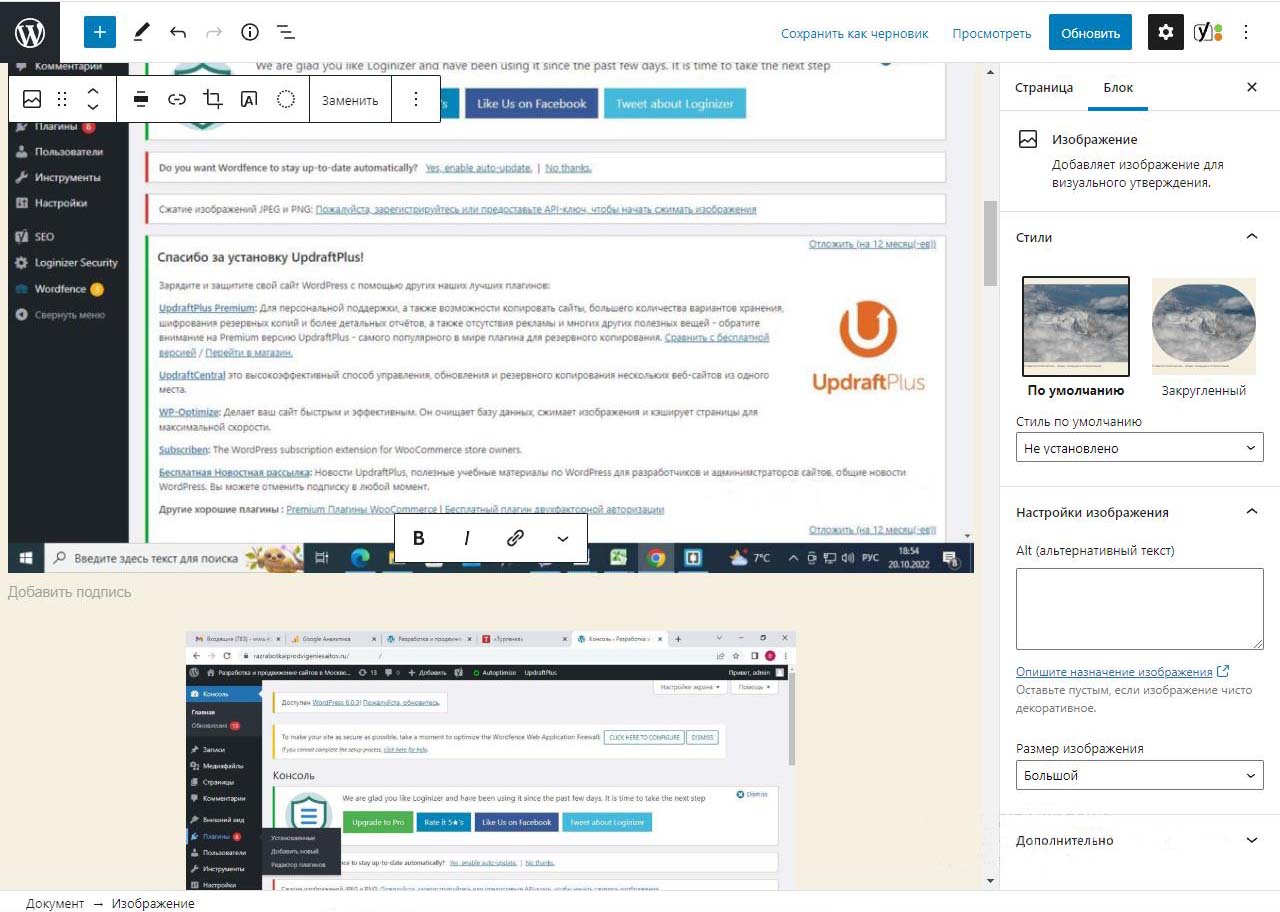 При вставке справа изображения в Wordpress в выпадающем меню можно изменить размер перед загрузкой. По умолчанию все картинки загрузились на половину ширины страницы. Выбираем изменить выравнивание