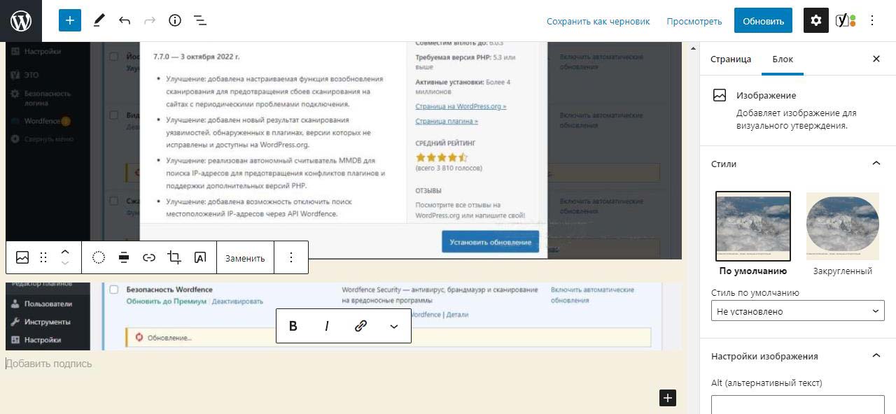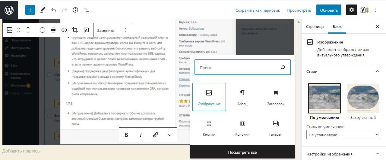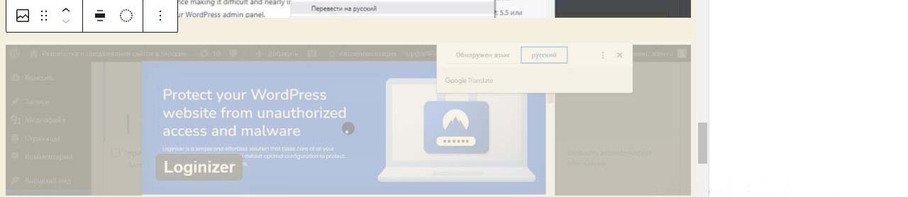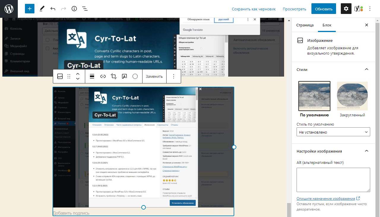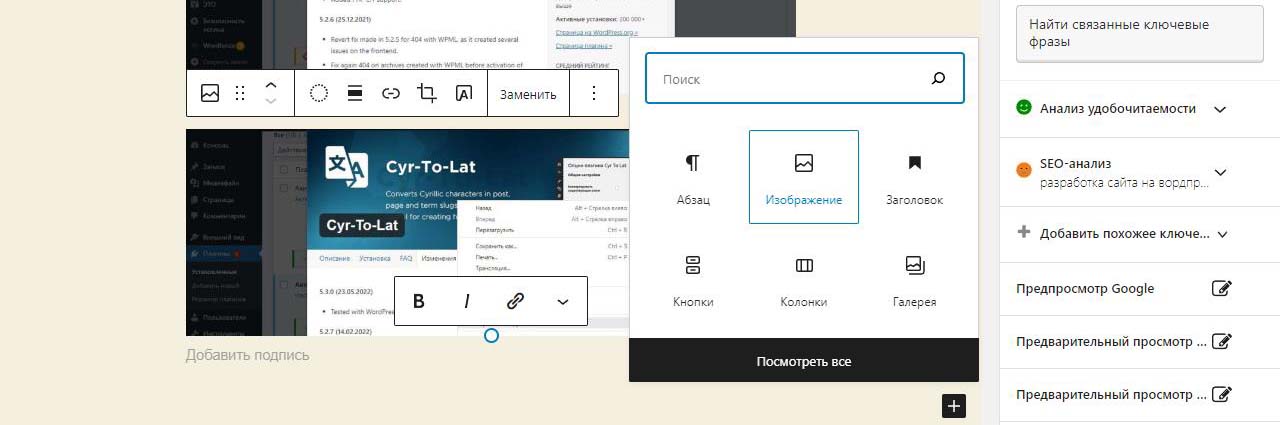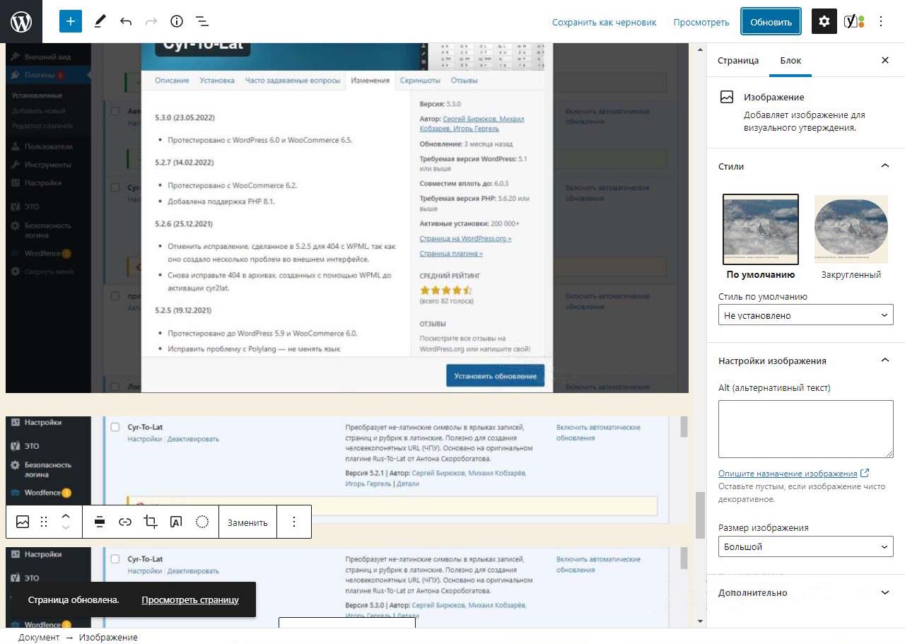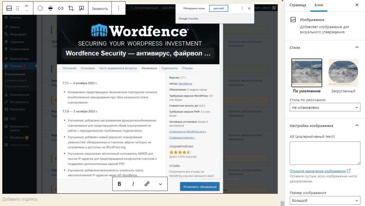 При вставке справа изображения в Wordpress в выпадающем меню можно изменить размер перед загрузкой. По умолчанию все картинки загрузились на половину ширины страницы. Выбираем изменить выравнивание