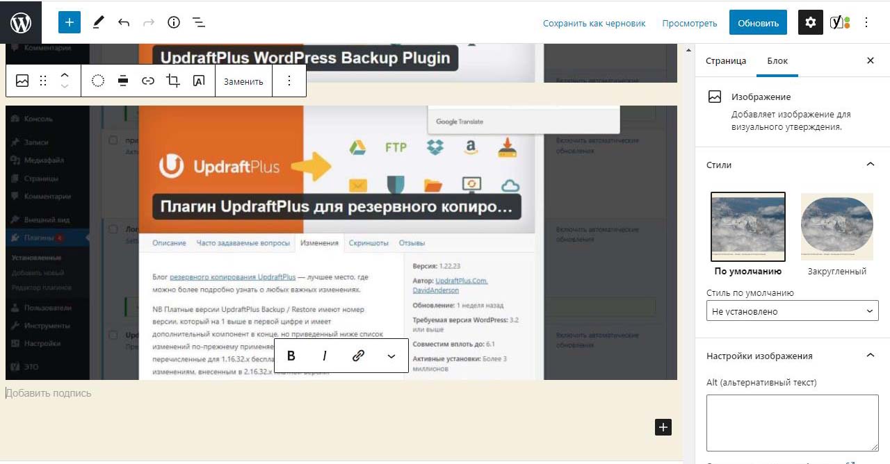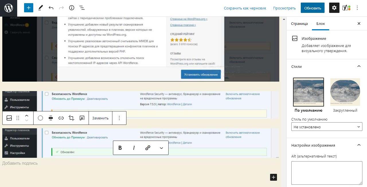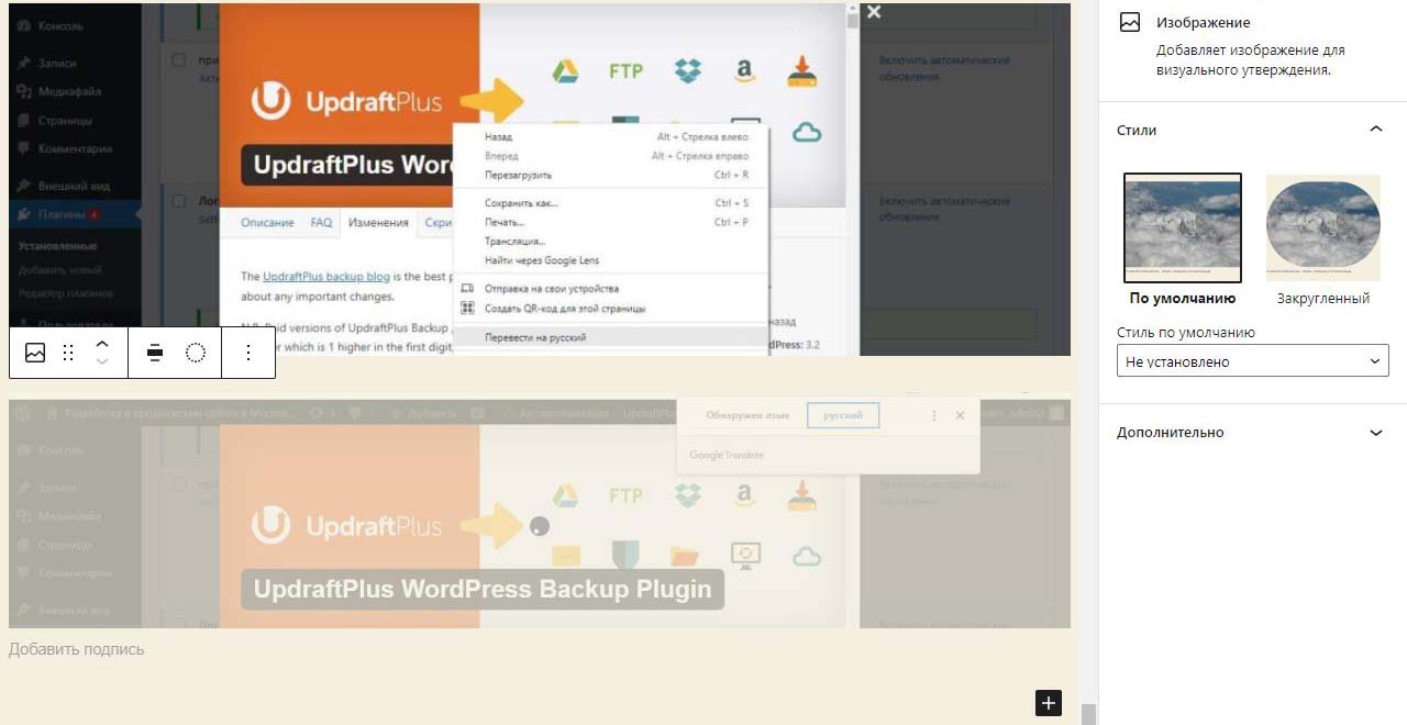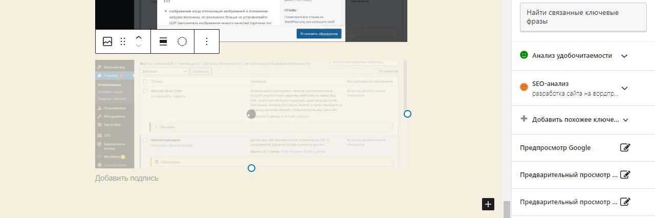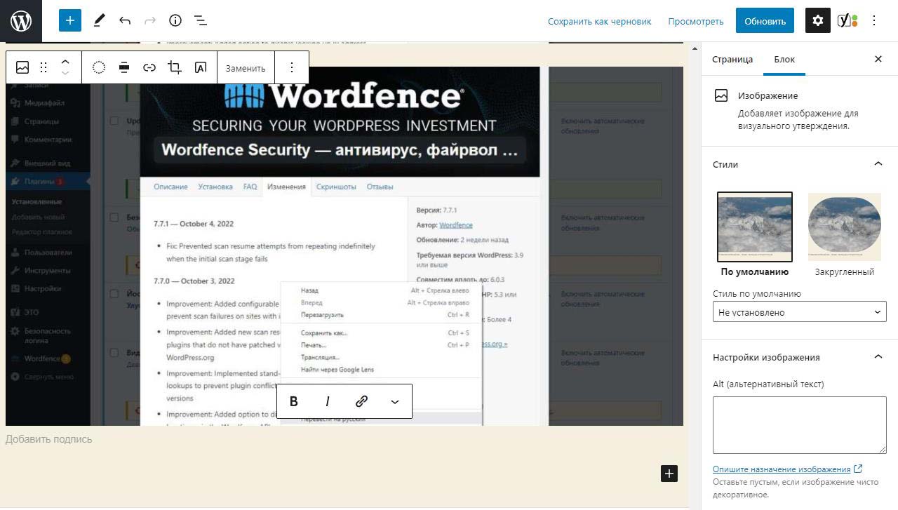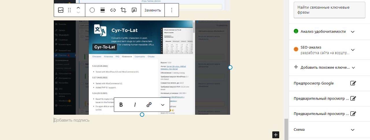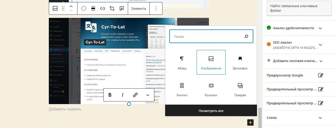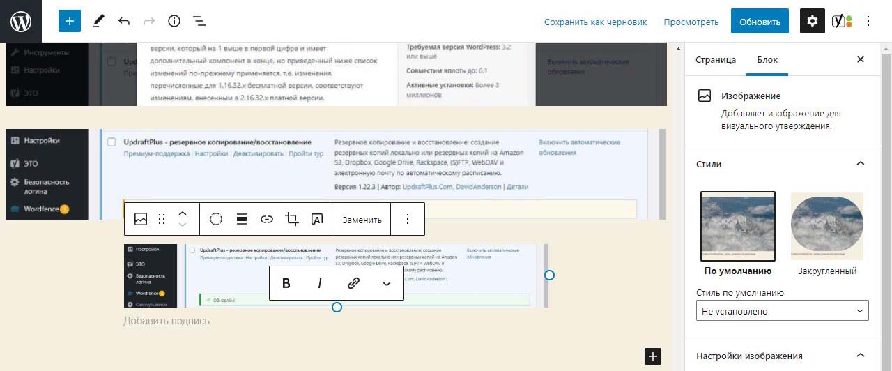 При вставке справа изображения в Wordpress в выпадающем меню можно изменить размер перед загрузкой. По умолчанию все картинки загрузились на половину ширины страницы. Выбираем изменить выравнивание