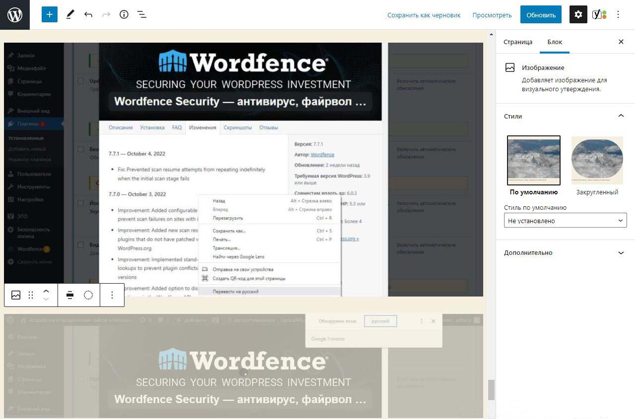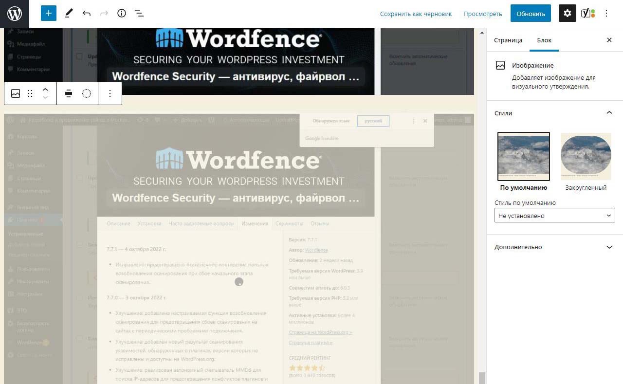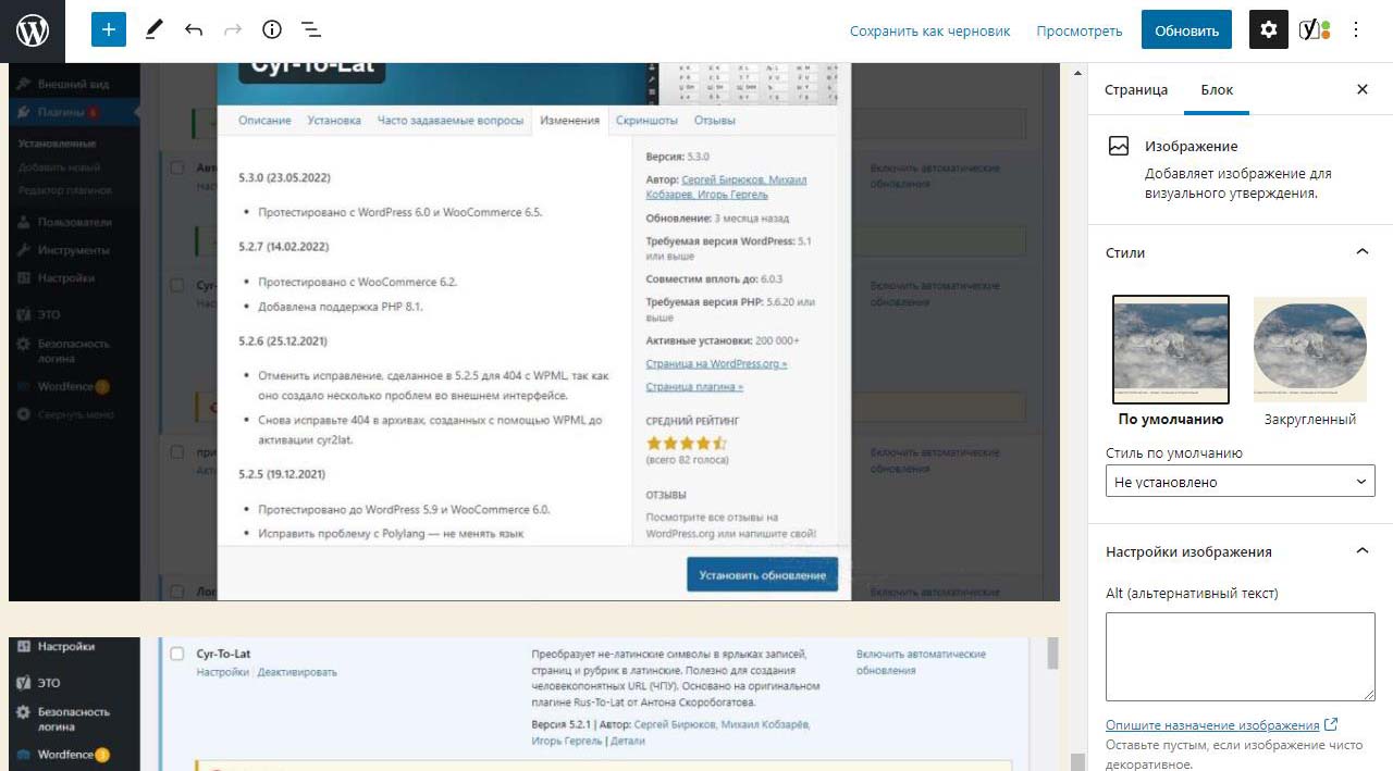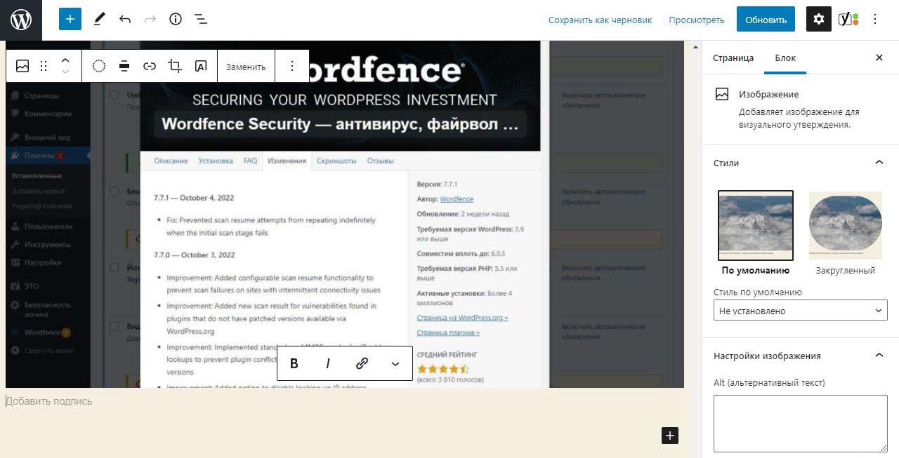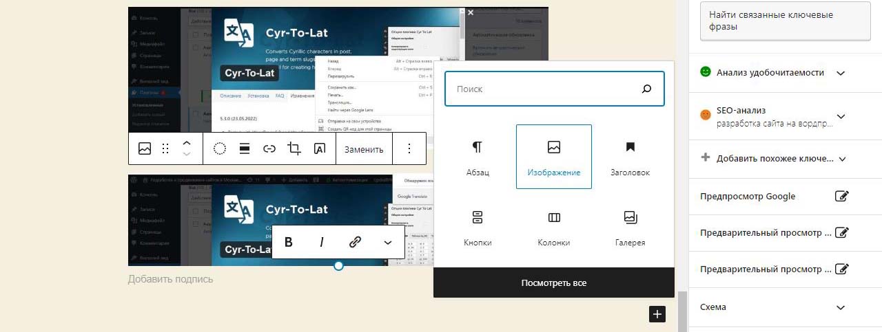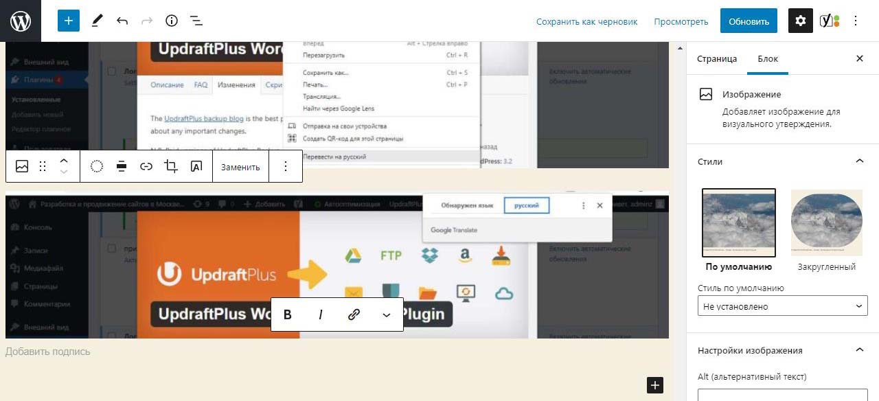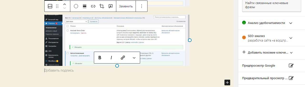 При вставке справа изображения в Wordpress в выпадающем меню можно изменить размер перед загрузкой. По умолчанию все картинки загрузились на половину ширины страницы. Выбираем изменить выравнивание