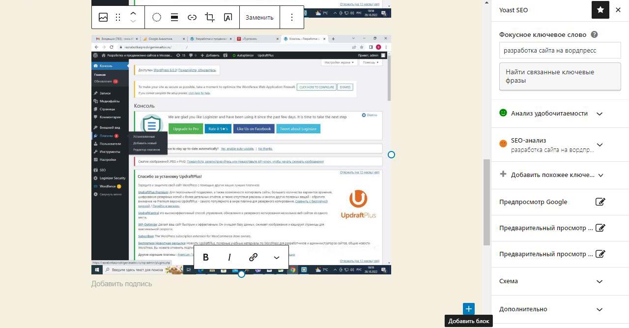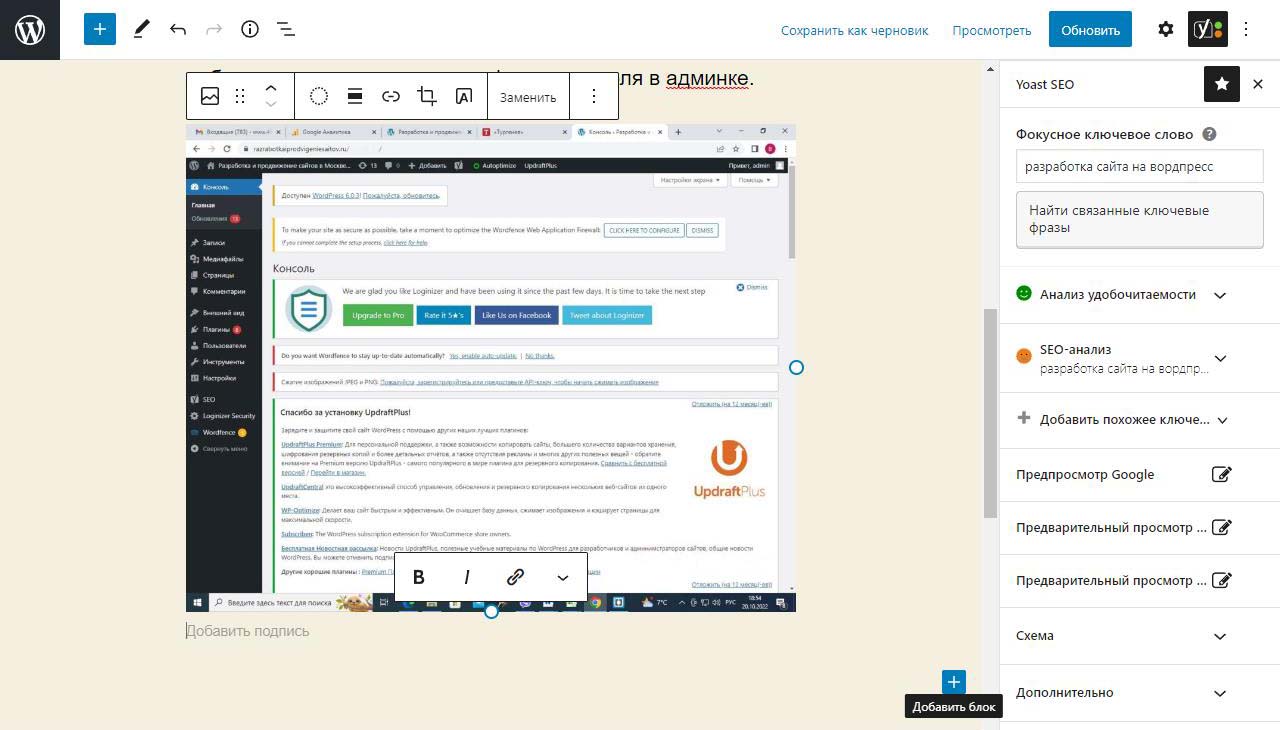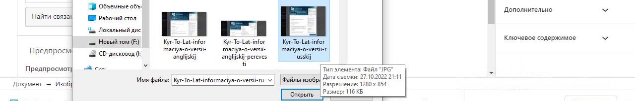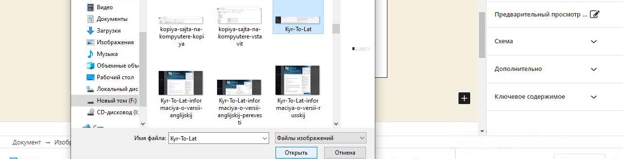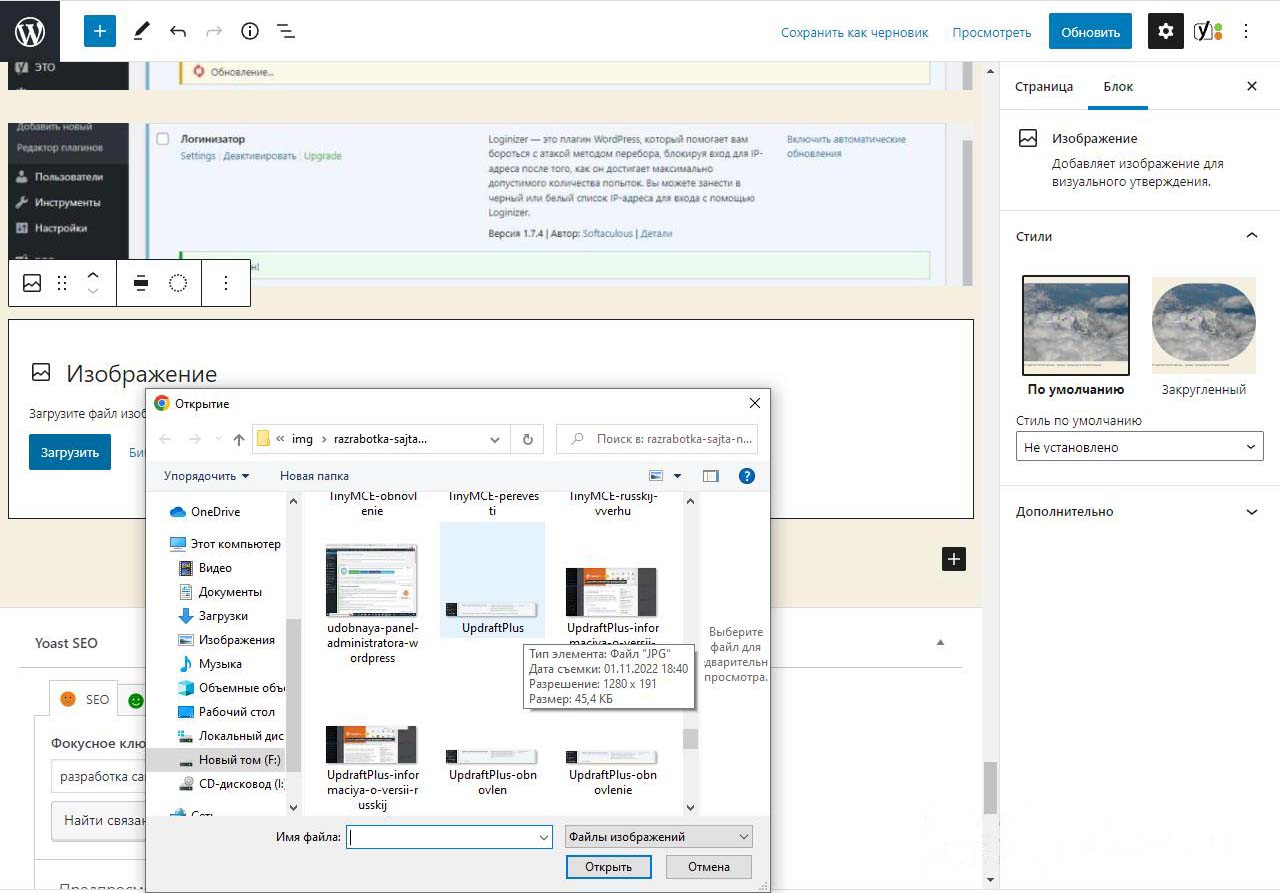 Нажимаем внизу мышкой где написано введите чтобы выбрать блок. Выбираем изображение. Откроется выпадающая панель по ширине равная размеру фото которое будет загружаться с кнопкой загрузить. Нажимаем. Откроется обзор файлов и папок на компьютере. Находим паку с файлами изображений. Находим фото. Есть полоса прокрутки. Левым щелчком мыши нажимаем на фото и выбираем открыть в правом нижнем углу. Файл начнет загружаться на хостинг в автоматически сгенерированную системой папку на хостинге. В админке увидим процесс загрузки. Через пару секунд картинка загрузится и на странице в панели администратора будет показываться в полную яркость.