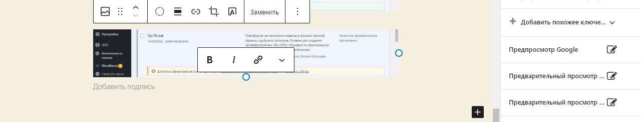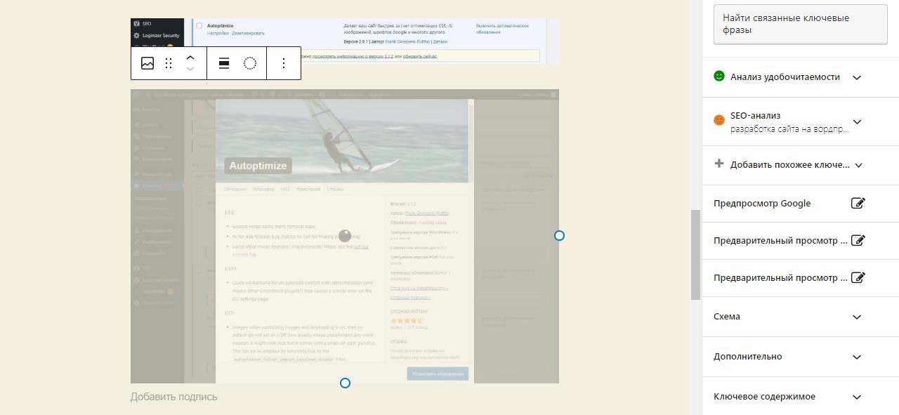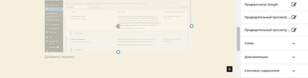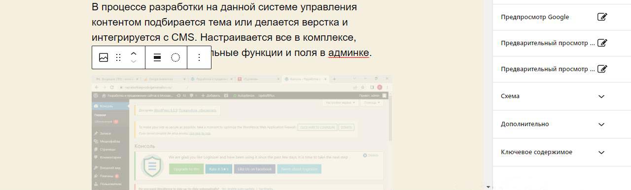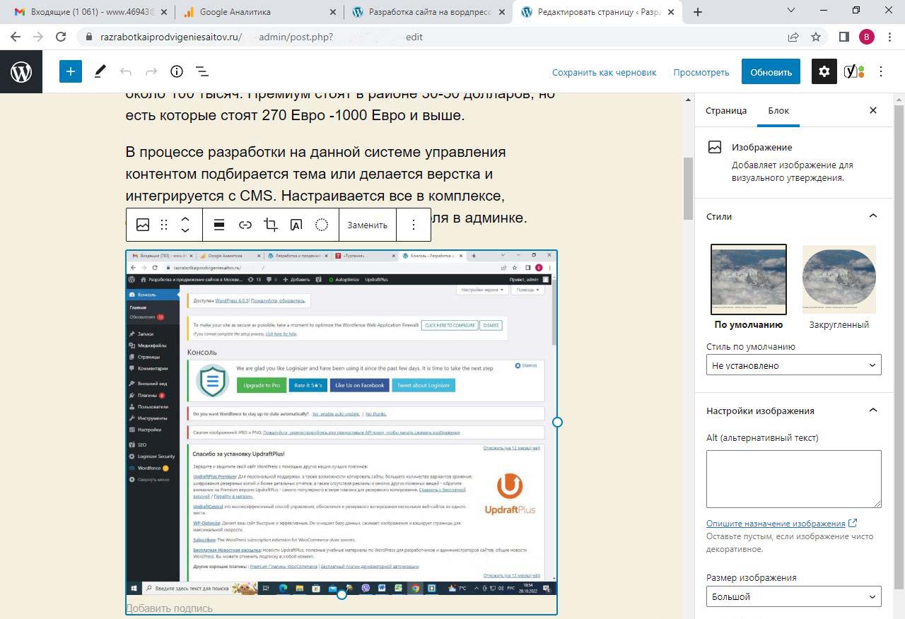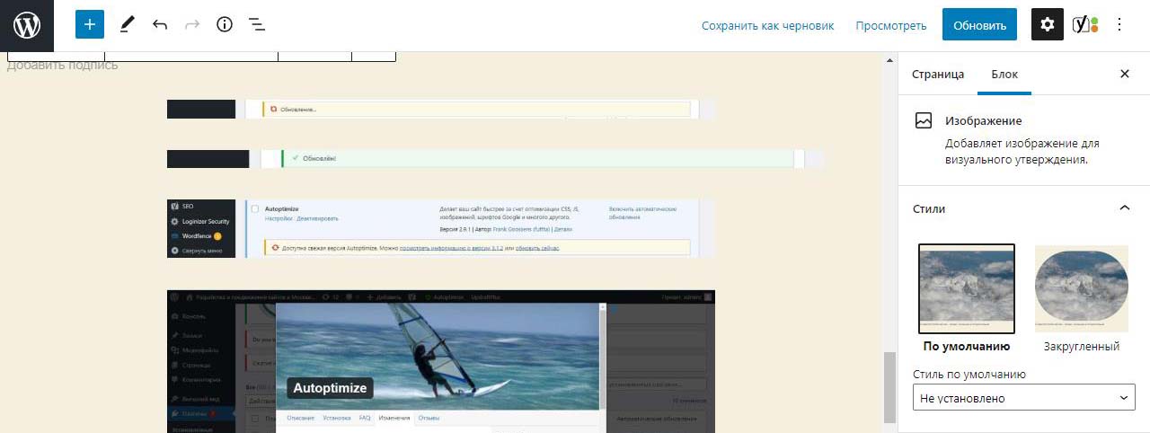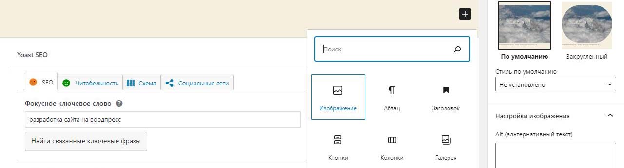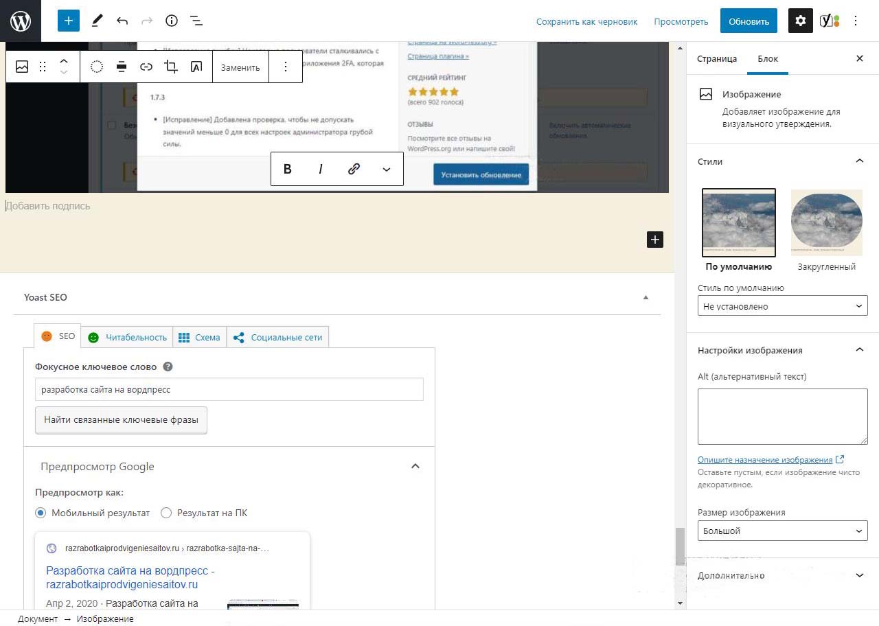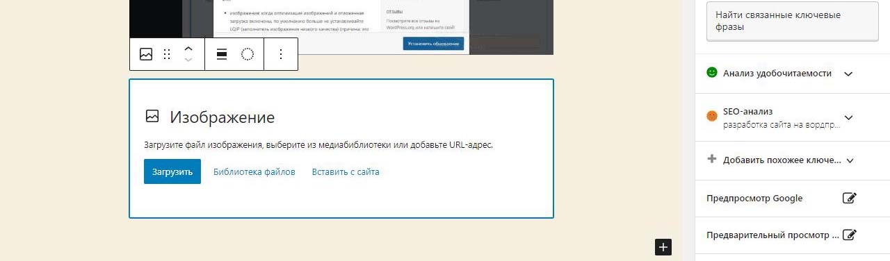 Картинка начнет вставляться в предпросмотр будущей страницы. Во время загрузки видна тускло и крутится колесико.